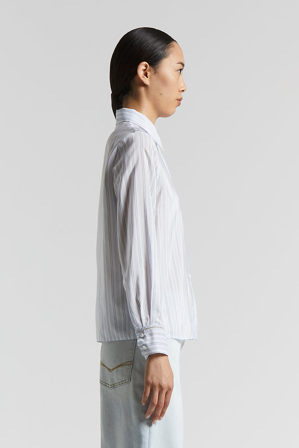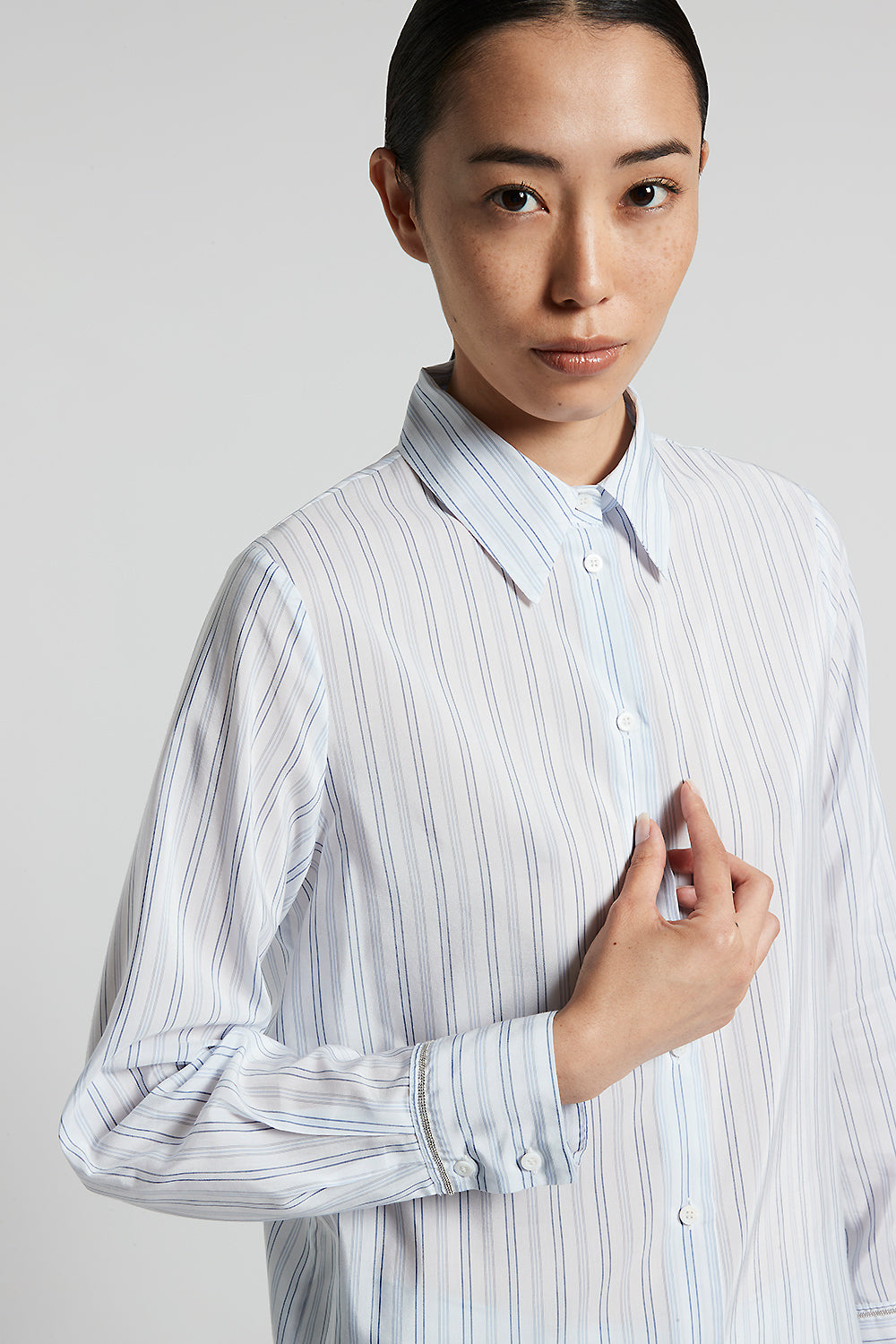 This cotton-silk habotai shirt is characterised by an elegant multi-striped pattern. The light and flowing fabric offers a luxurious feel.The collar and long dropped sleeves guarantee a modern fit.Th…