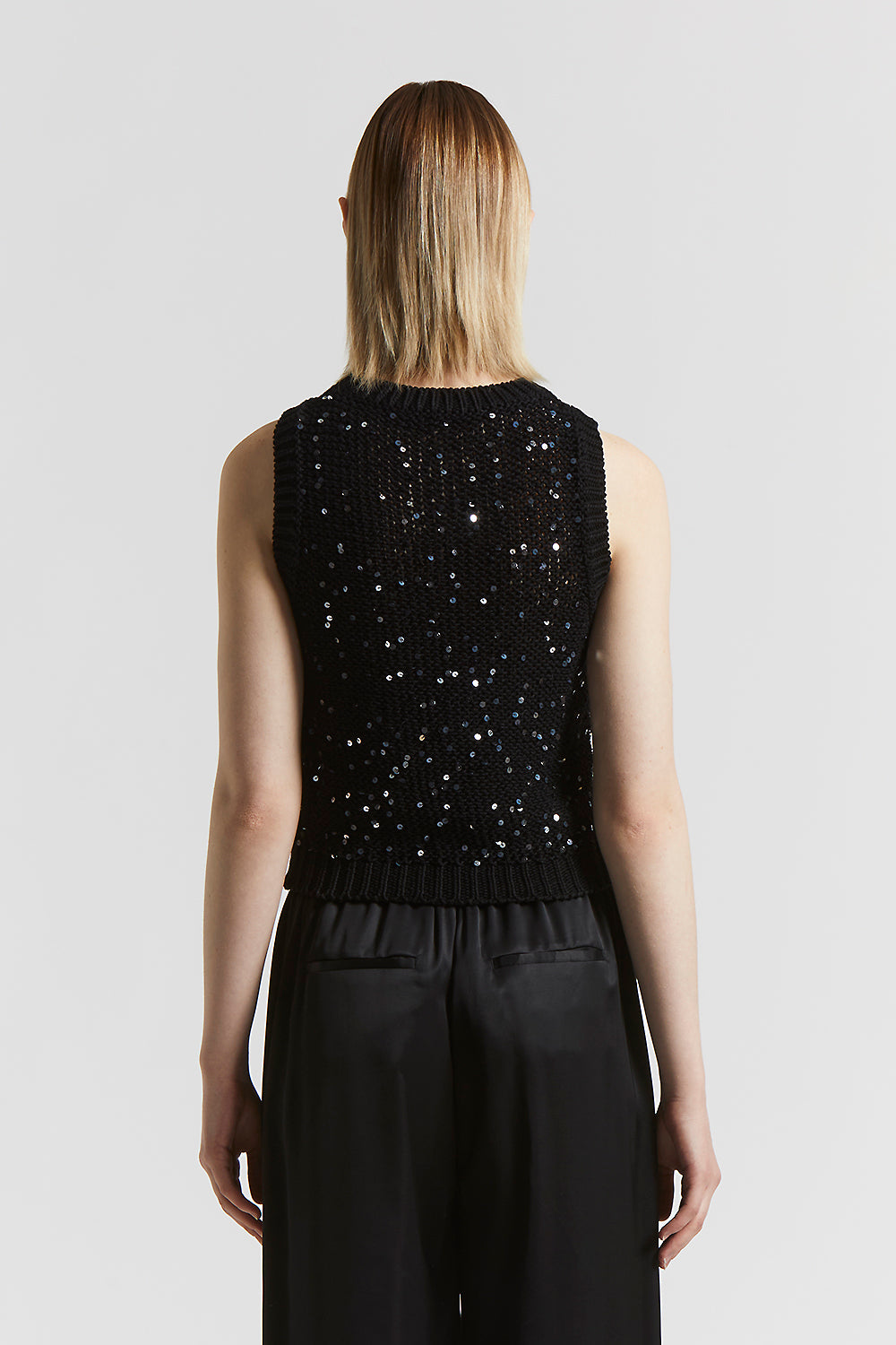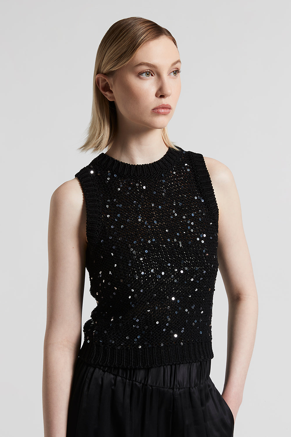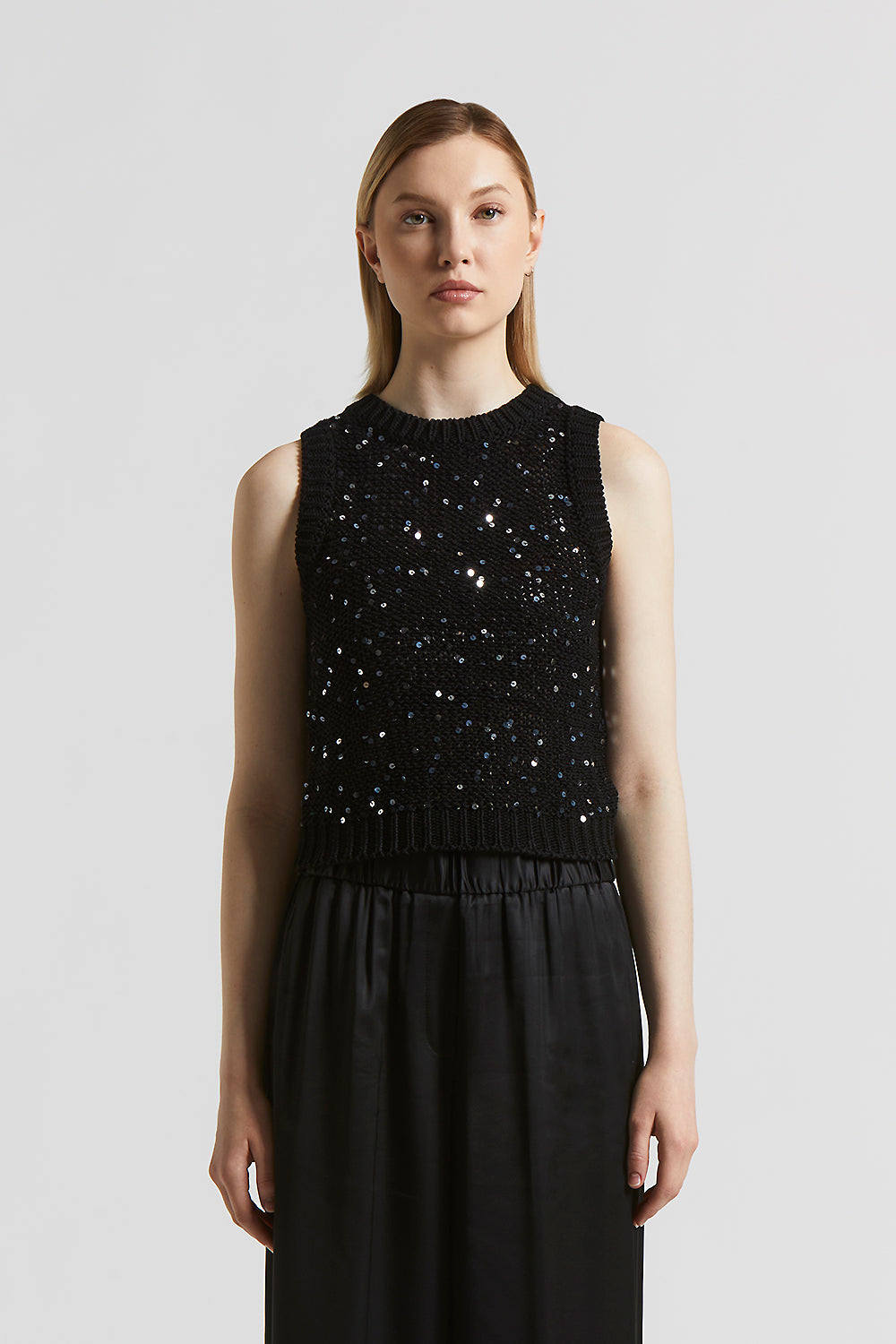 The cropped fit enhances the figure with a modern cut, while the cotton ribbon with maxi sequins captures the light with every movement.