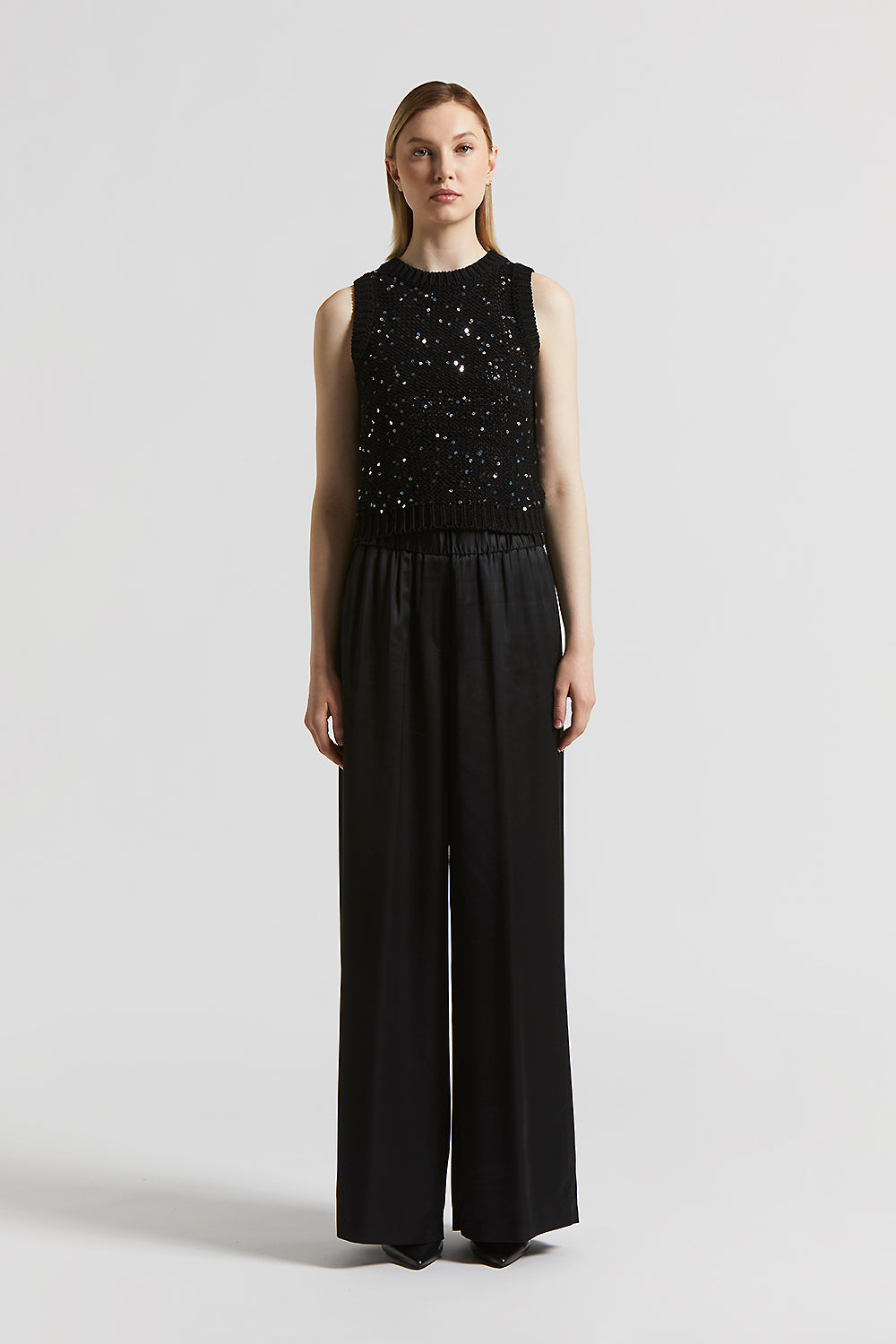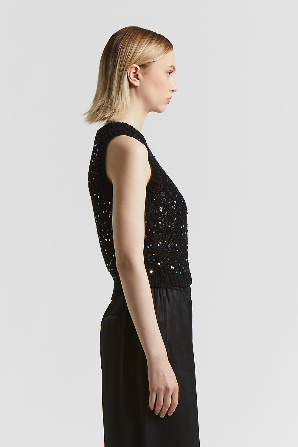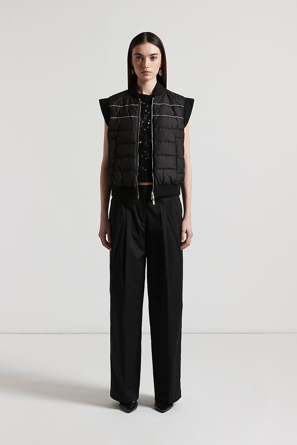 The cropped fit enhances the figure with a modern cut, while the cotton ribbon with maxi sequins captures the light with every movement.