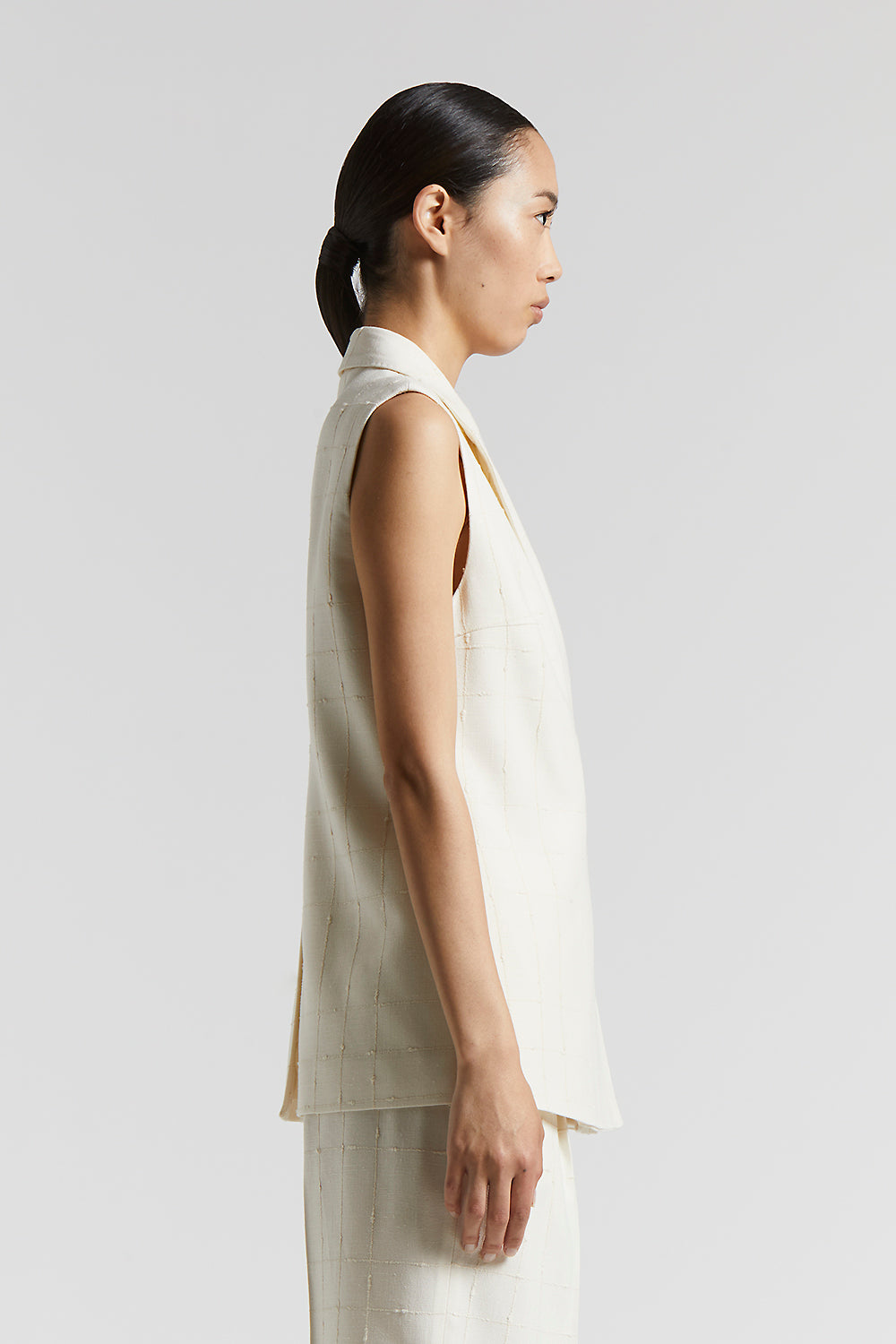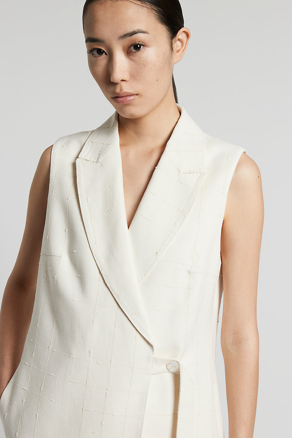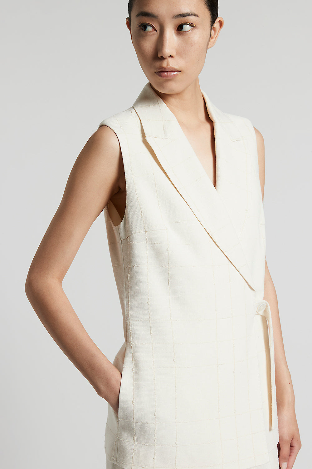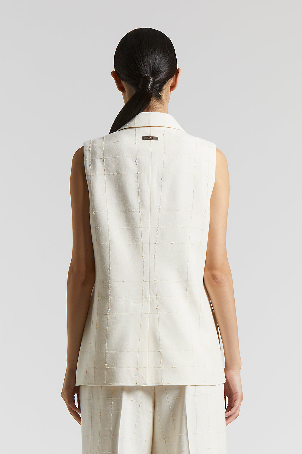 Made in stuoia weave with same colour bouclé windowpane motif, this double-breasted waistcoat with viscose lining is distinguished by its modern design and 3D texture to the touch.