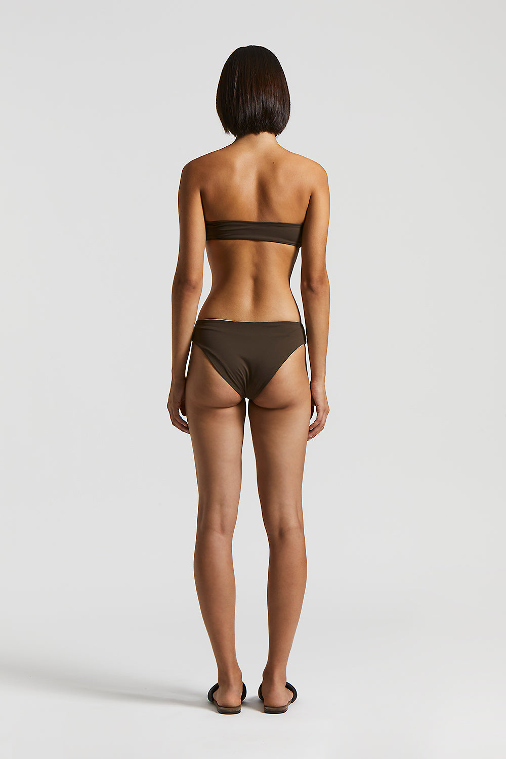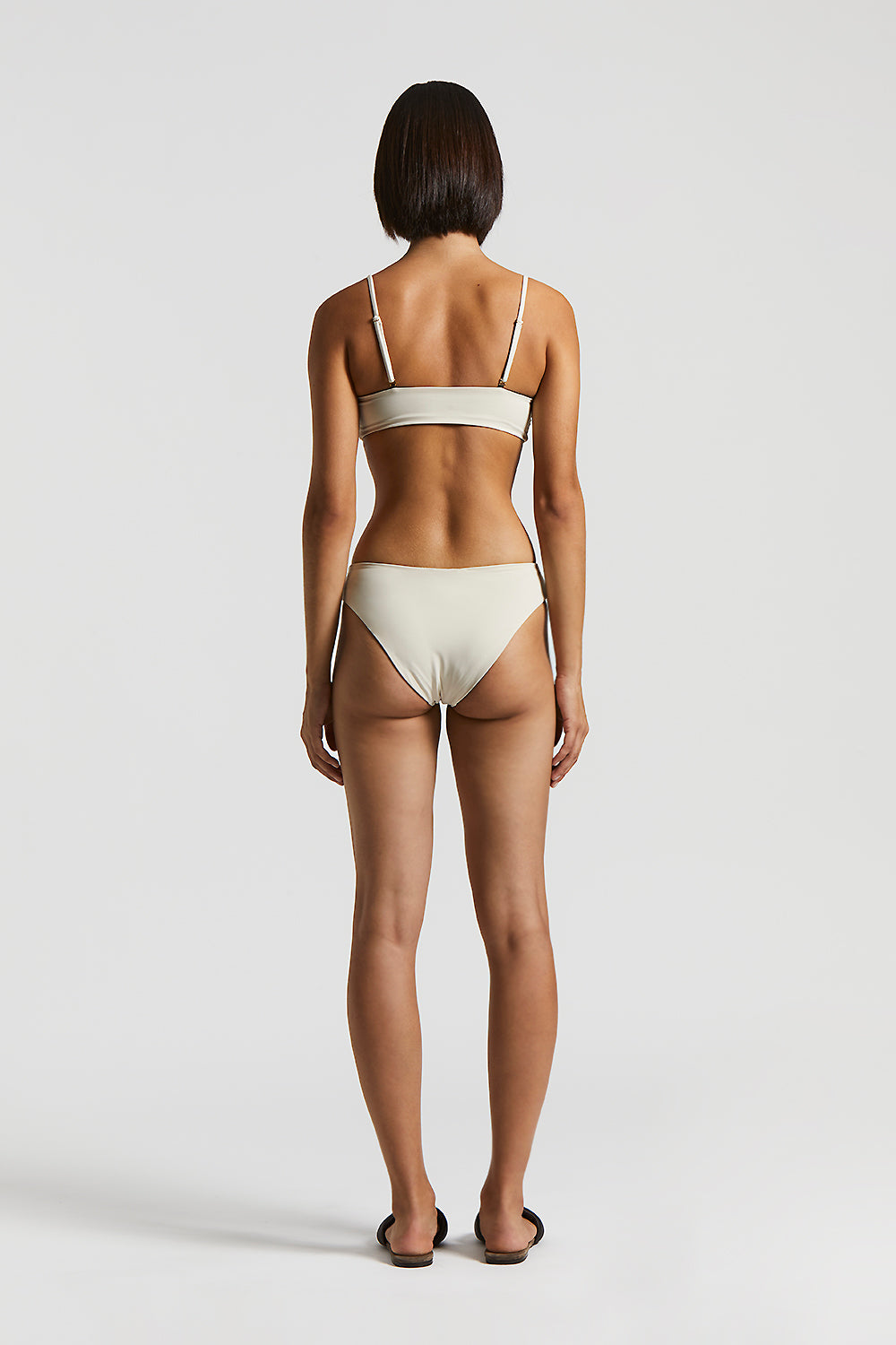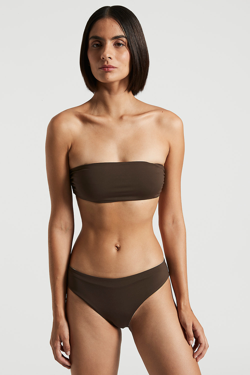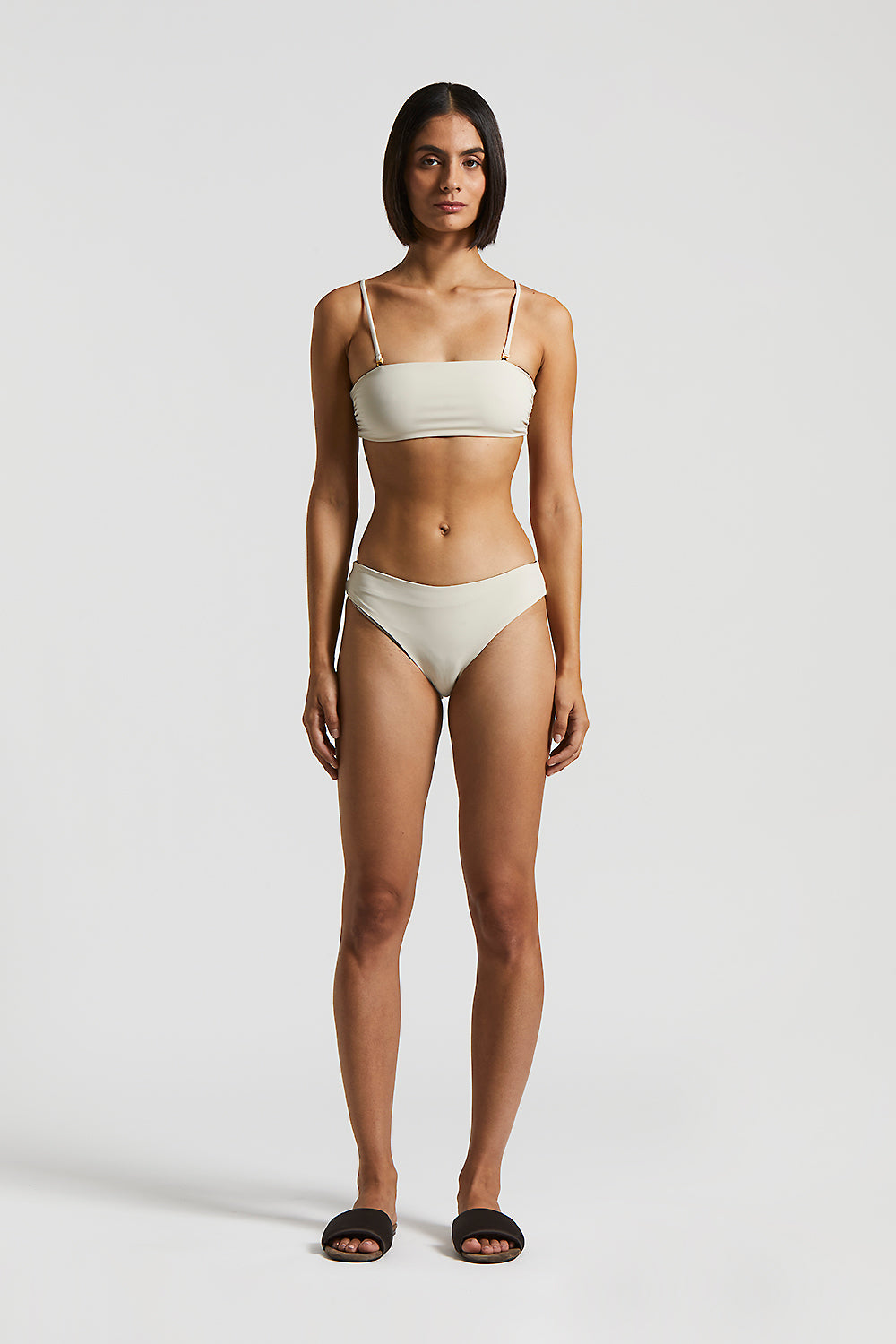 The bandeau top with detachable shoulder straps offers a customizable fit, while the low rise bikini bottom completes a minimalist, sophisticated design.