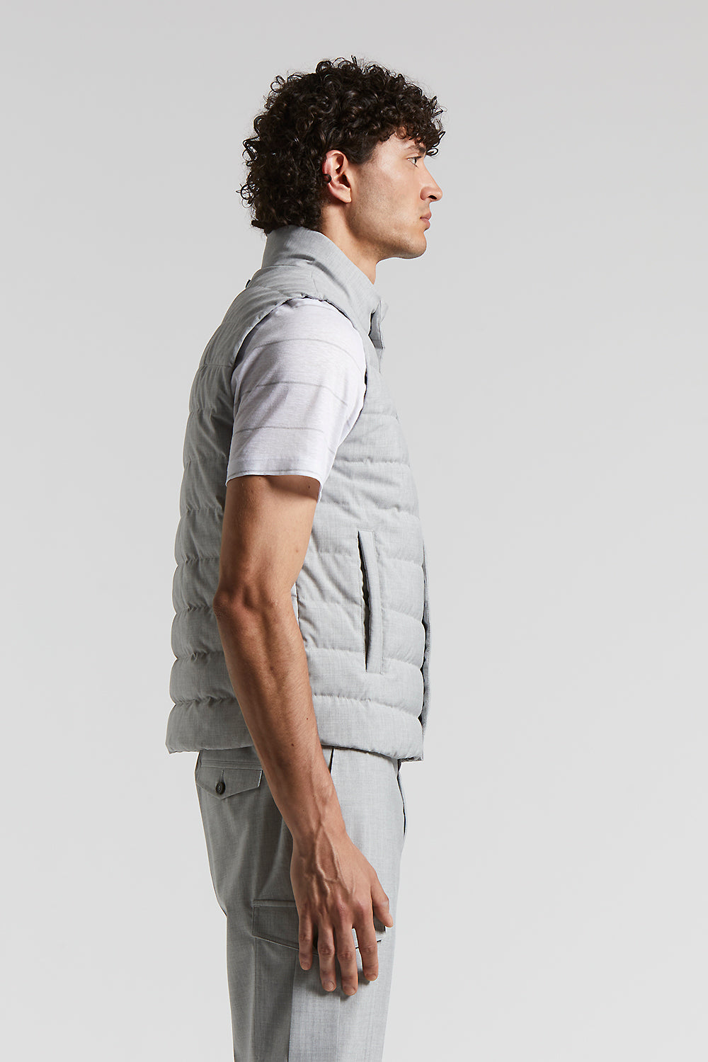 Down-padded gilet in a sophisticated stretch viscose technical fabric, ideal for those looking for versatile, contemporary apparel.