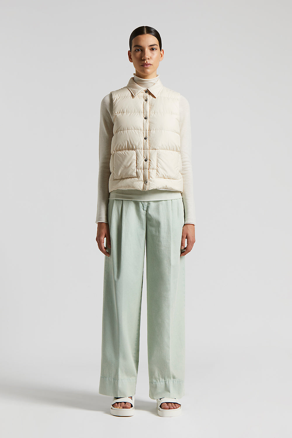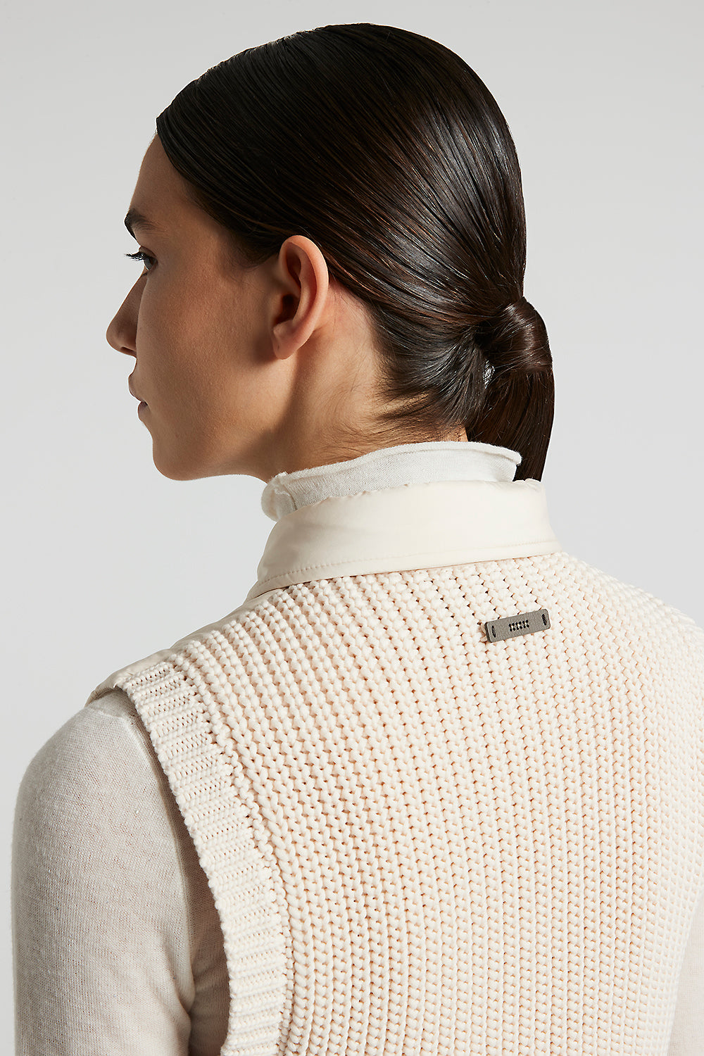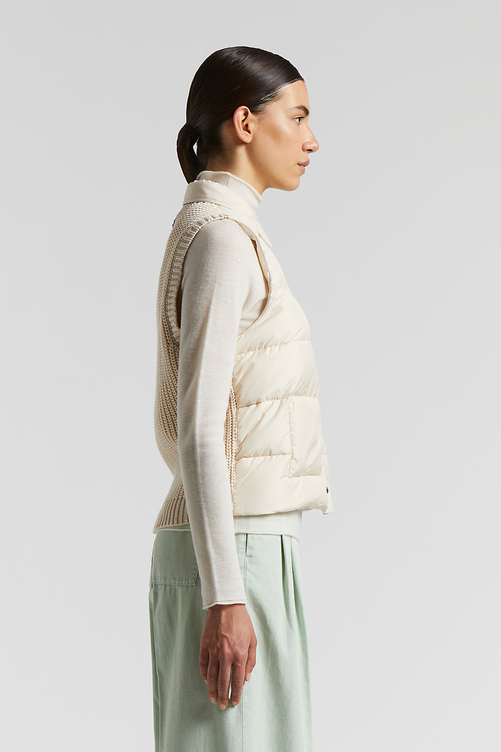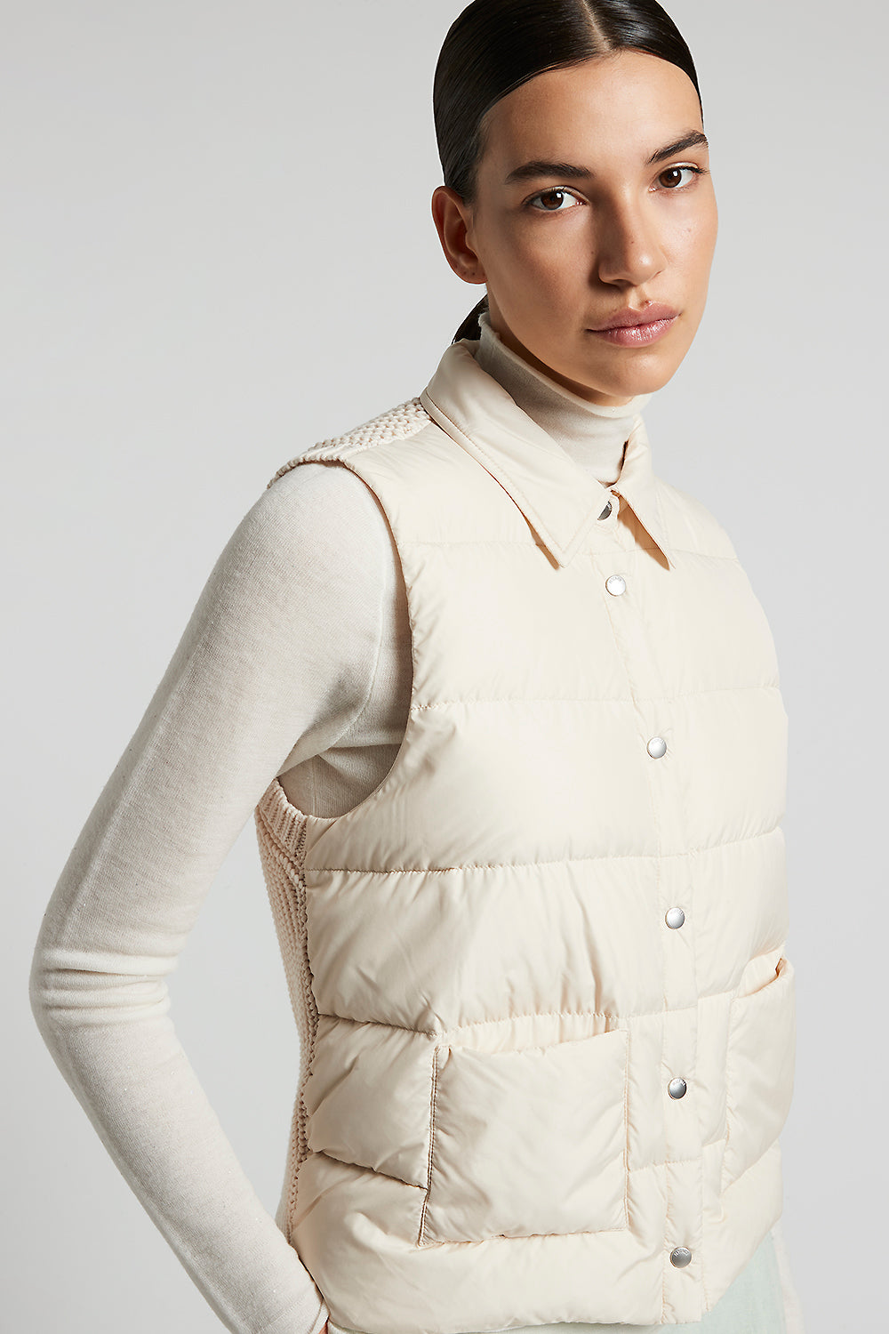Made of drip-proof peachskin microfibre, this waistcoat fully expresses the bimaterial concept with a knitted back designed for stylish modern allure.The warm goose down padding on the front makes it …