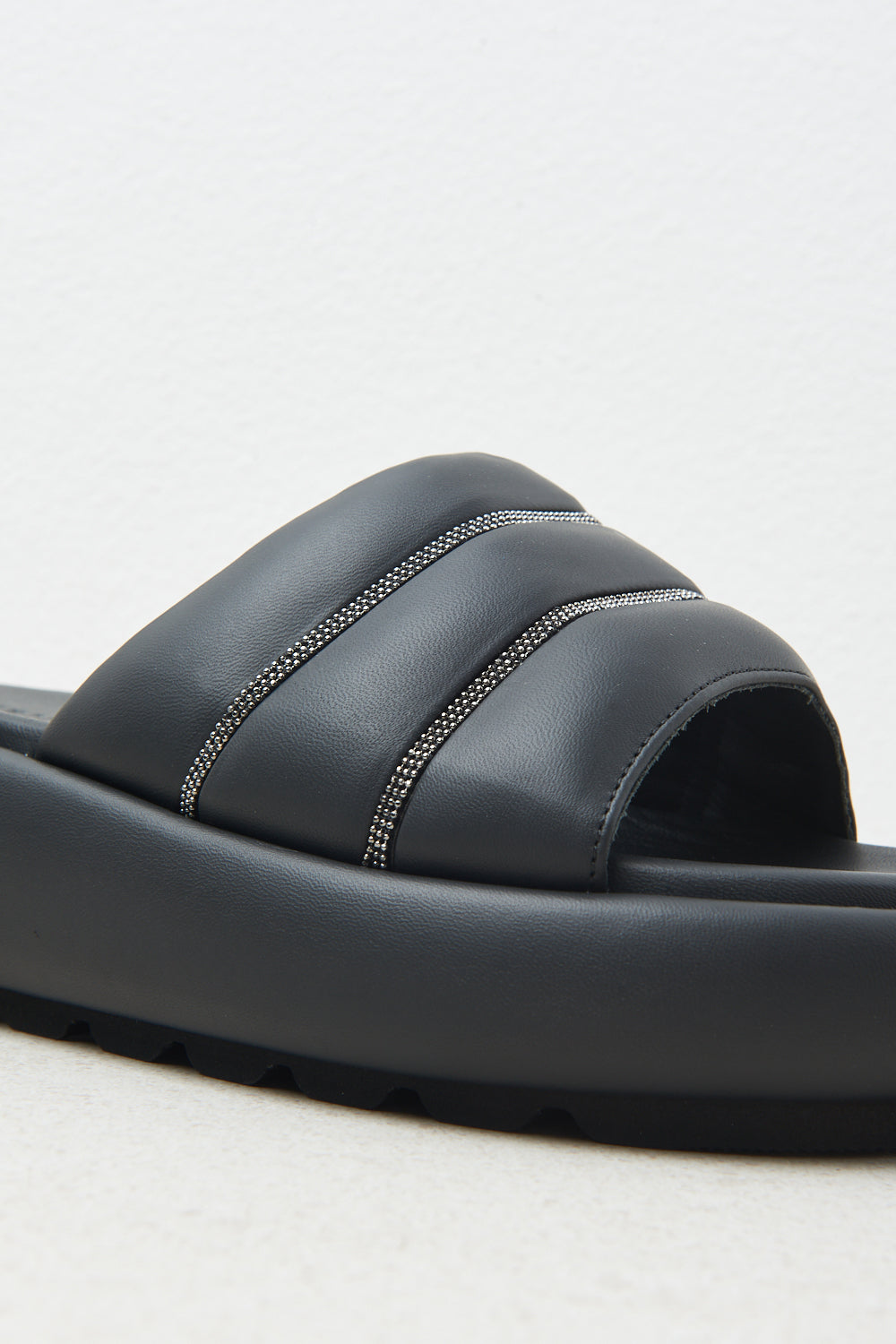 Embossed slippers with a strong personality, embellished with elegant Punto Luce chain inserts.