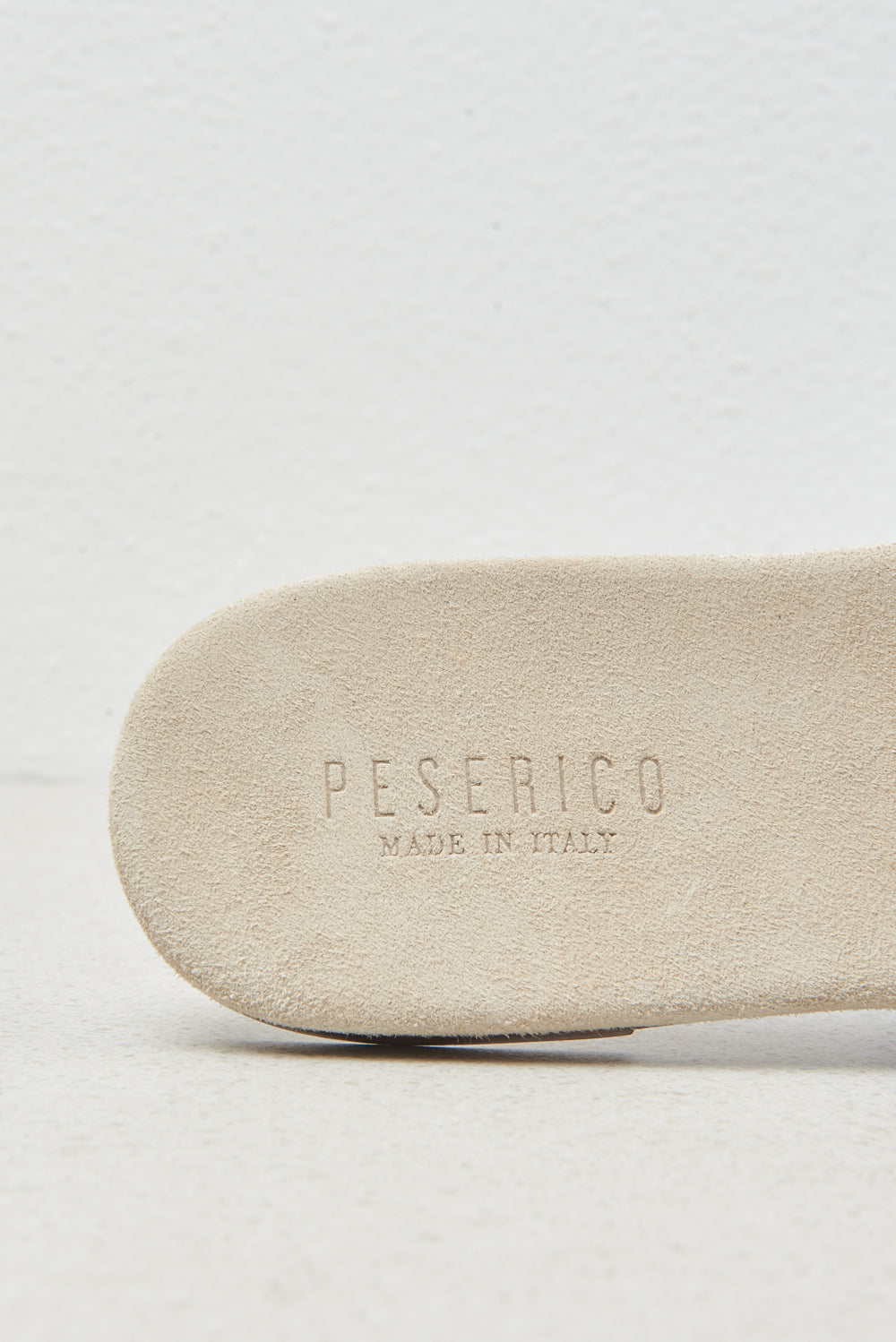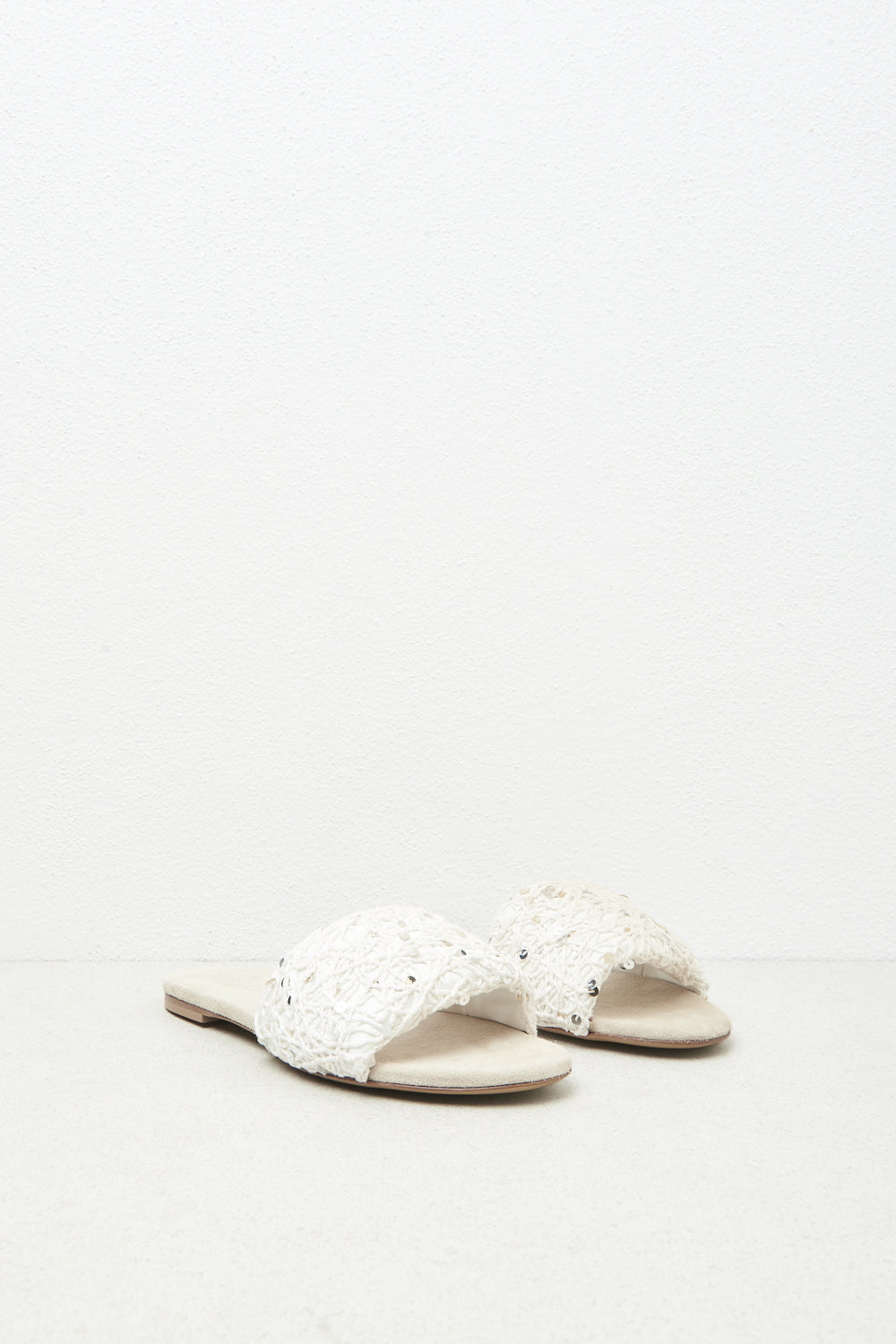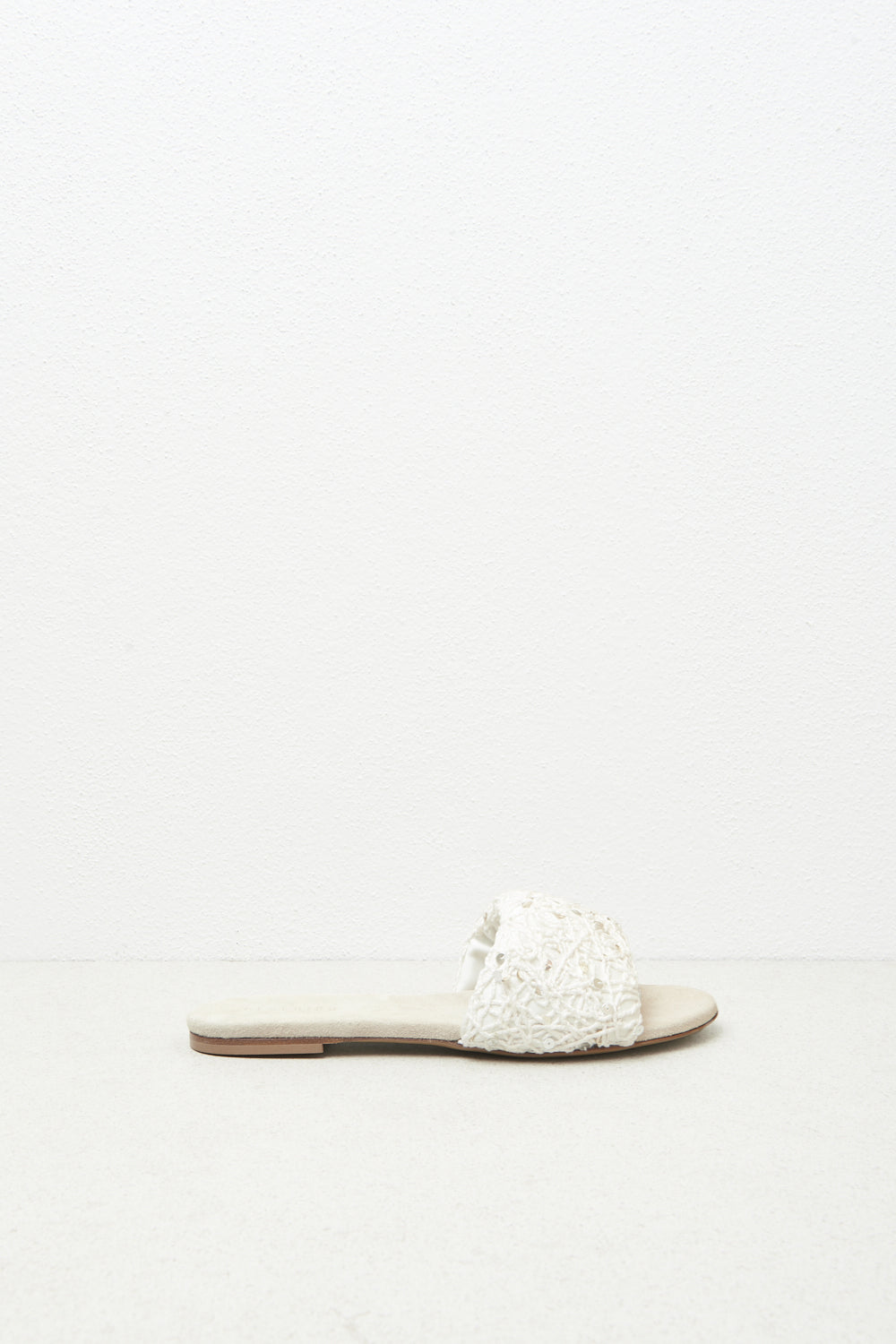 An elegant interpretation of simplicity – these flat slides are embroidered with a refined embossed effect that enhances the texture and delicacy.