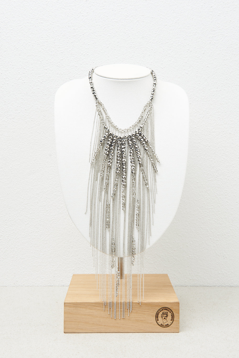 Sculpted elegance takes form in this bib necklace, where the fan effect opens with refined lightness.A sparkling cascade of chains and demi-crystals embellish the design, creating a play of sophistica…