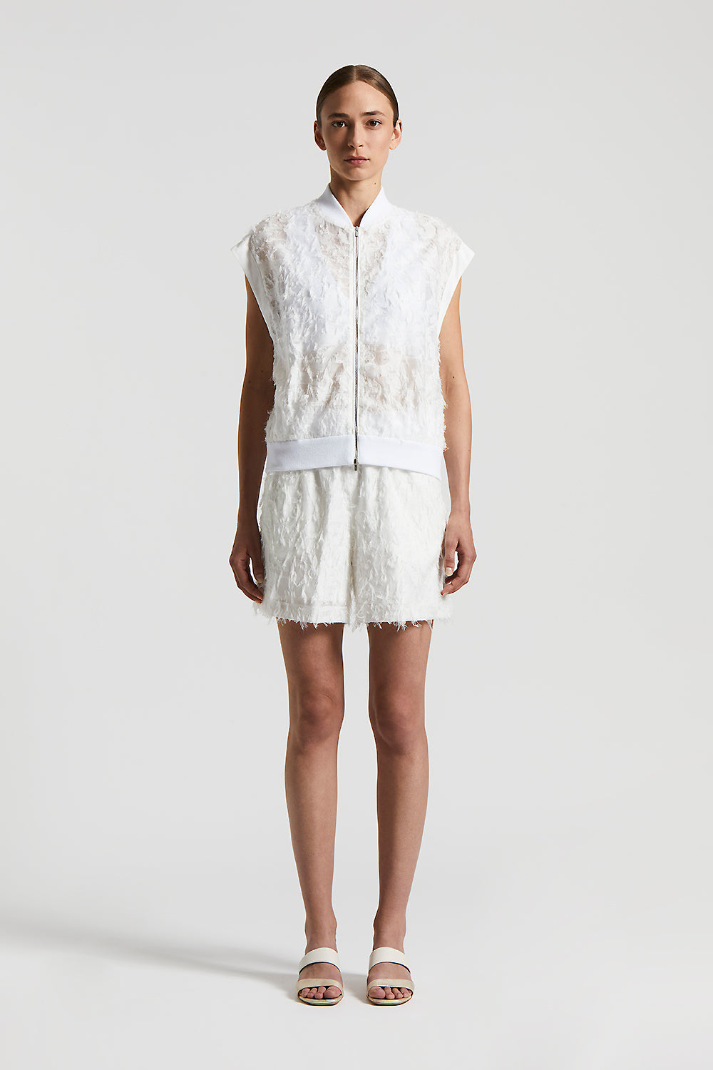 These white trousers in fil coupé organza with ribbed details offer a sophisticated, light texture.