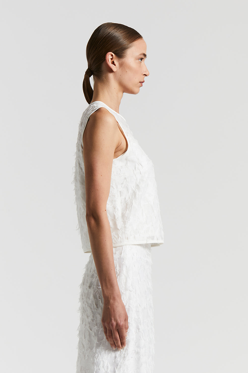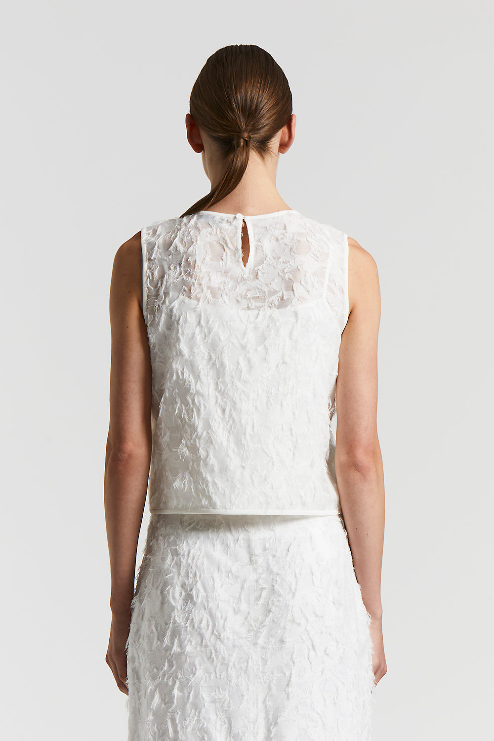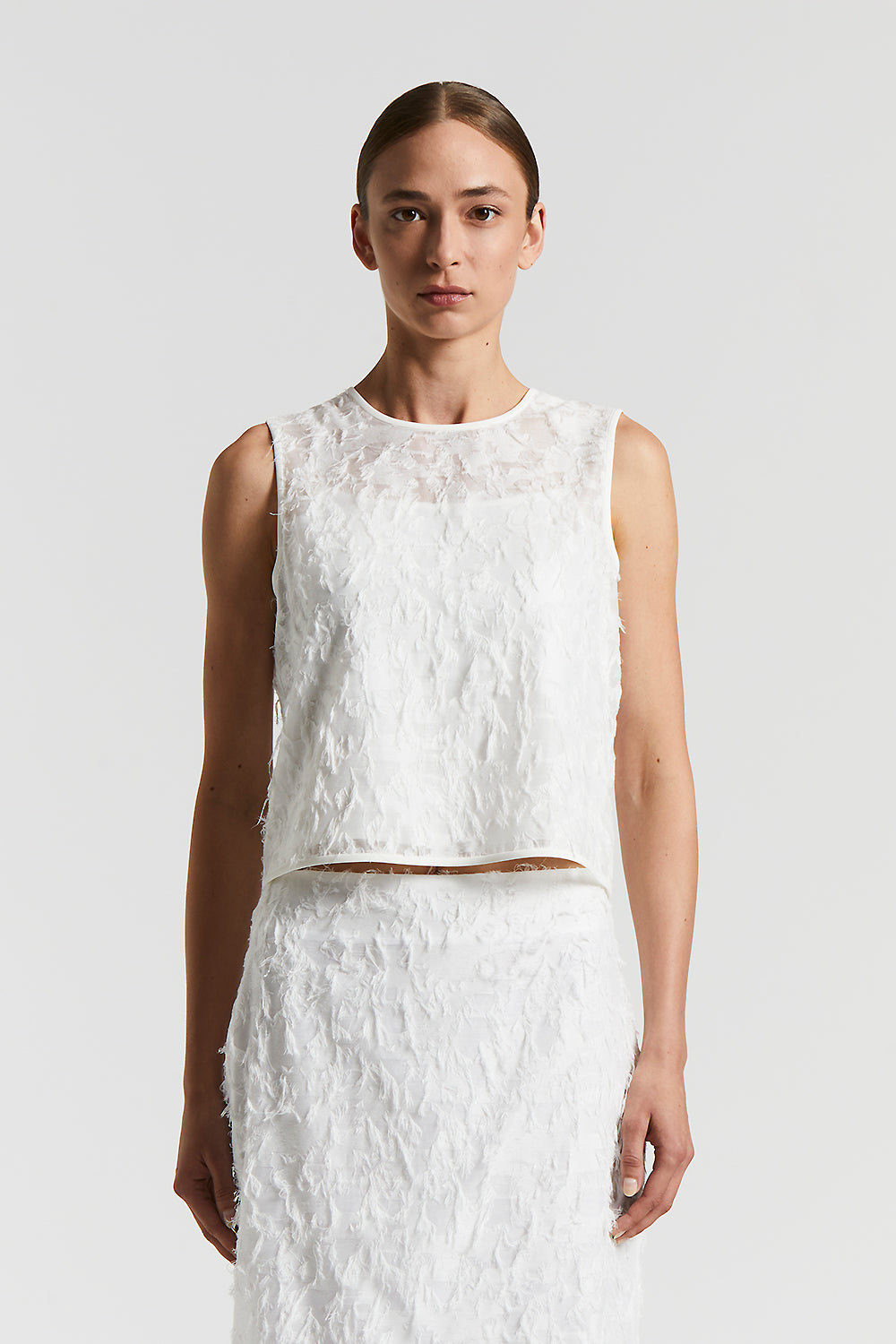 Sleeveless top with round neckline in fil coupé organza, which creates a light and refined effect.Satin trims on the neckline and armhole add a touch of discreet elegance.The cropped fit conveys cont…