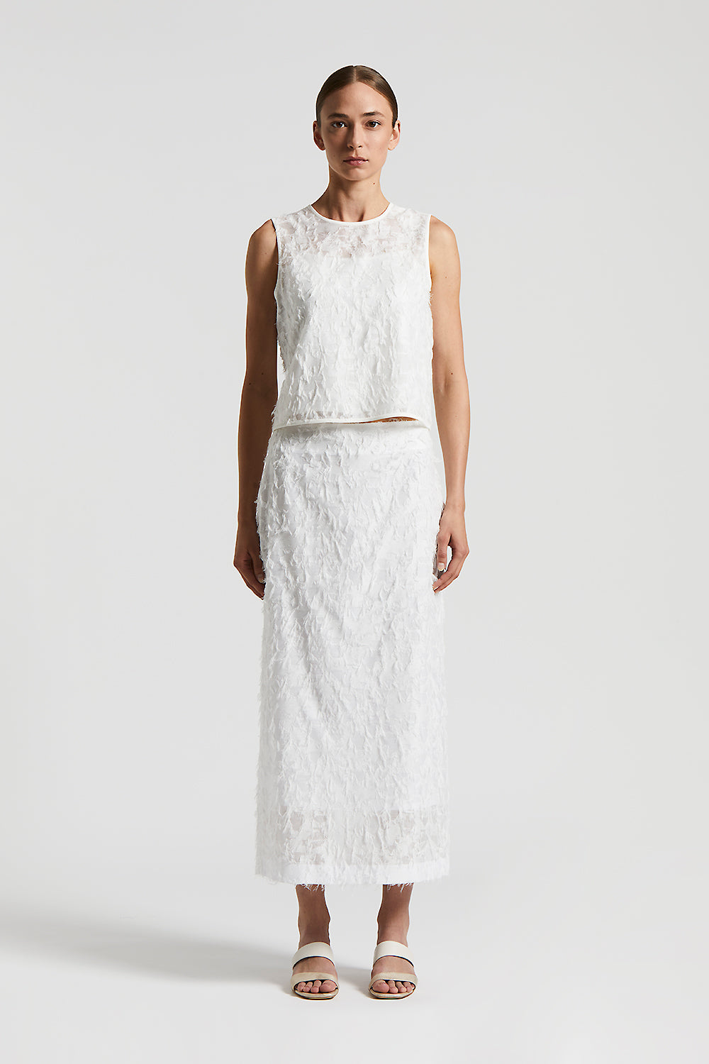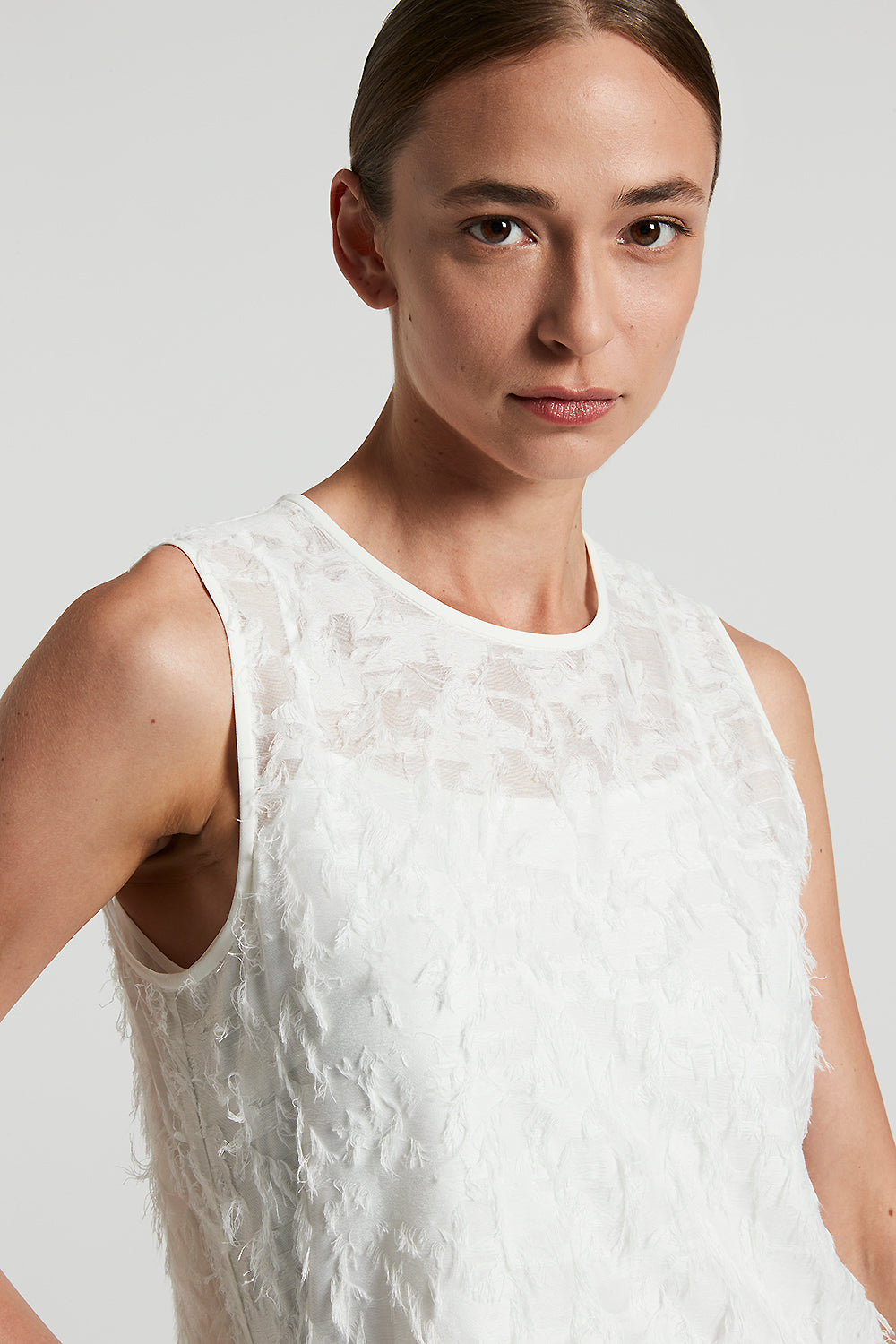 Sleeveless top with round neckline in fil coupé organza, which creates a light and refined effect.