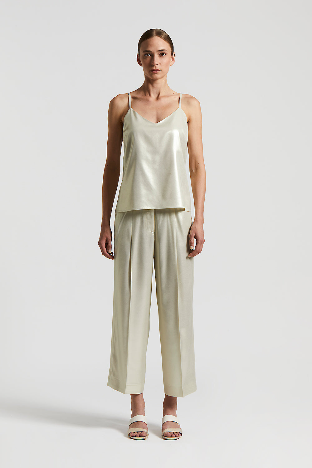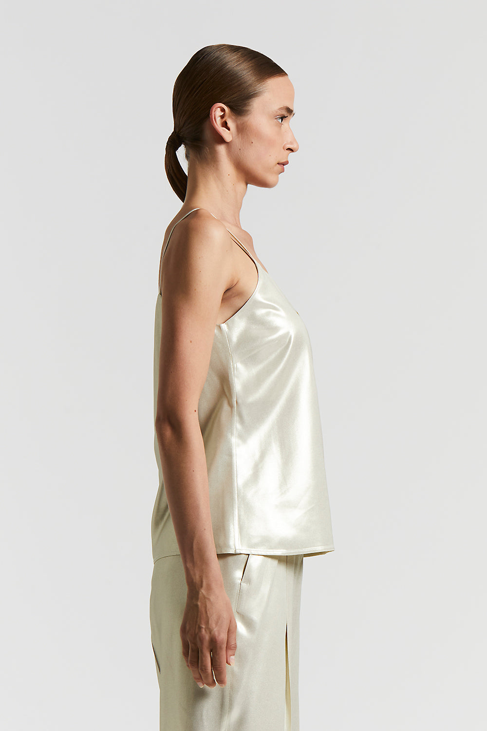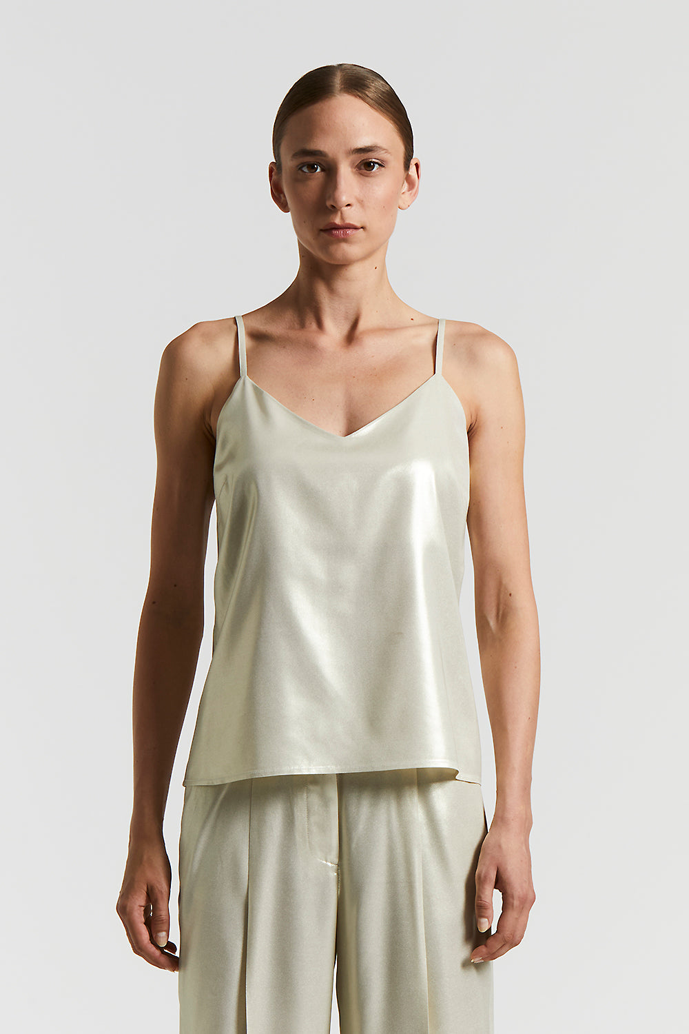 V-neck top featuring narrow shoulder straps that enhance the delicacy of the design.The regular fit ensures an elegant and versatile line.Made of fluid laminated viscose twill, the fabric enhances the…
