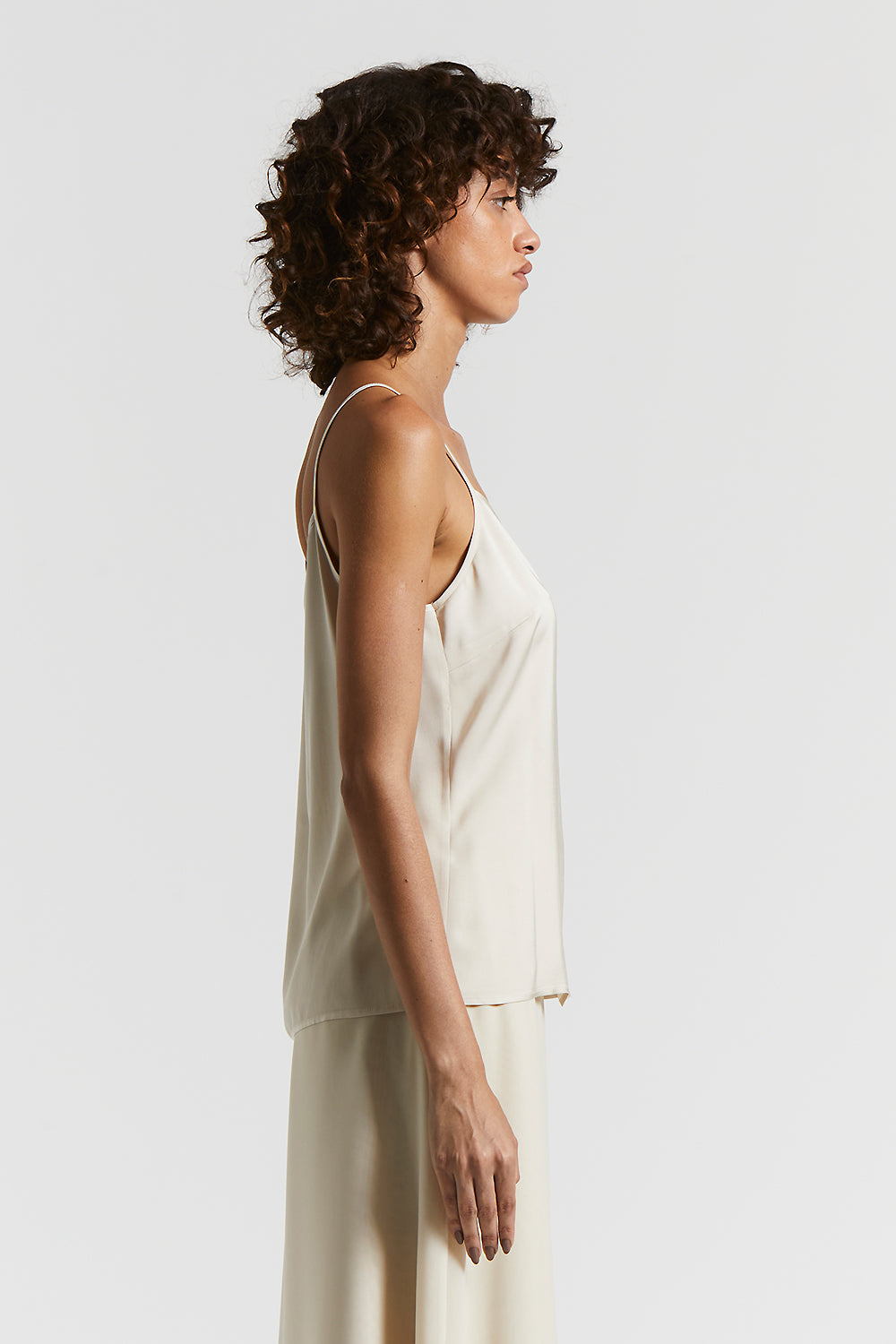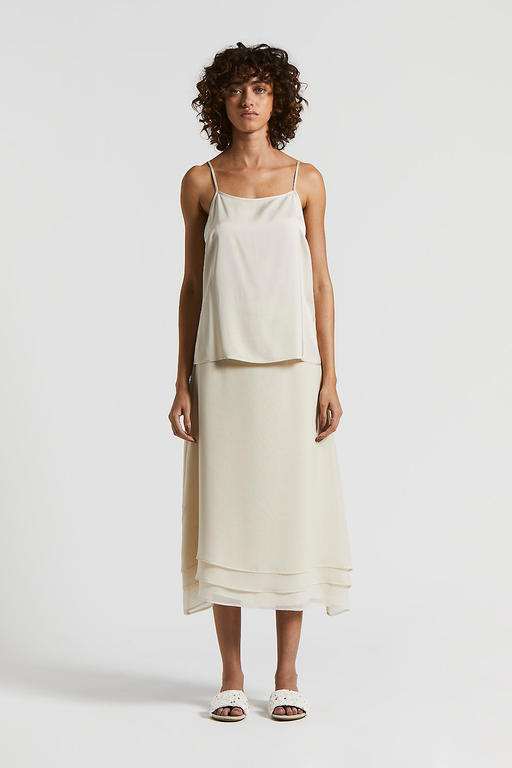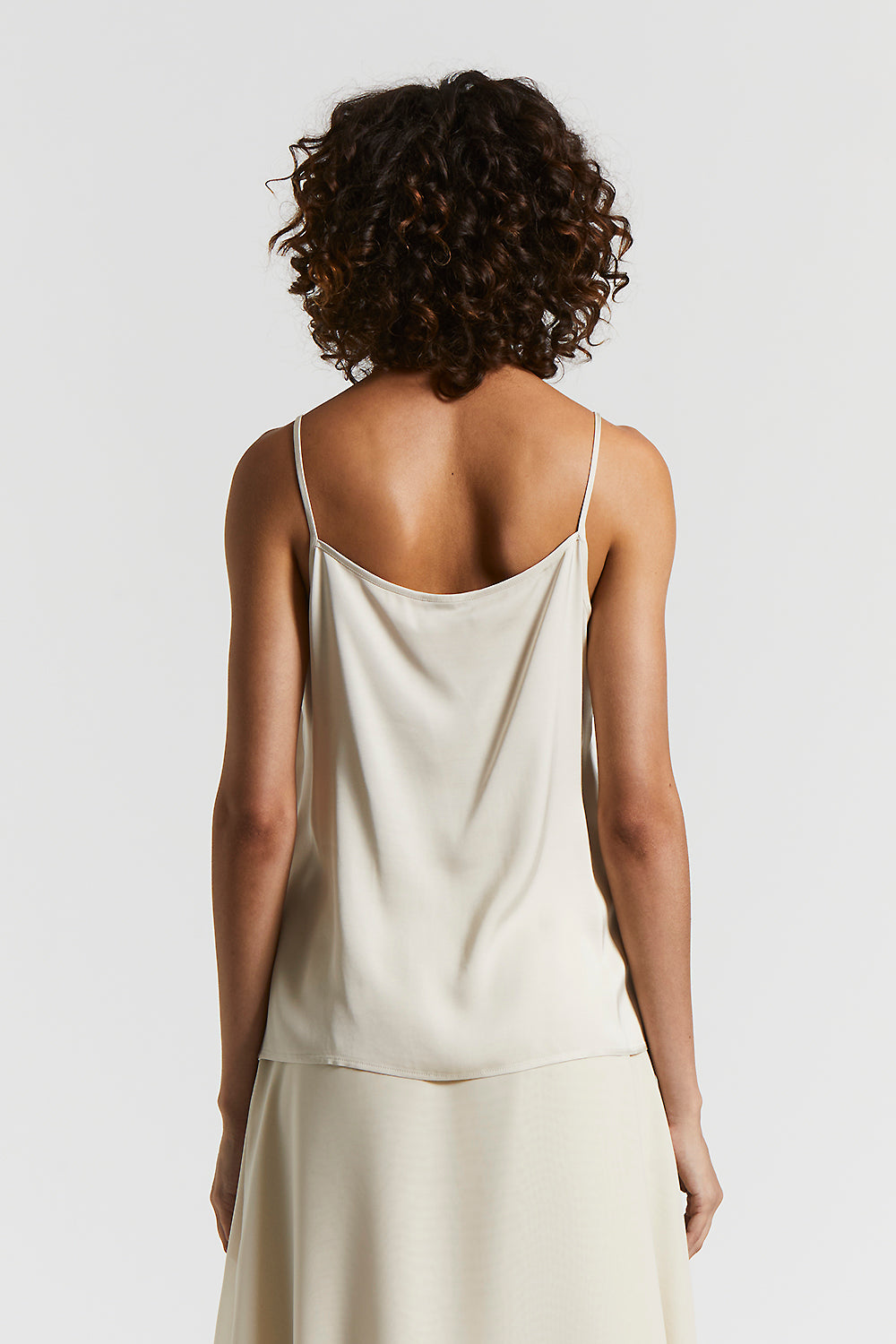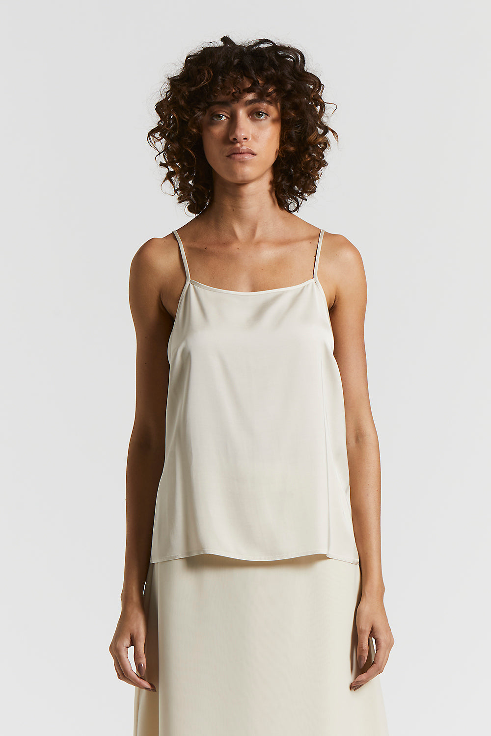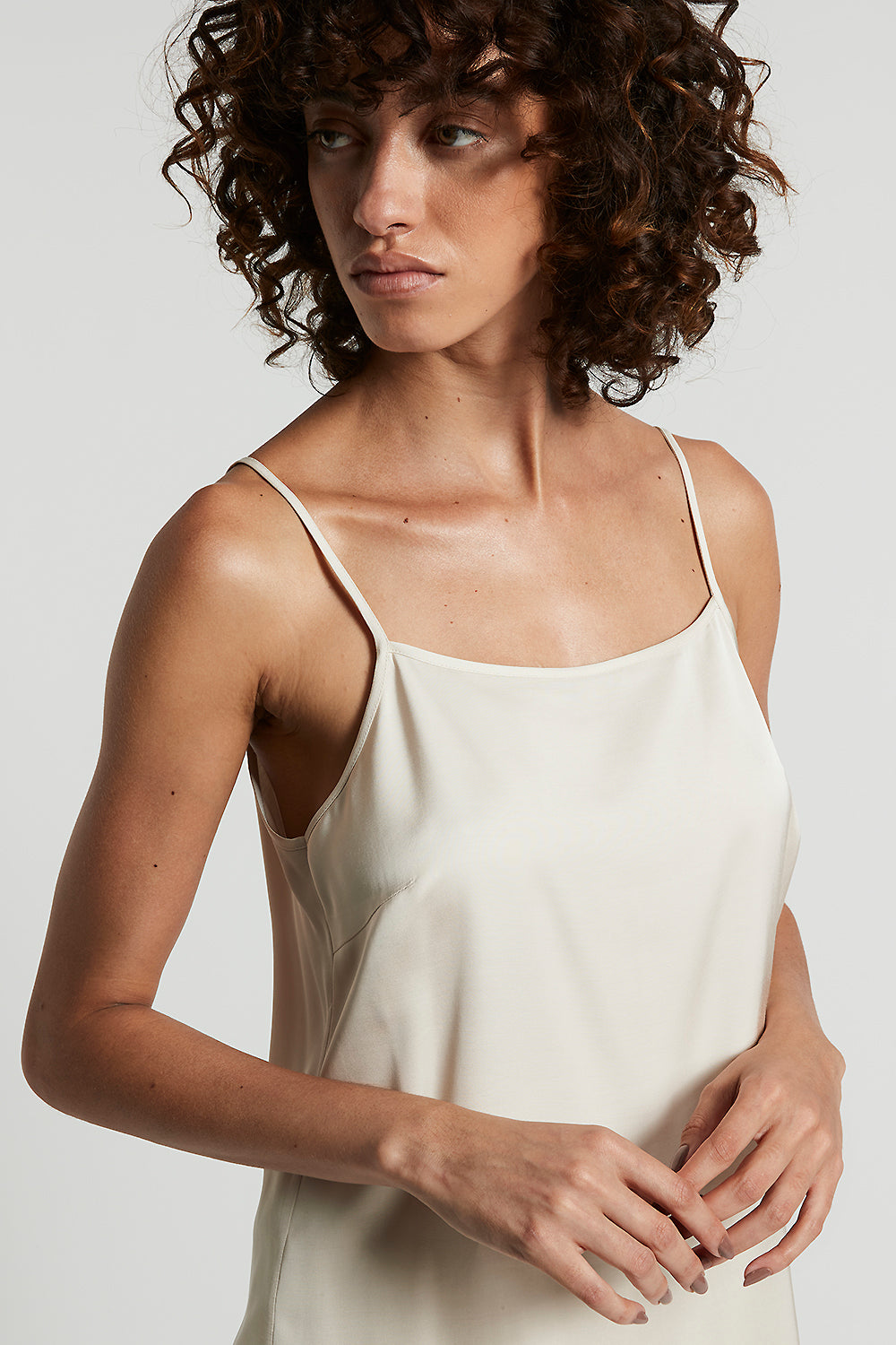 Slip top with narrow straps, featuring a regular fit that enhances the figure with simple elegance.