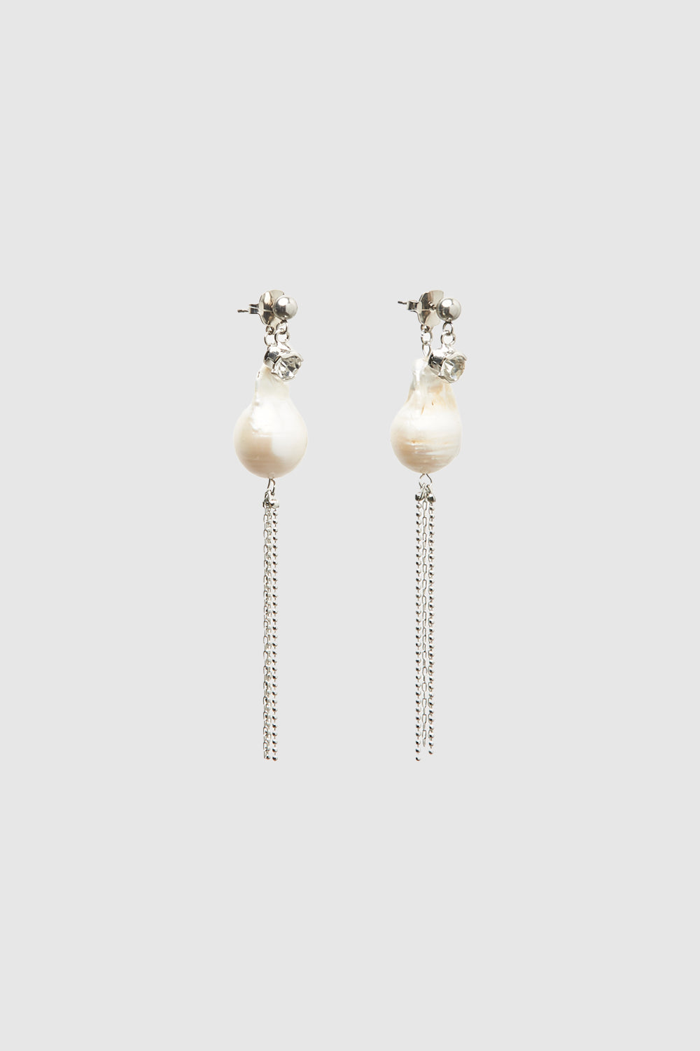 A symphony of light and movement. These earrings pair the sparkle of rhinestones with a freshwater pearl, gracefully suspended on a chain fringe.A refined detail that illuminates the face with discree…