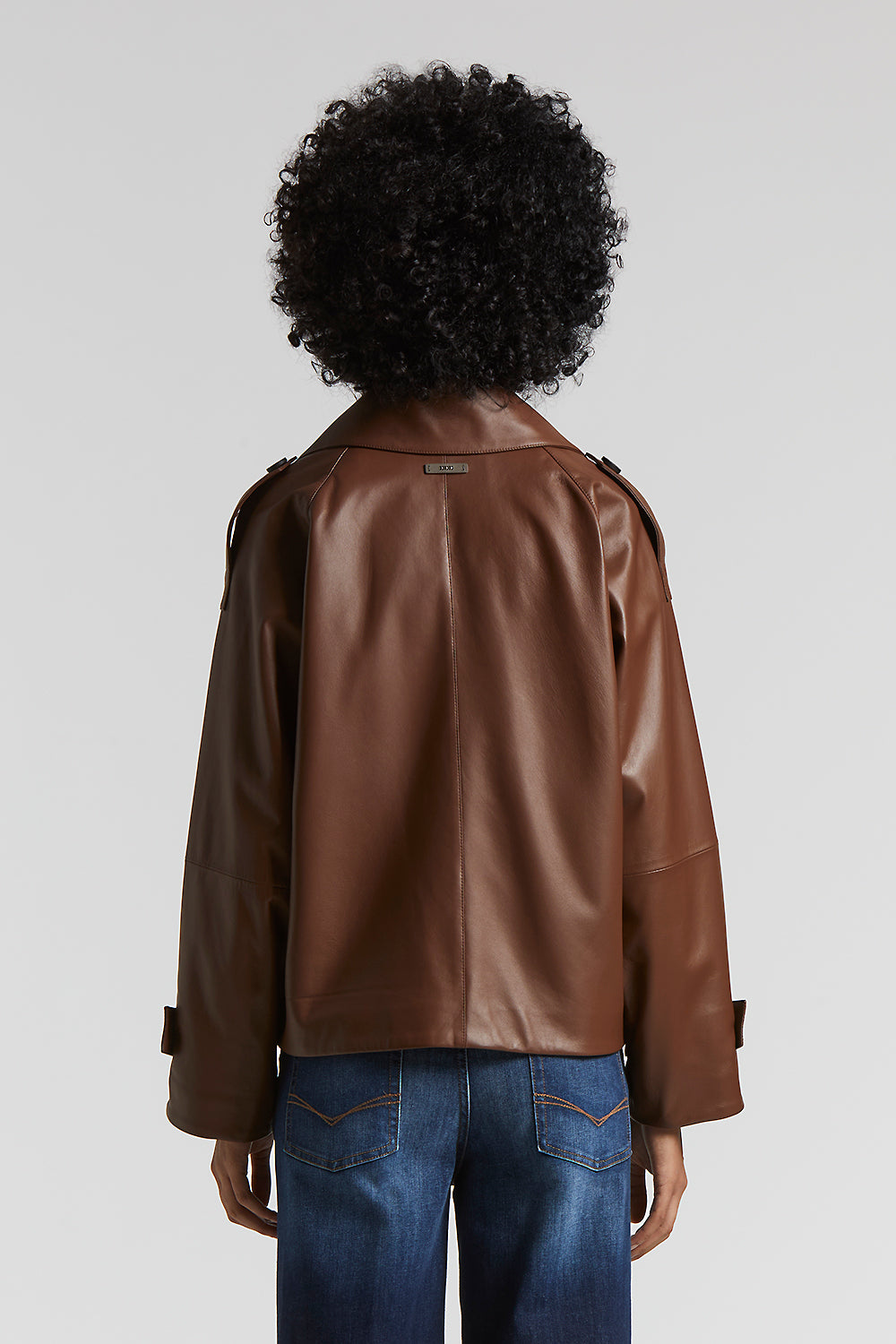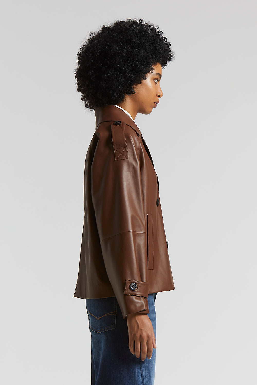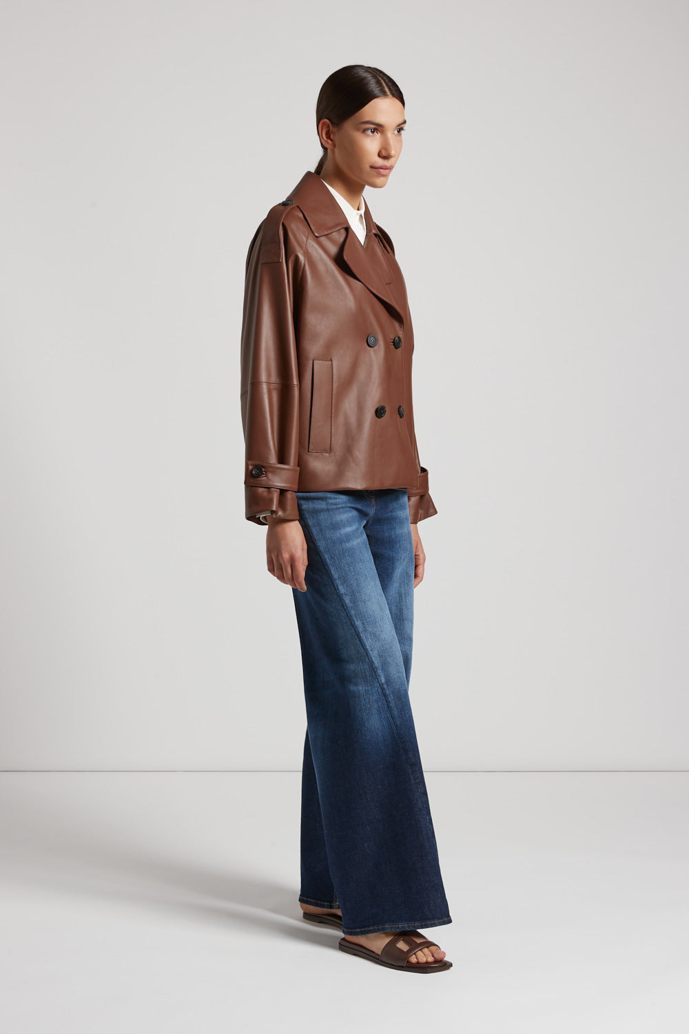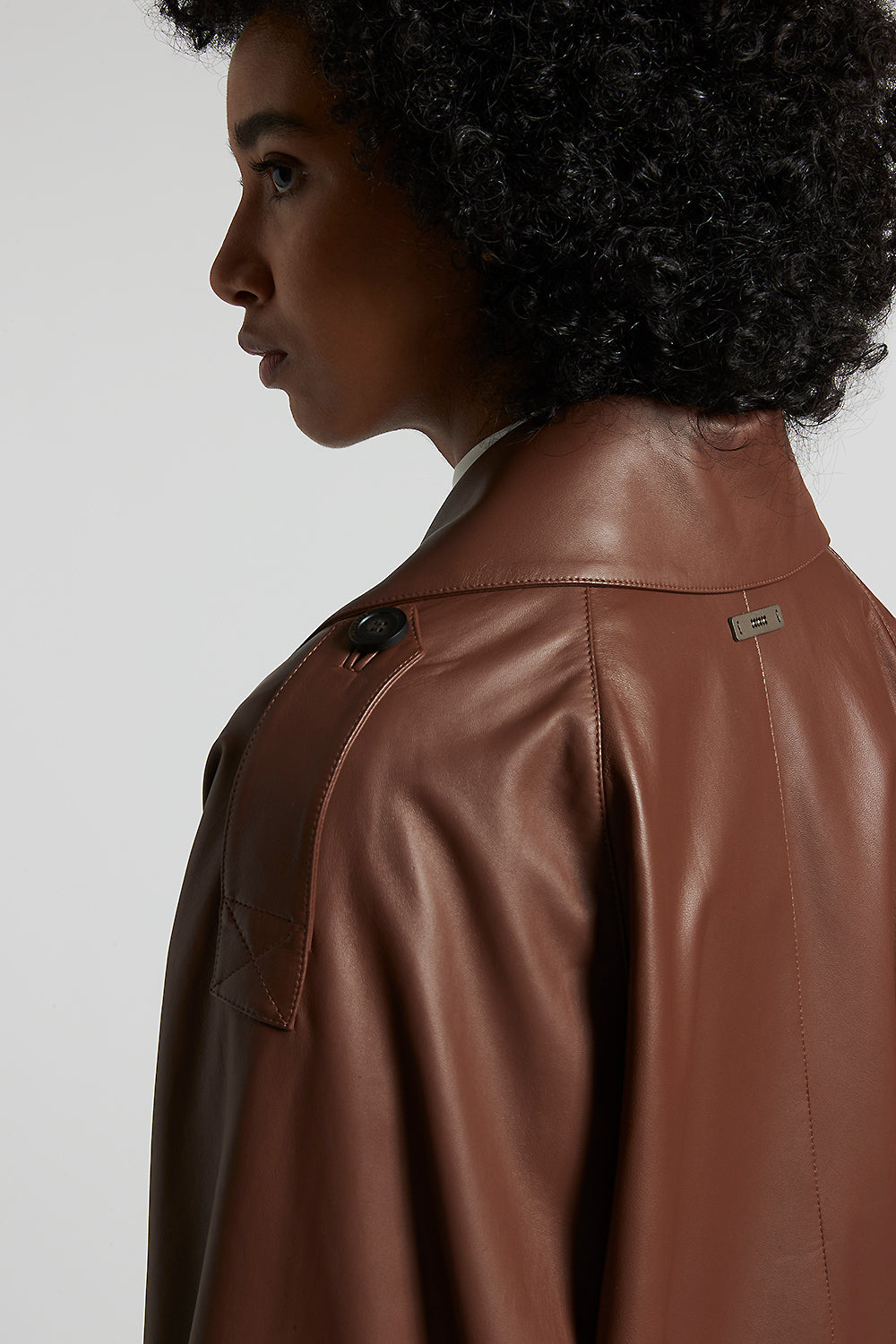 A masterpiece of style and craftsmanship, this short trench coat in soft lambskin leather elevates the concept of contemporary luxury.