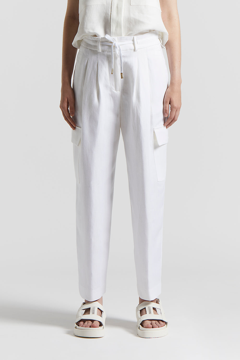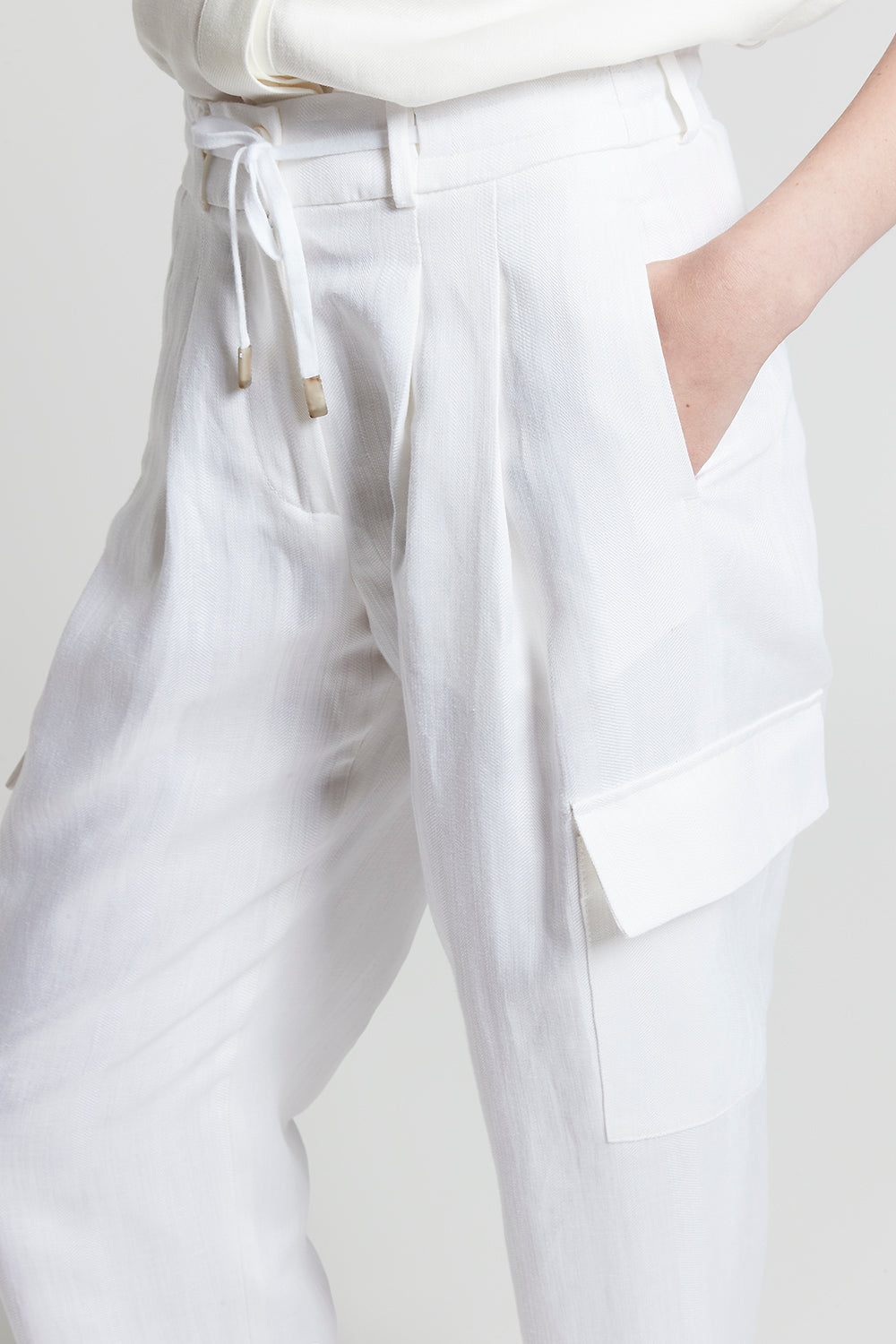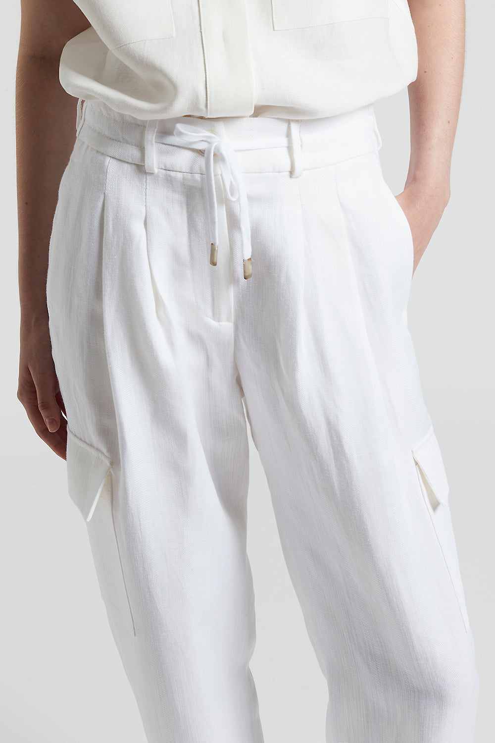 These cargo trousers made of herringbone yarn-dyed linen and viscose combine the soft lightness of the fabric with a sophisticated structure.