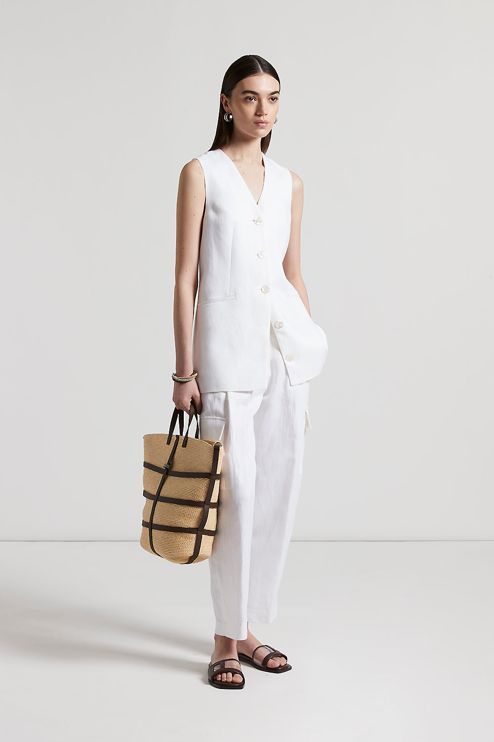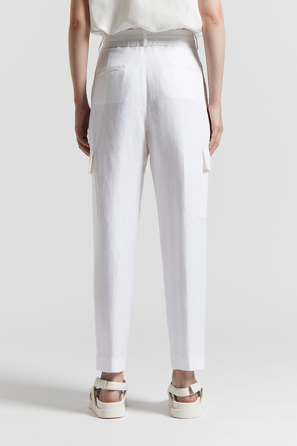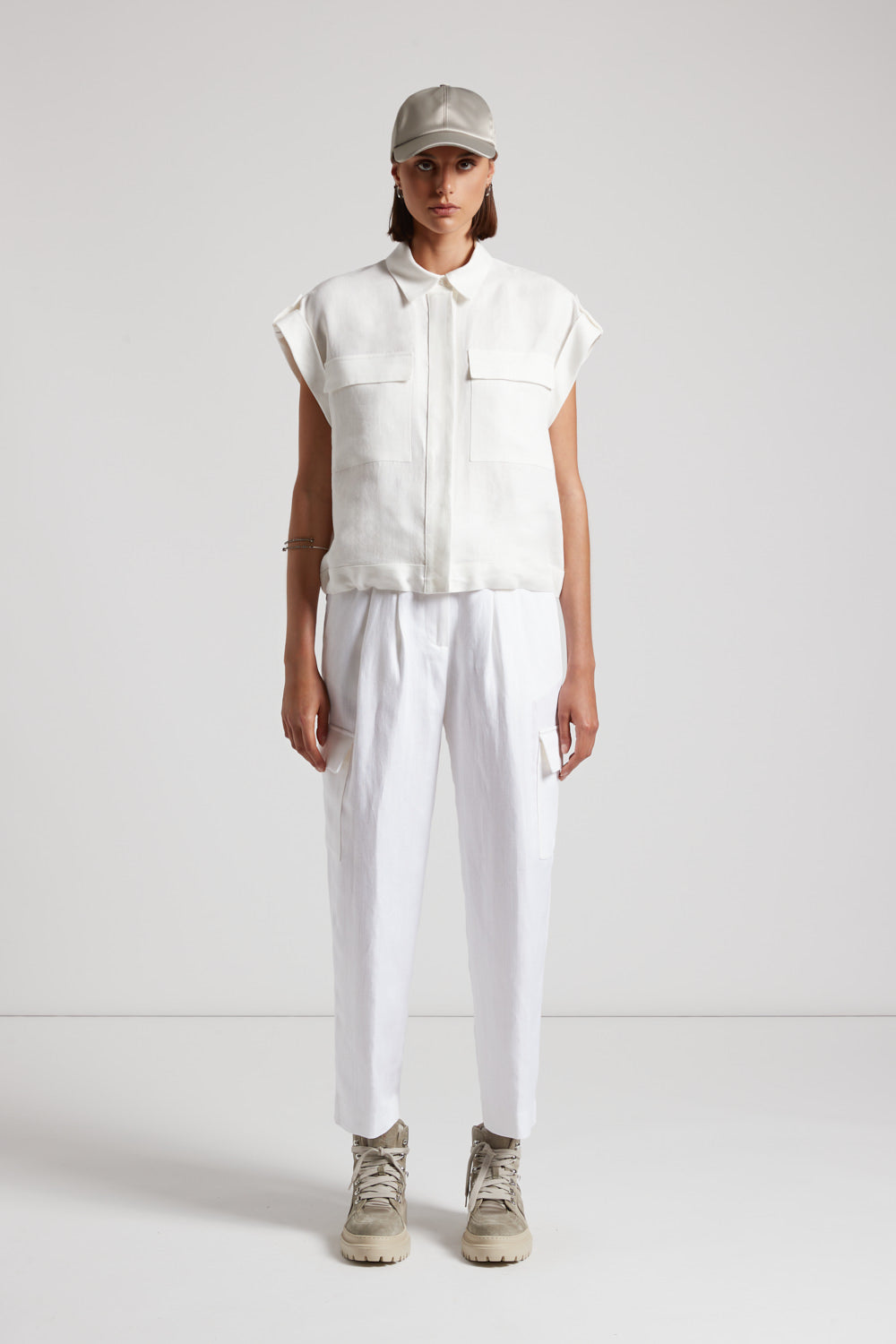 These cargo trousers made of herringbone yarn-dyed linen and viscose combine the soft lightness of the fabric with a sophisticated structure.