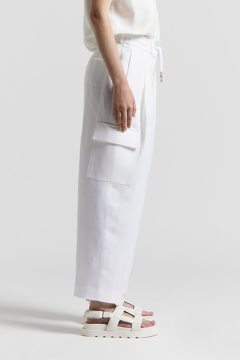 These cargo trousers made of herringbone yarn-dyed linen and viscose combine the soft lightness of the fabric with a sophisticated structure.The pleats at the front and the drawstring waist, together…