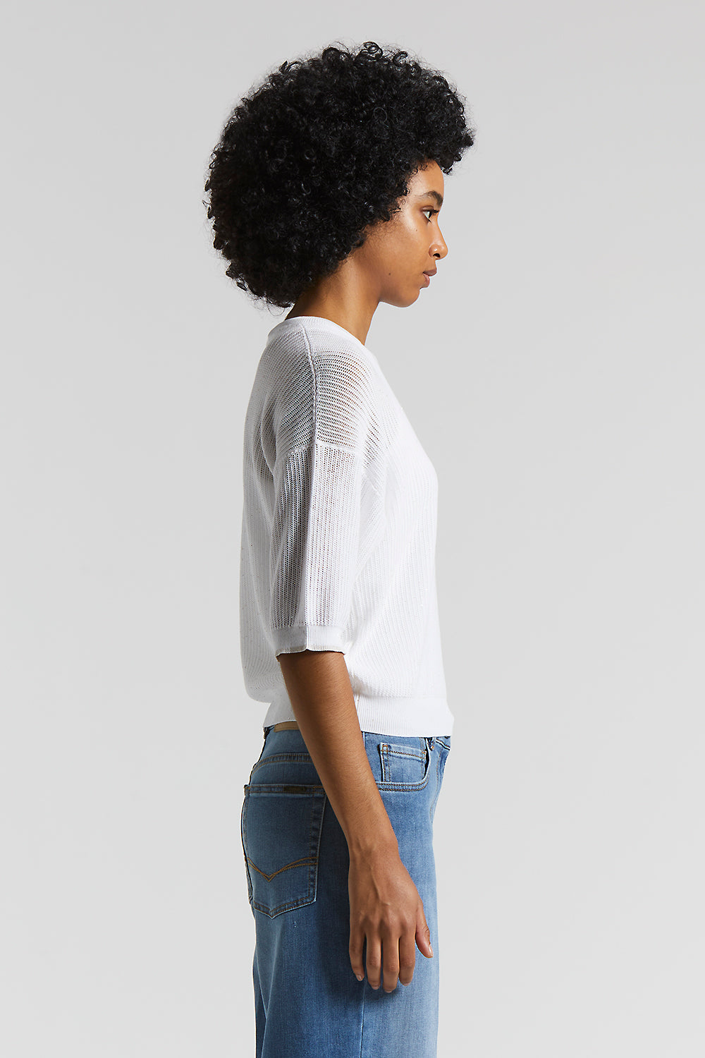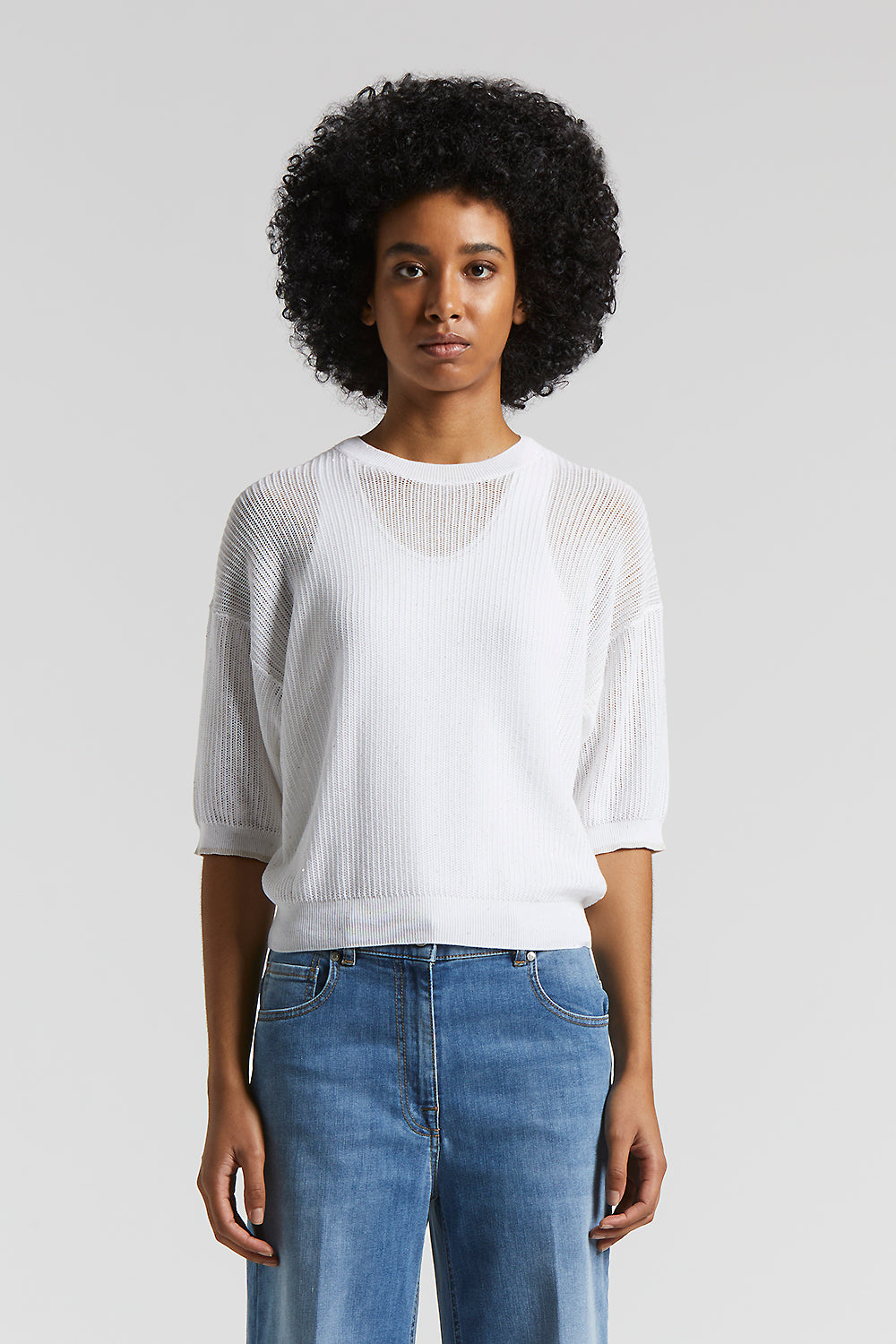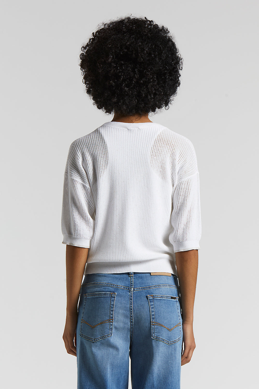 The elbow-length sleeves with dropped shoulder and trimmed with ribbed edges, as well as the micro-mesh knit that enhances the texture, make it ideal for spring and summer.