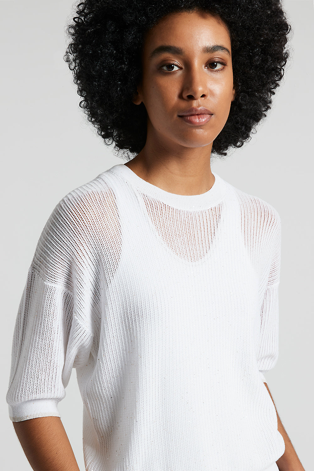 This crew neck sweater in lightweight cotton yarn is embellished with delicate micro sequins that catch the light, enhancing the garment with feminine refinement.The elbow-length sleeves with dropped …