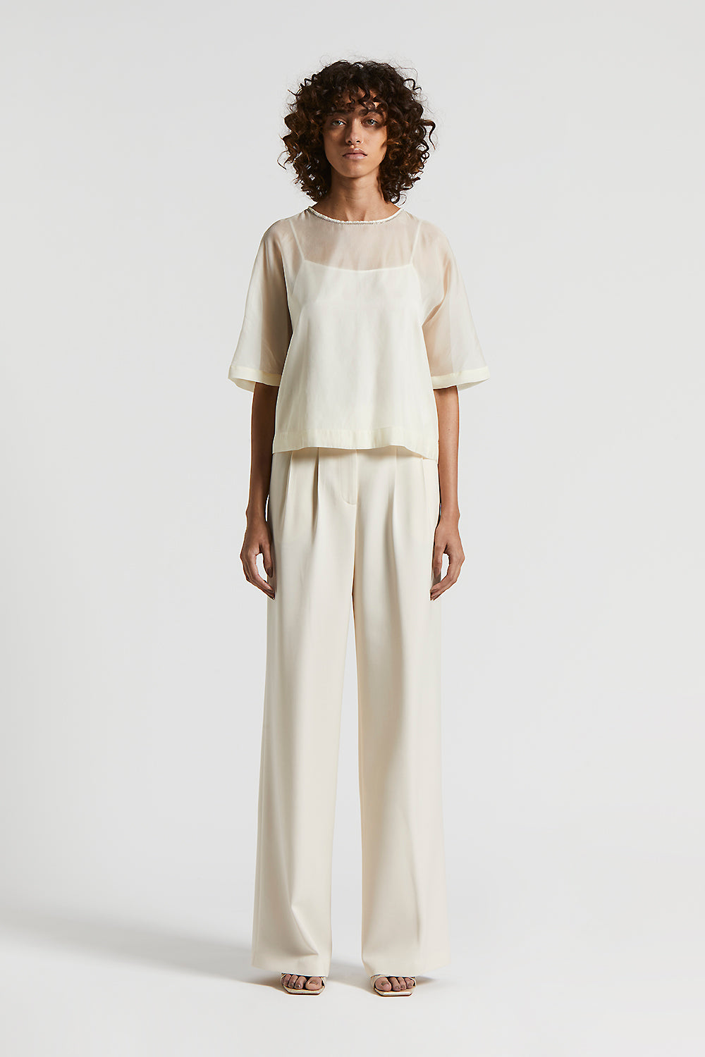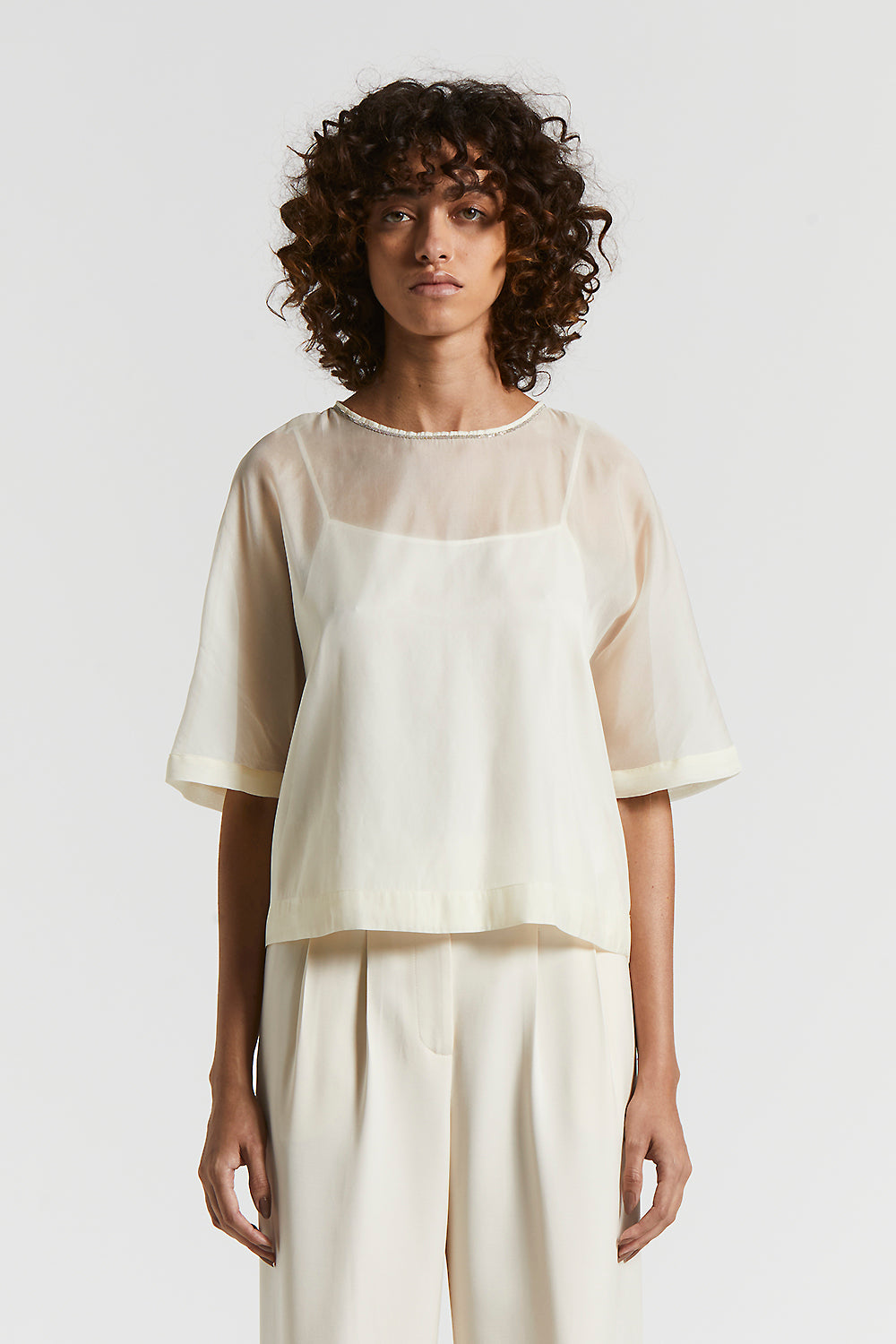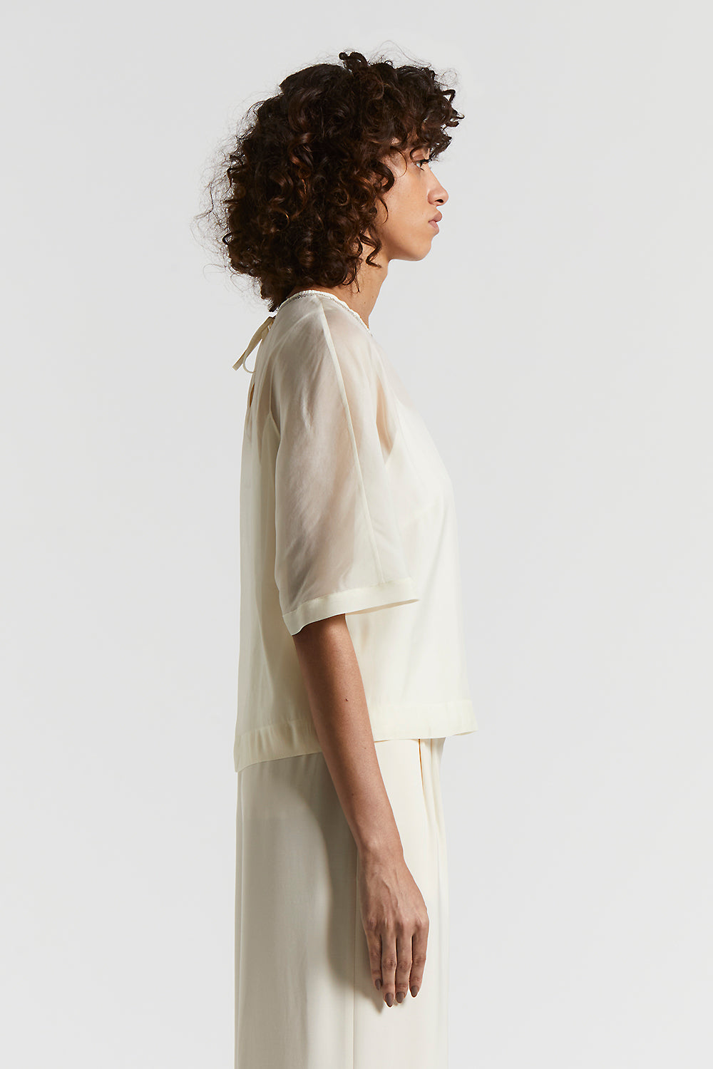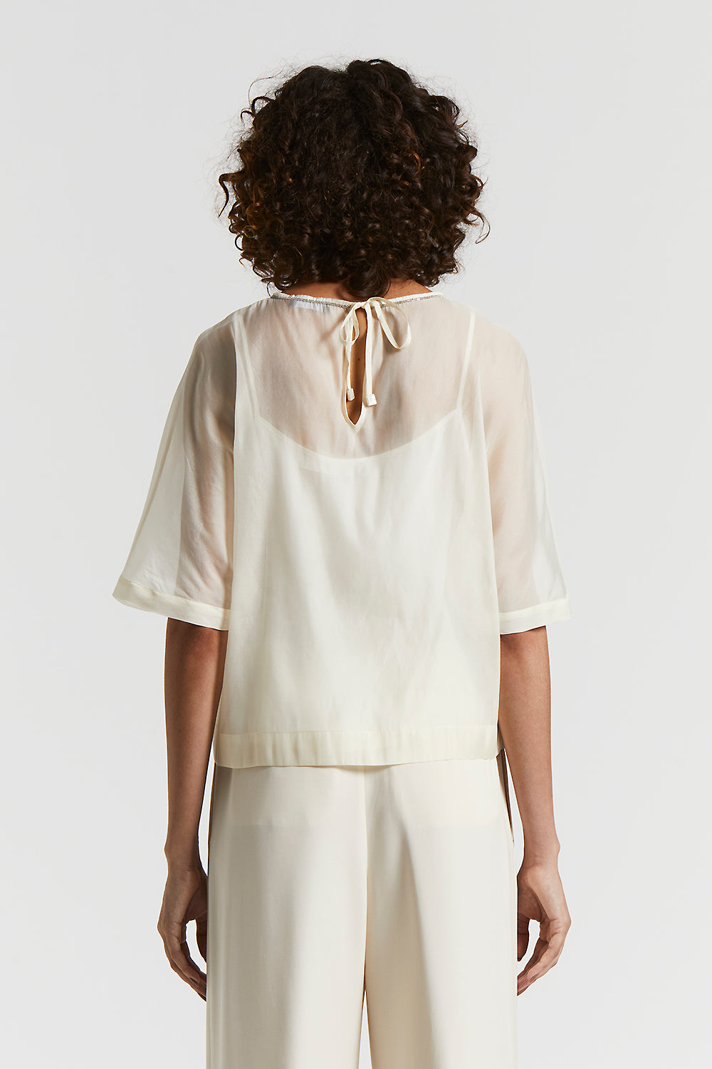 Made of lightweight organza with a refined crepe effect, this blouse combines feminine charm and contemporary style. The delicate fabric offers a unique texture and a sophisticated look.