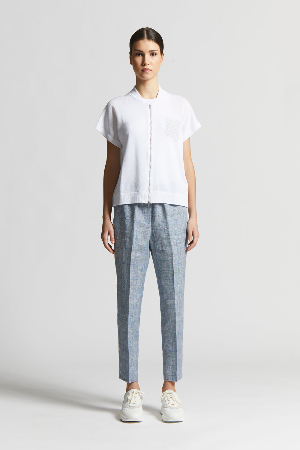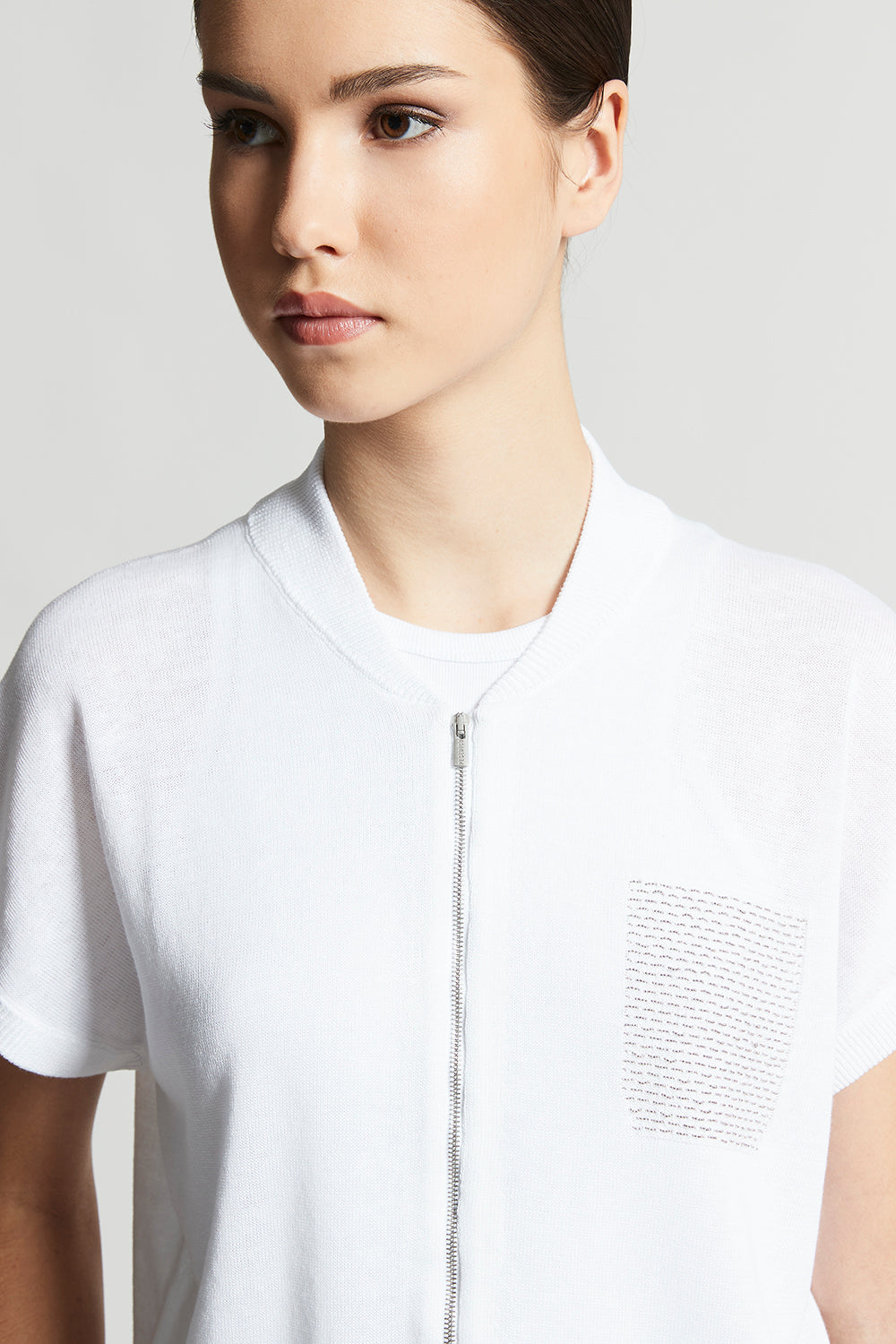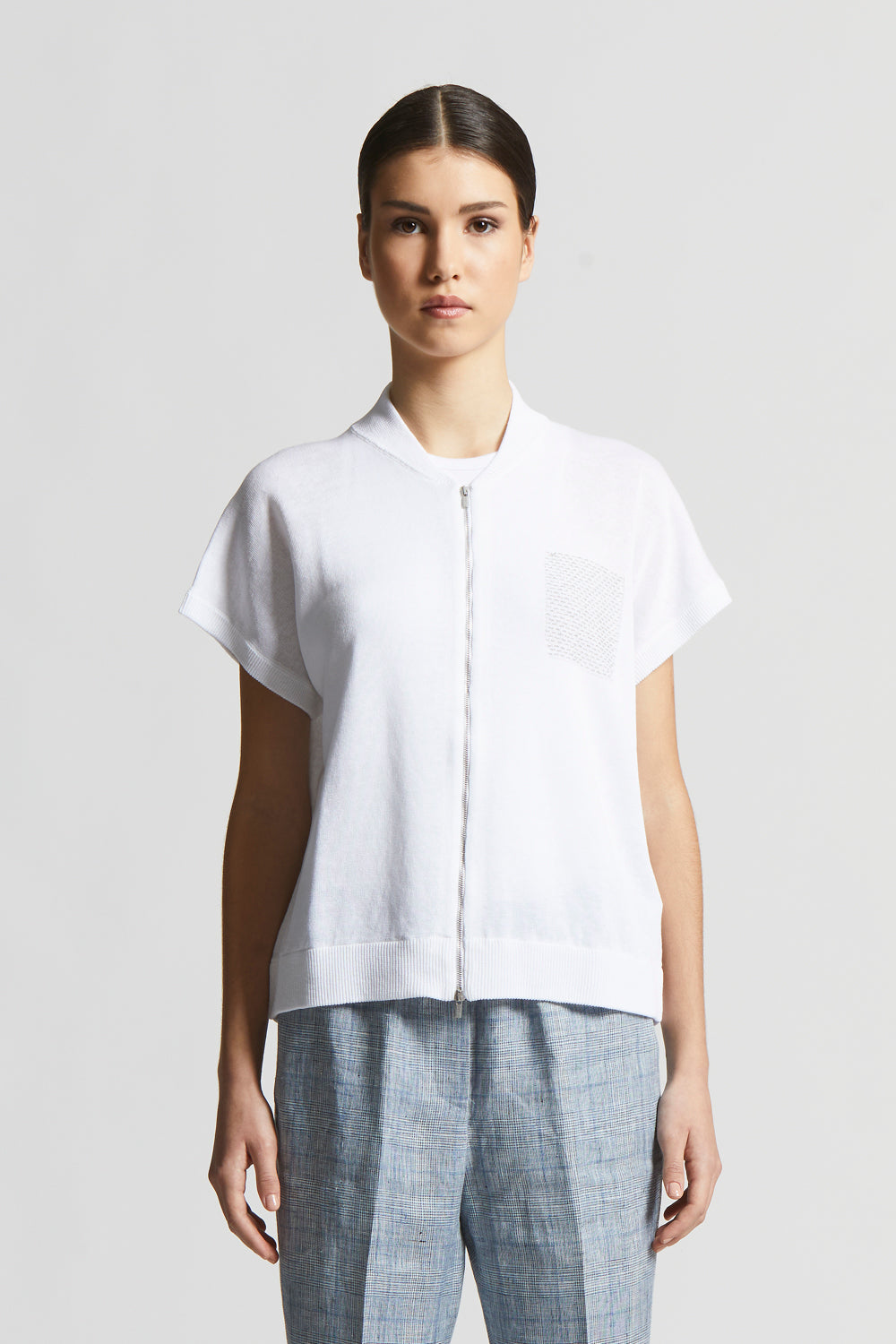 This bomber jacket made of fine linen and cotton yarn feels cool and soft on the skin.The short kimono sleeves and practical visible zip fastening create a modern and versatile style, the ideal choice…