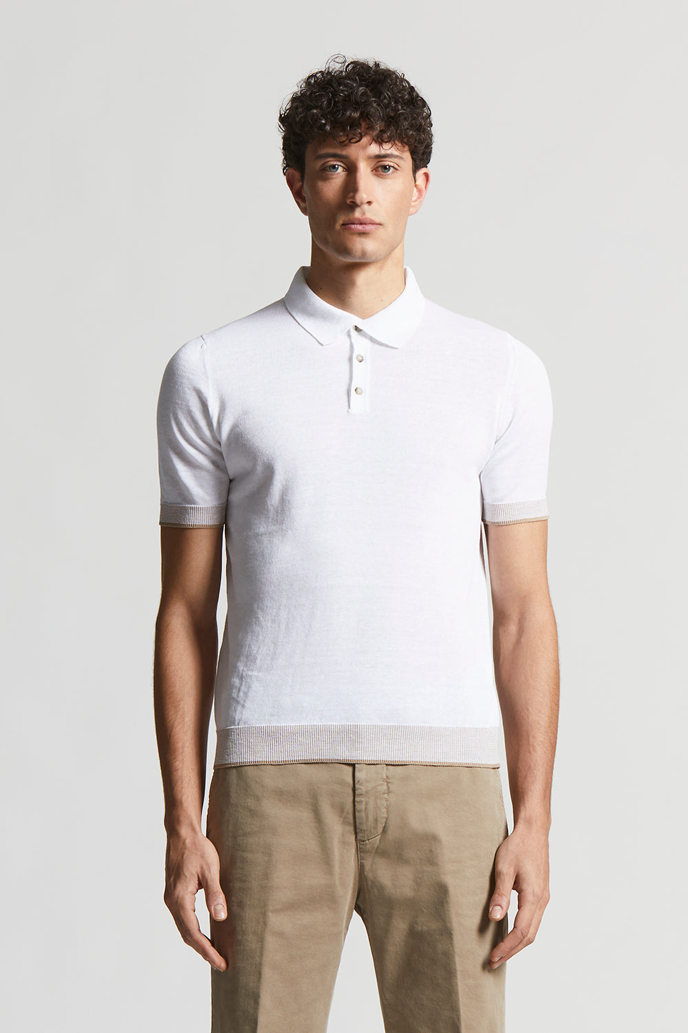 A perfect fusion, this cotton and linen polo shirt is designed for those seeking a versatile garment that exudes personality. Stocking stitch enhances the pure fibres, giving the texture an interplay of light and shade.