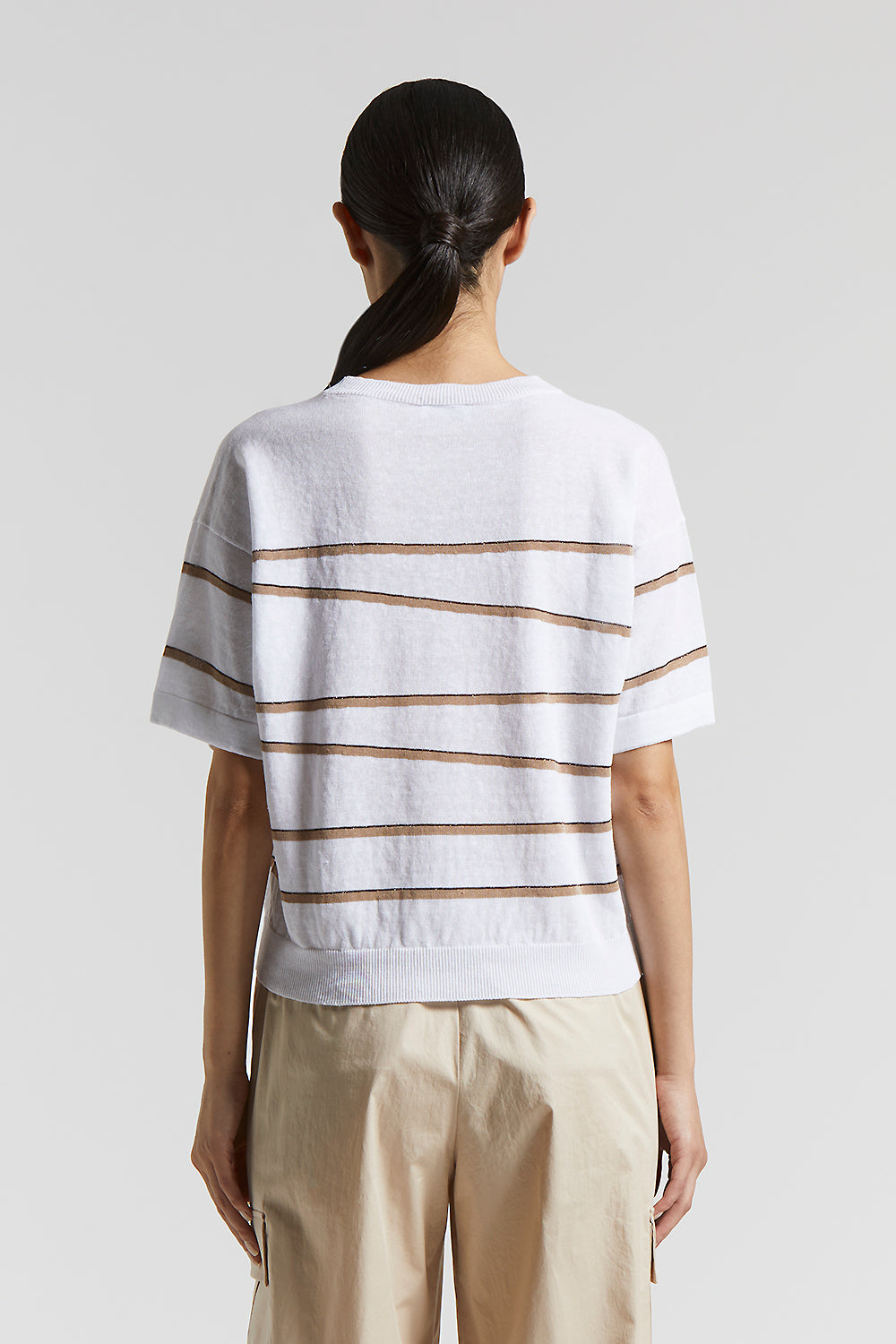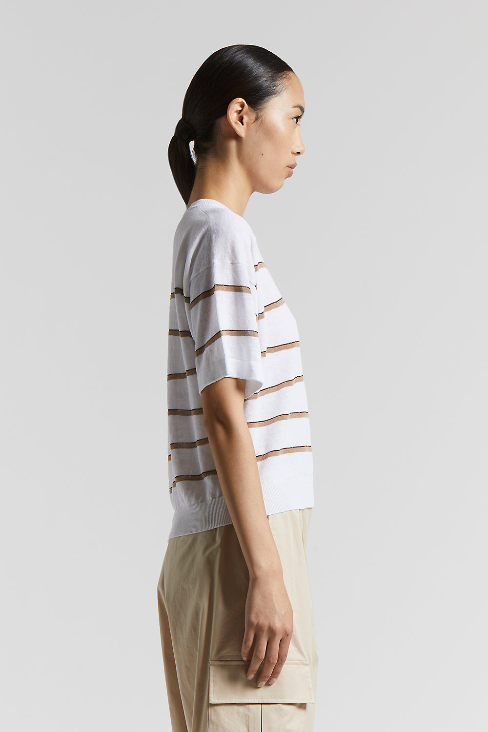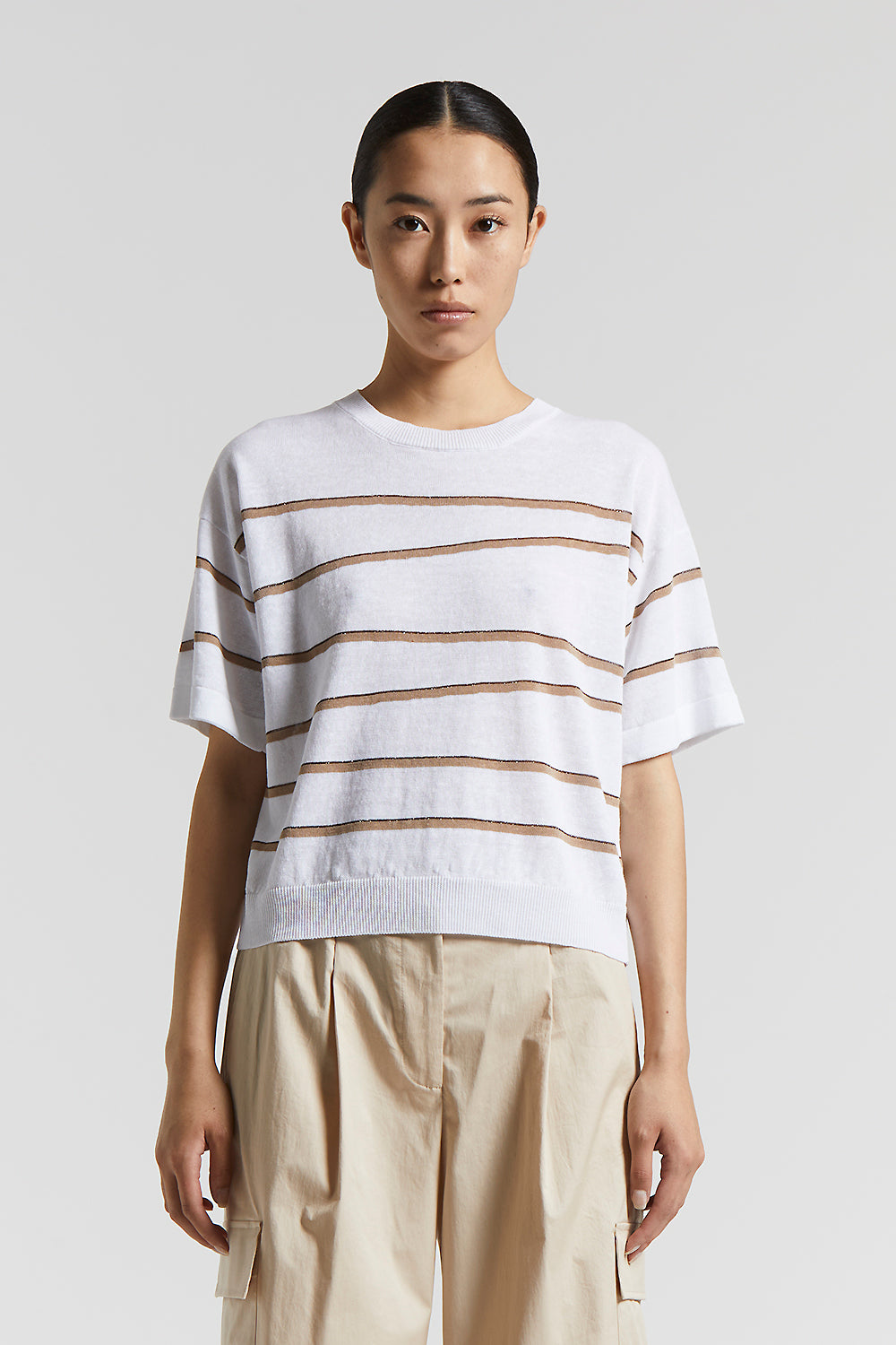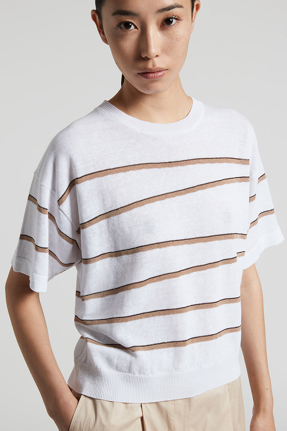 This short-sleeved jersey, made of lightweight linen and cotton crepe yarn, provides a natural cool feel that is perfect for summer.The irregular stripe inserts enriches the design with an original …