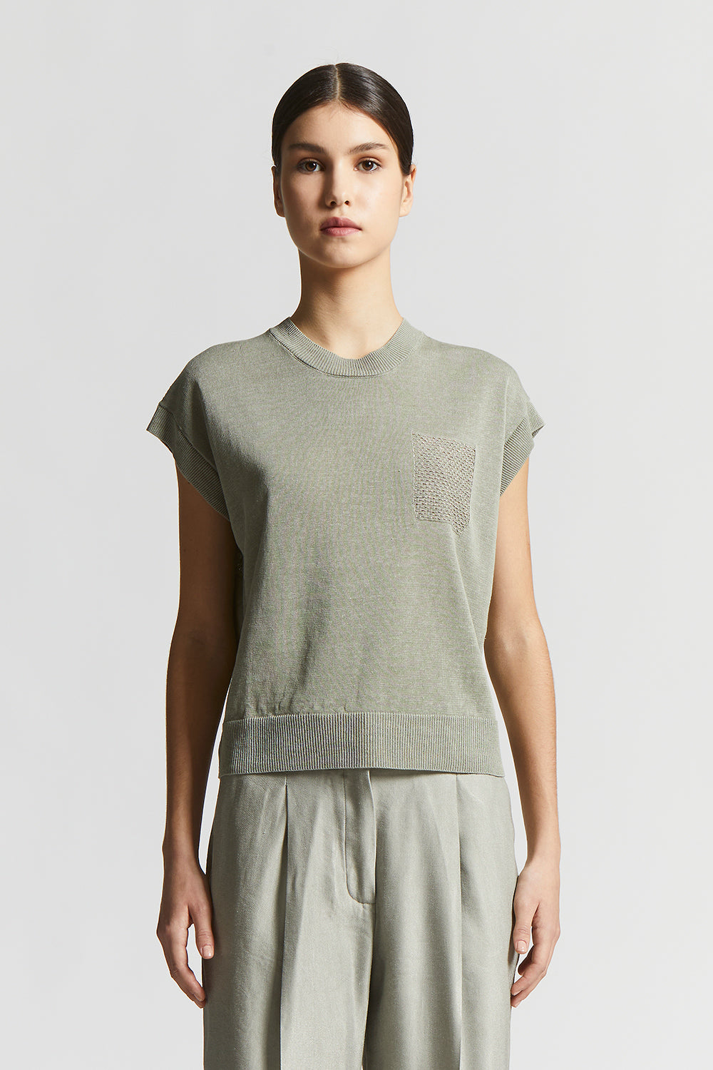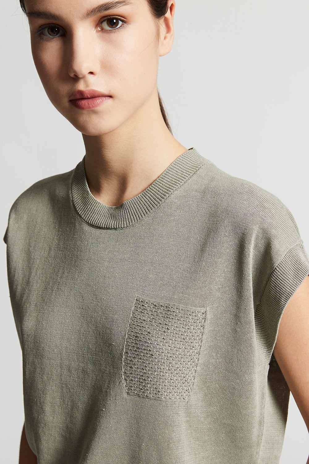 Ideal for a spring or summer day, this kimono-style sweater is made of fine linen and cotton yarn, which ensures cool breathability.The iconic Punto Luce on the patch pocket adds a touch of bright ele…