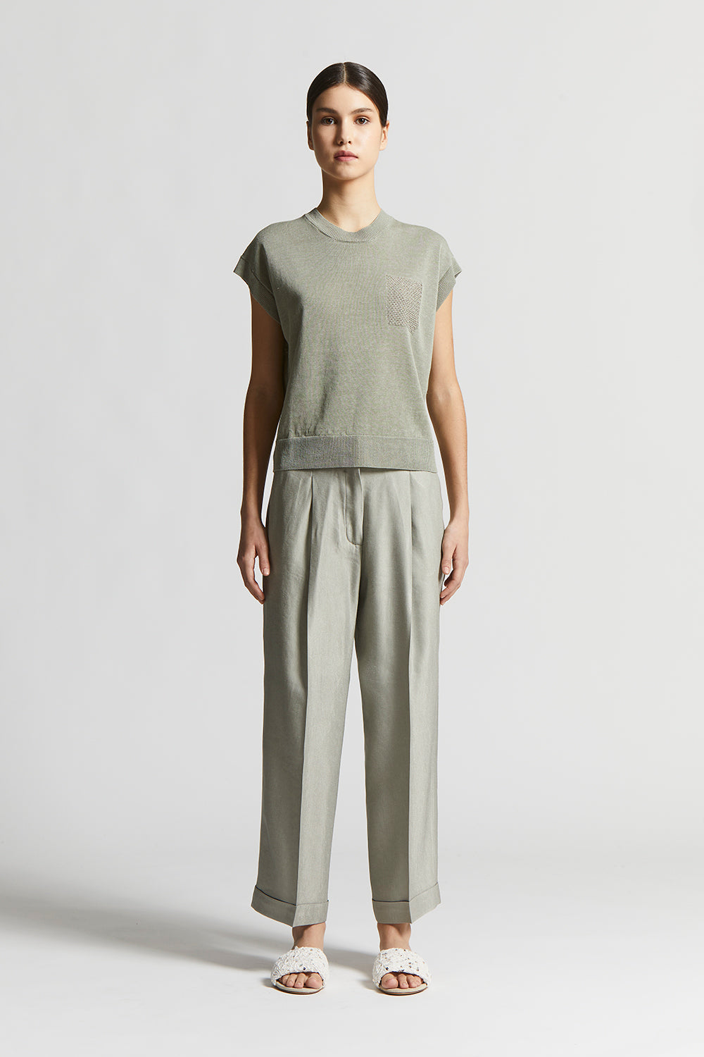The iconic Punto Luce on the patch pocket adds a touch of bright elegance for a versatile sweater that also complements an evening outfit.