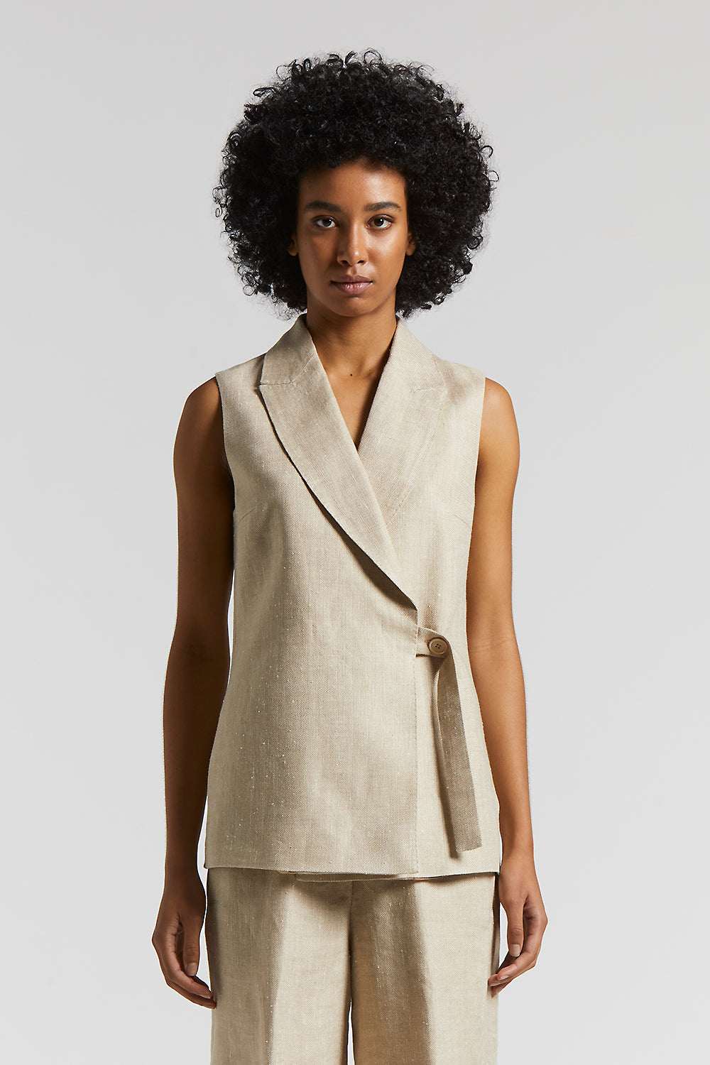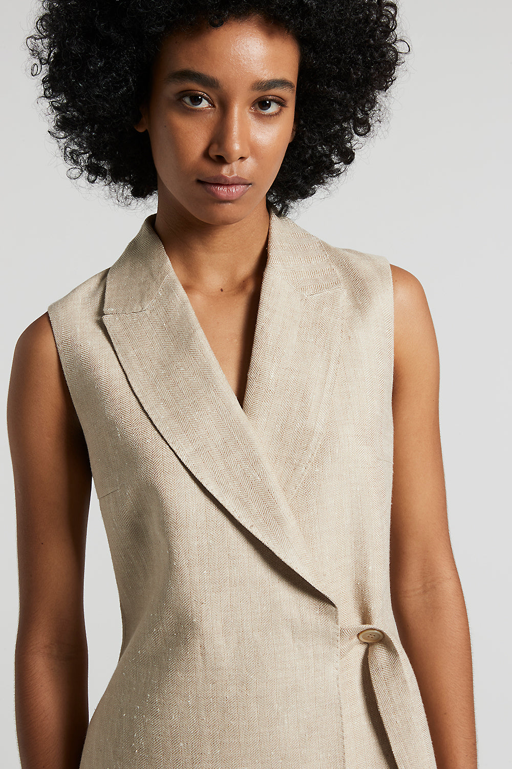 This double-breasted waistcoat, with viscose lining, is made of yarn-dyed nubby herringbone fabric, which combines the coolness of linen with the delicacy of silk.