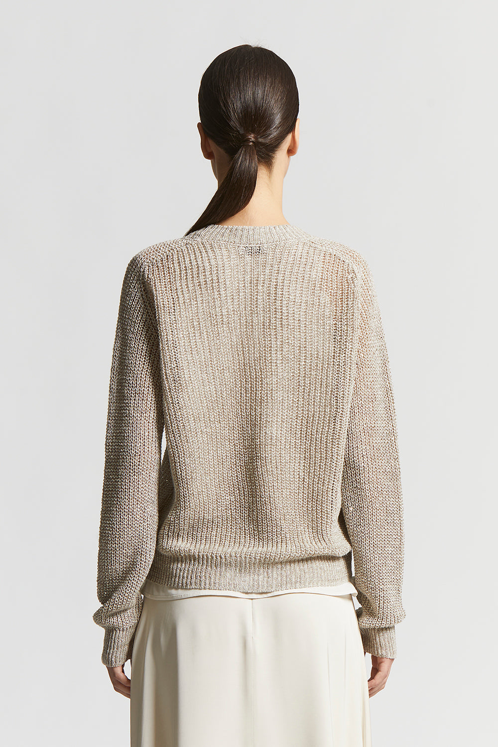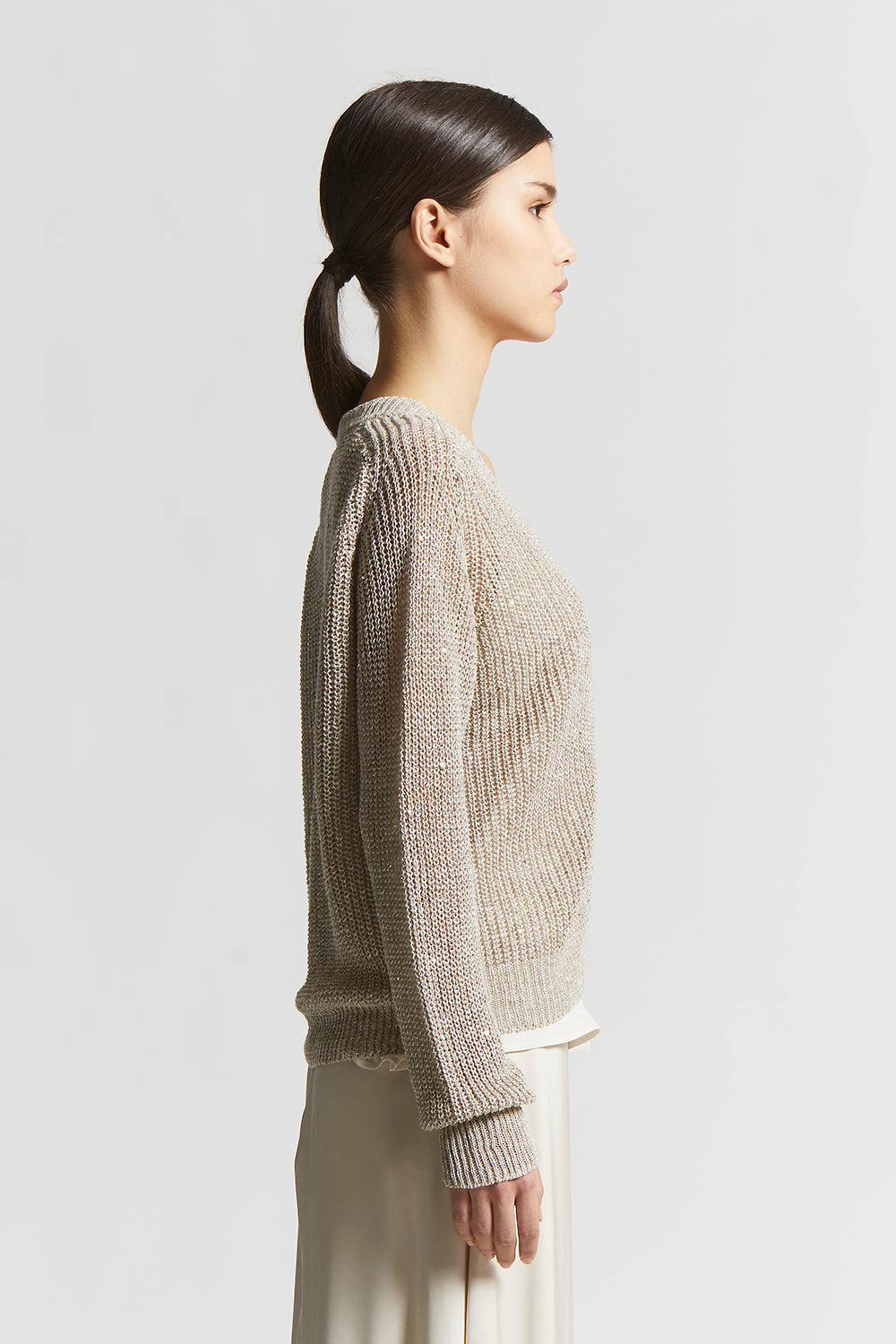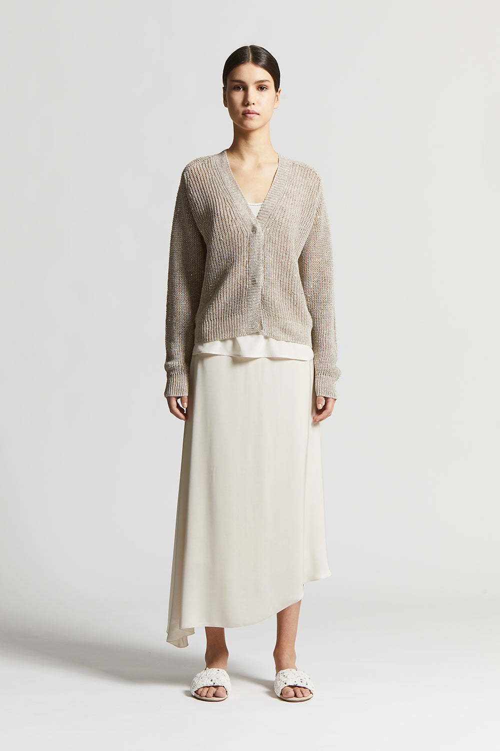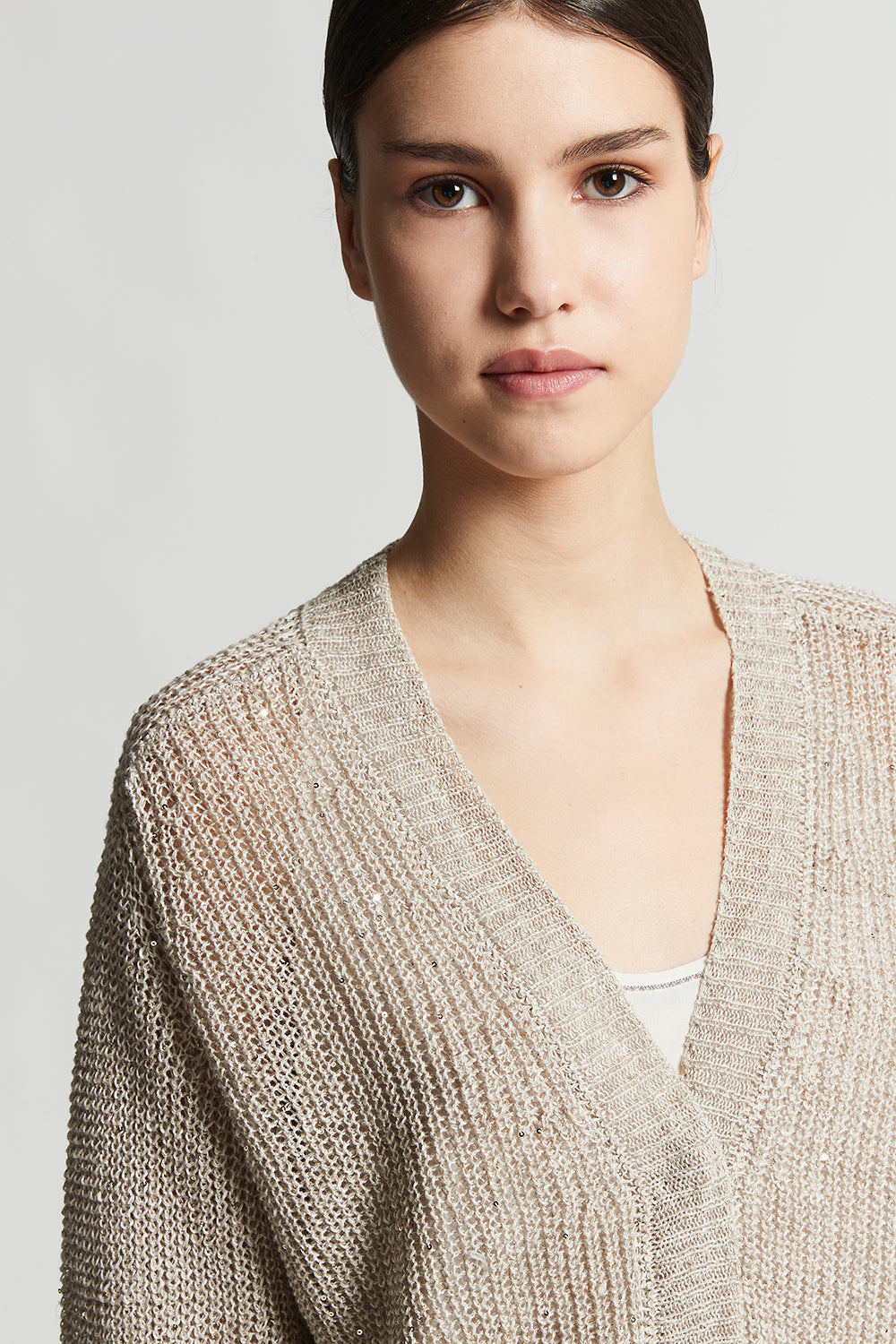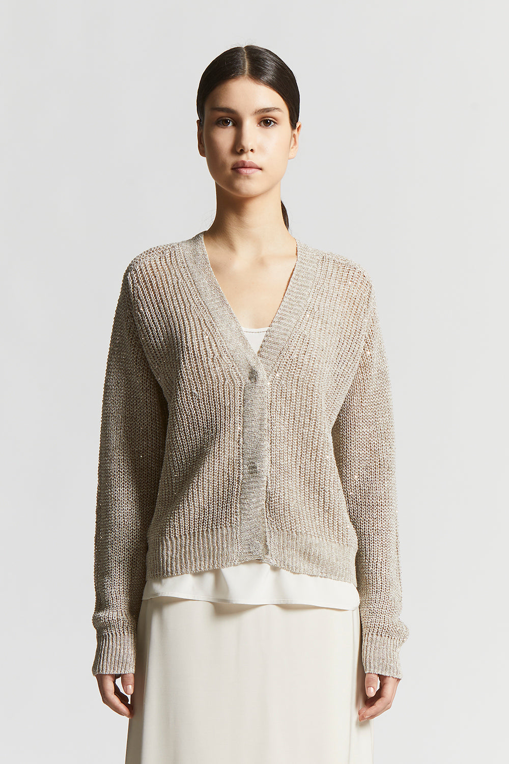 This tricot cardigan is made of fine linen yarn and embellished with sequins, which add a touch of class and a delicate glow.