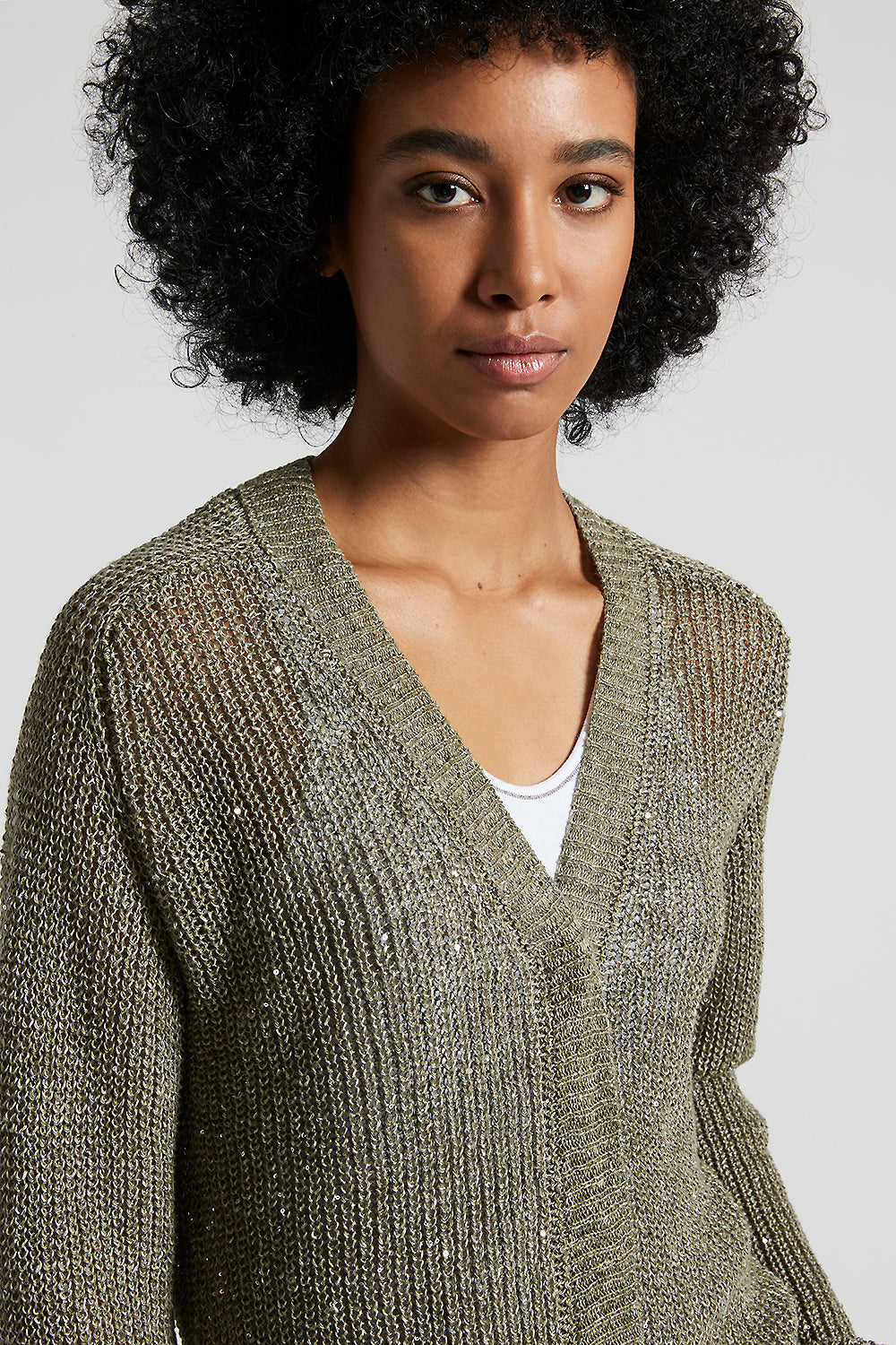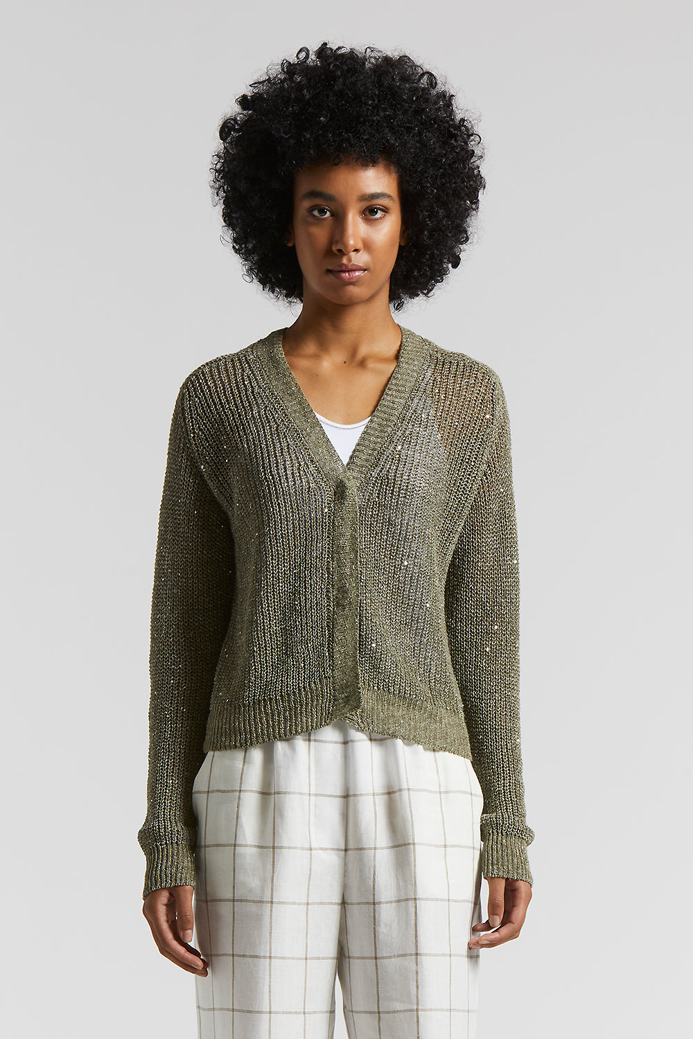 This tricot cardigan is made of fine linen yarn and embellished with sequins, which add a touch of class and a delicate glow.