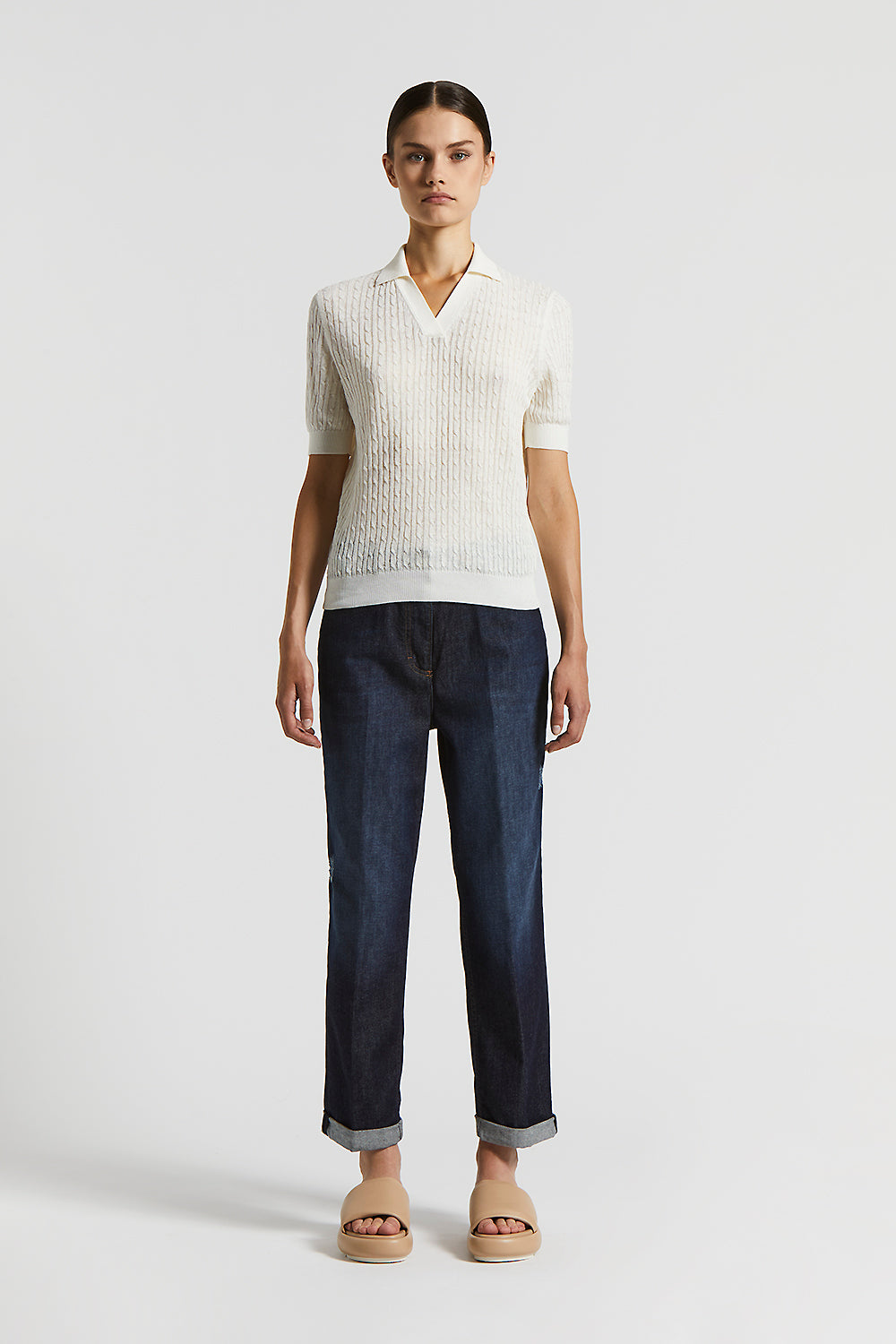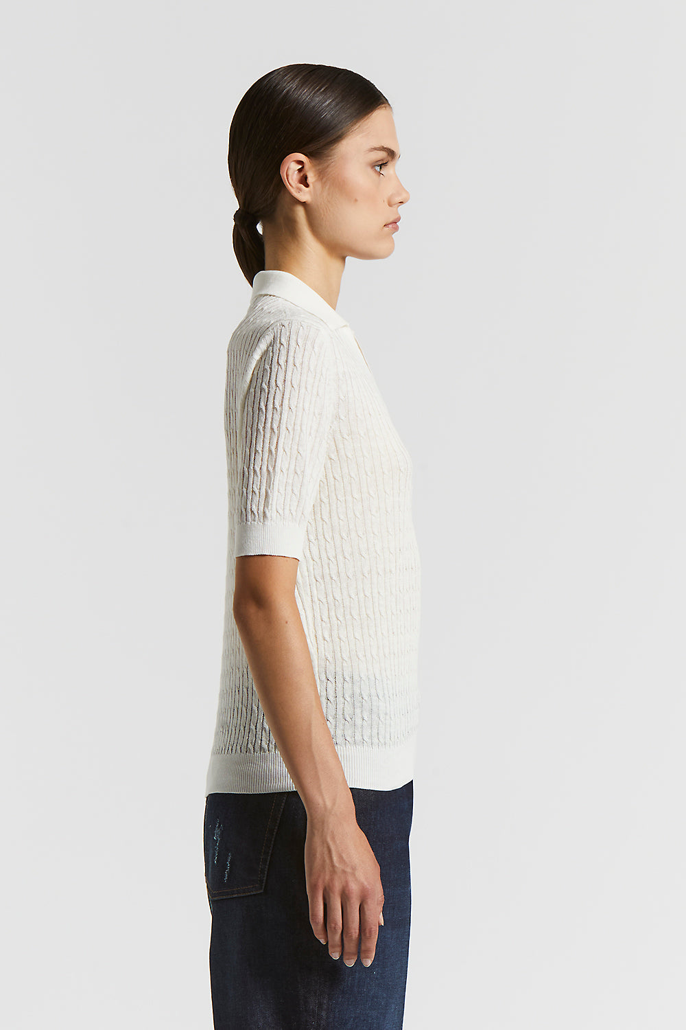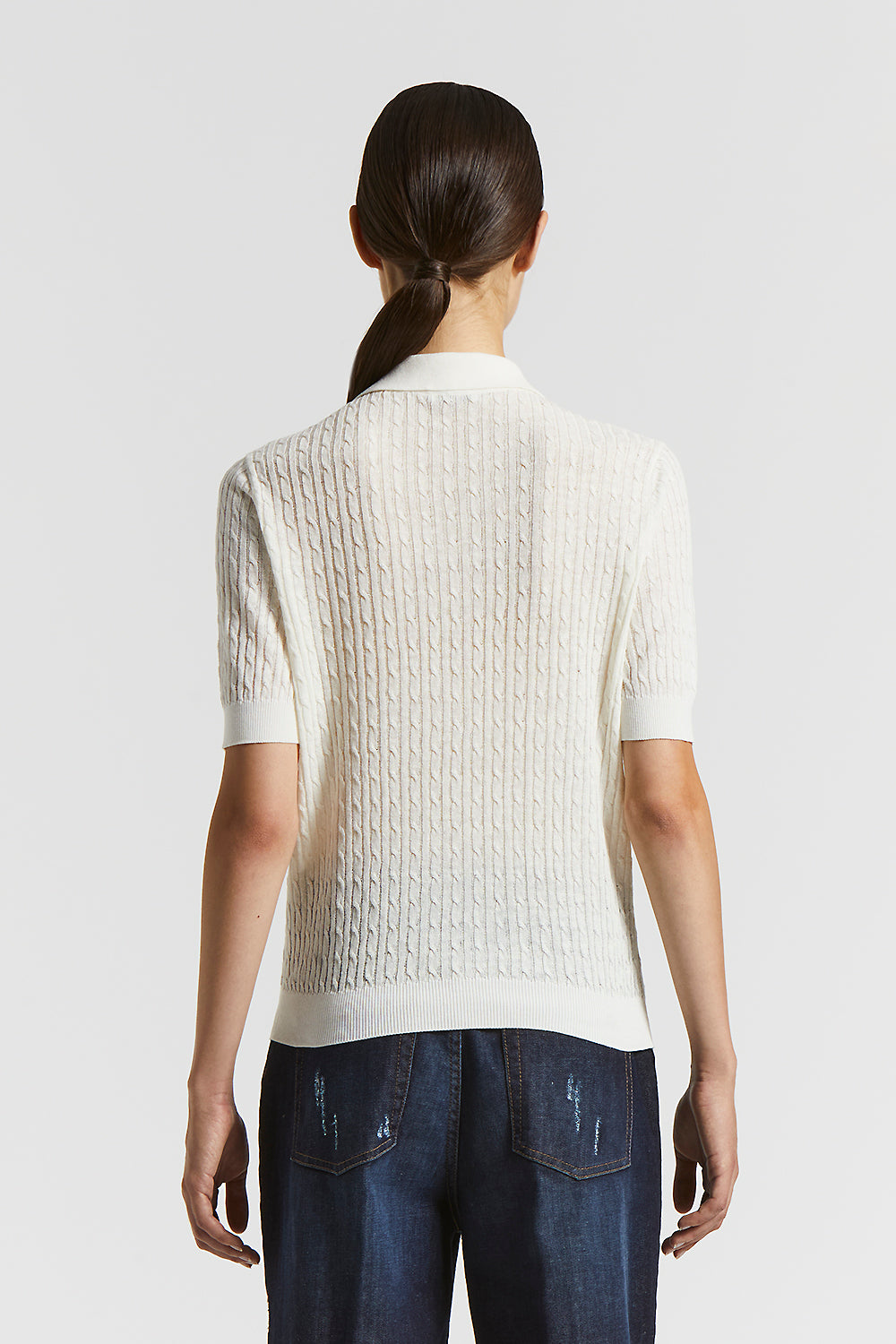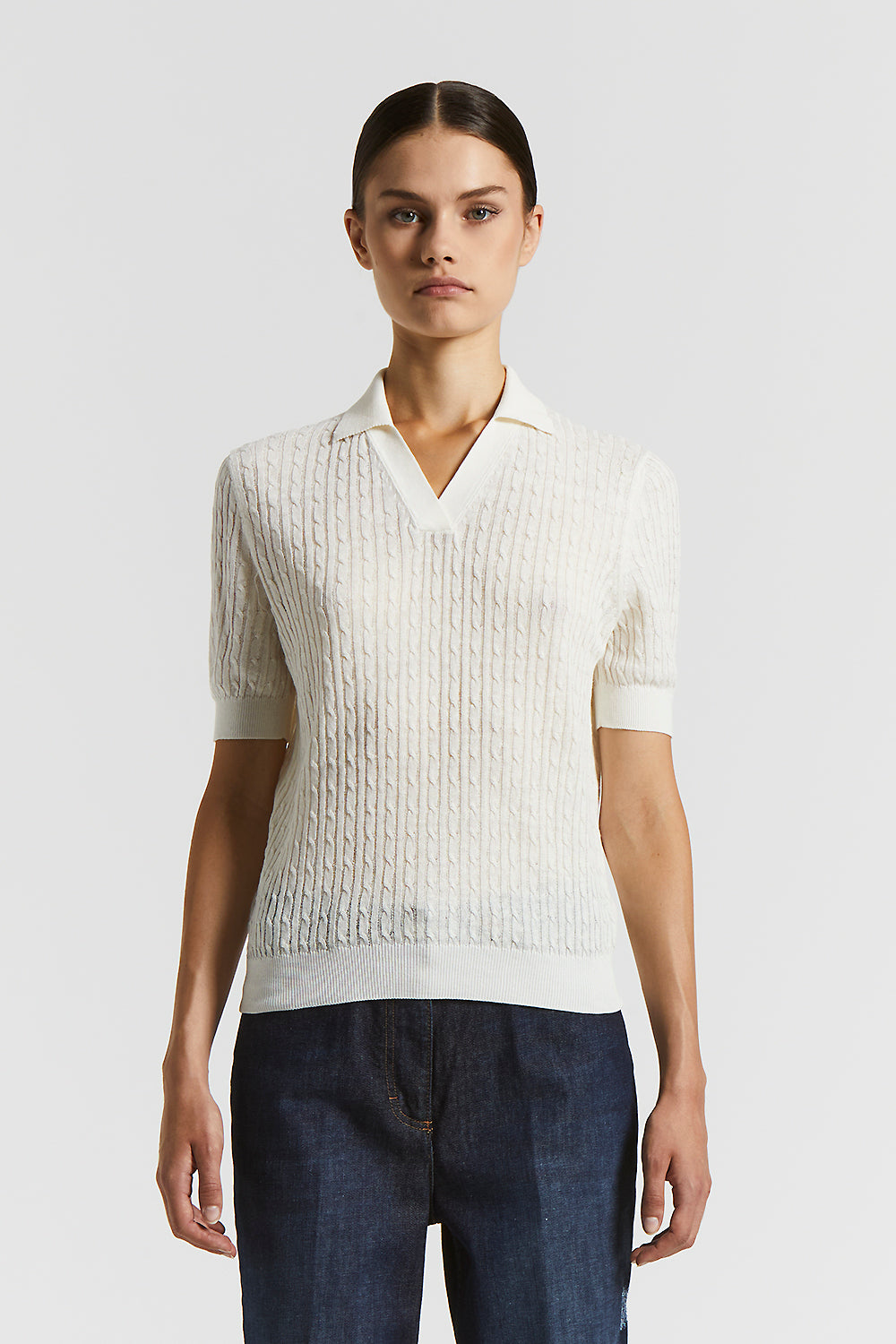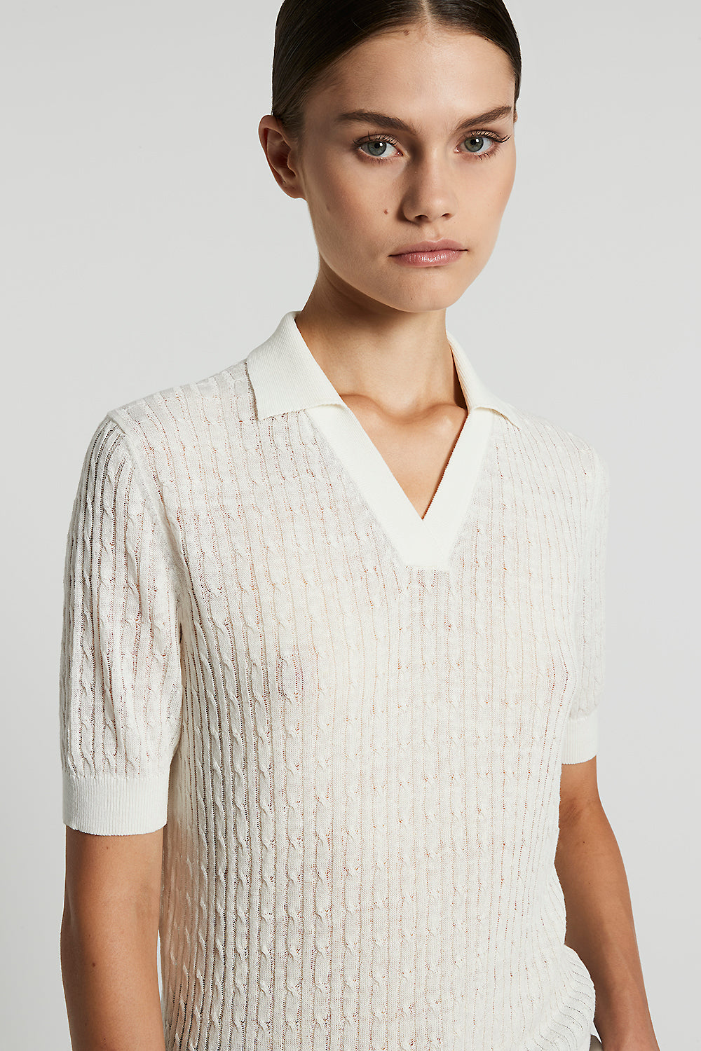 This tricot polo shirt, with an open collar and short sleeves, is made of melange linen cotton crepe yarn. It features an elegant rib and cable knit that endows the sweater with a sophisticated 3D look.