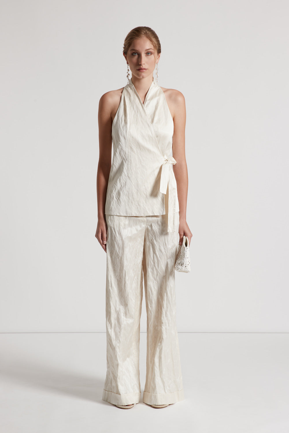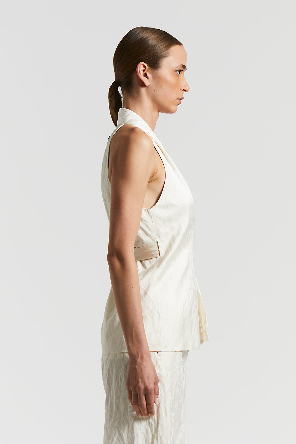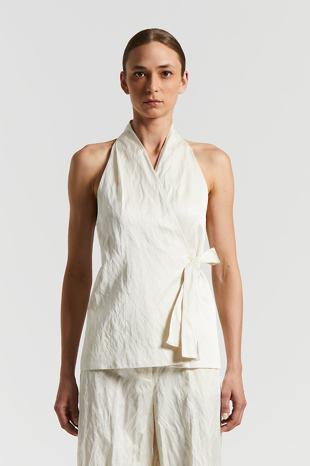 With contemporary aesthetics, this cotton linen crushed satin waistcoat is a must-have for those who wish to stand out with style and elegance.With a crossover halter neck, it presents an essential de…