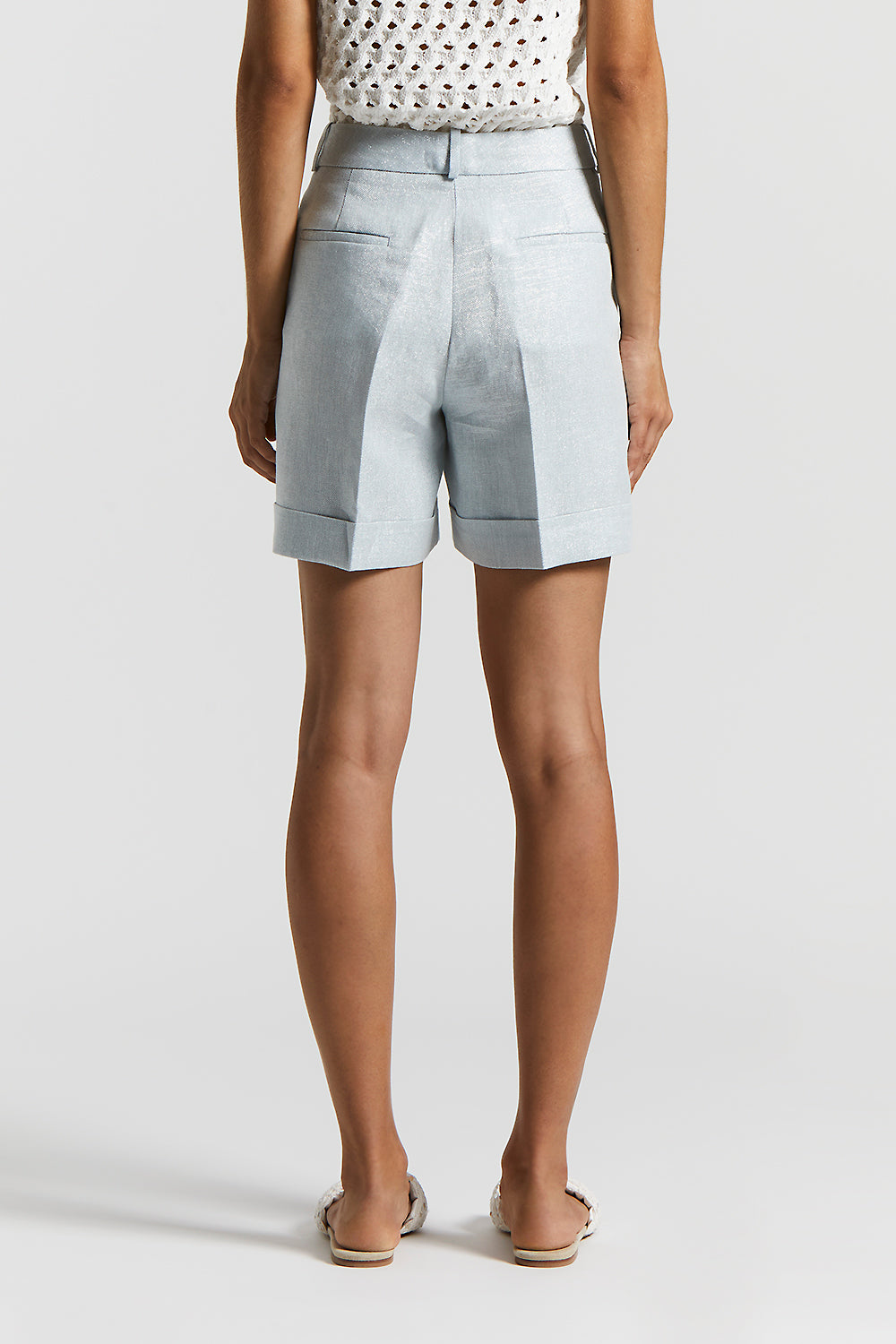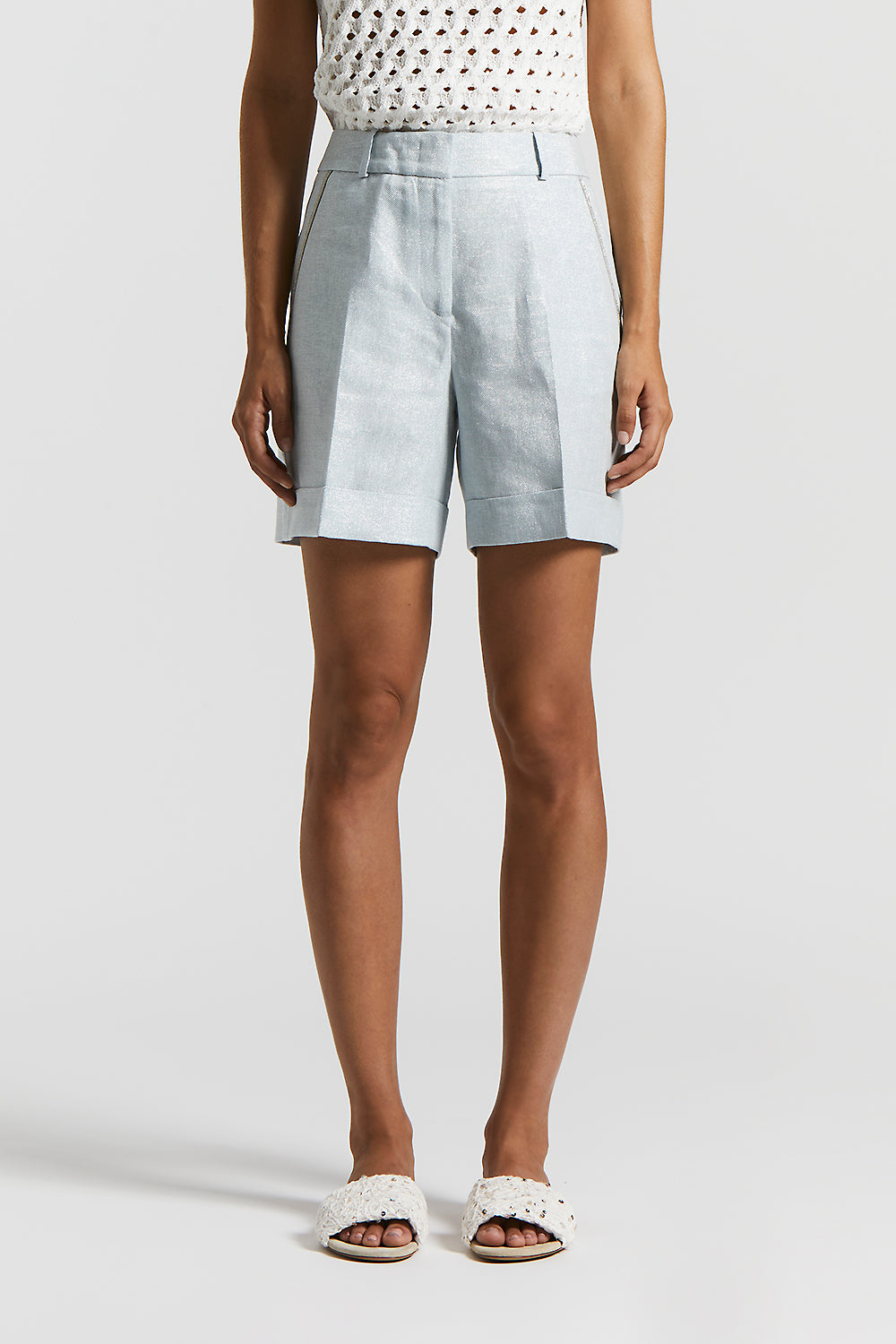 Shorts in metallic linen and cotton Lurex weave with a crisp effect that endows the fabric with structure and character.
