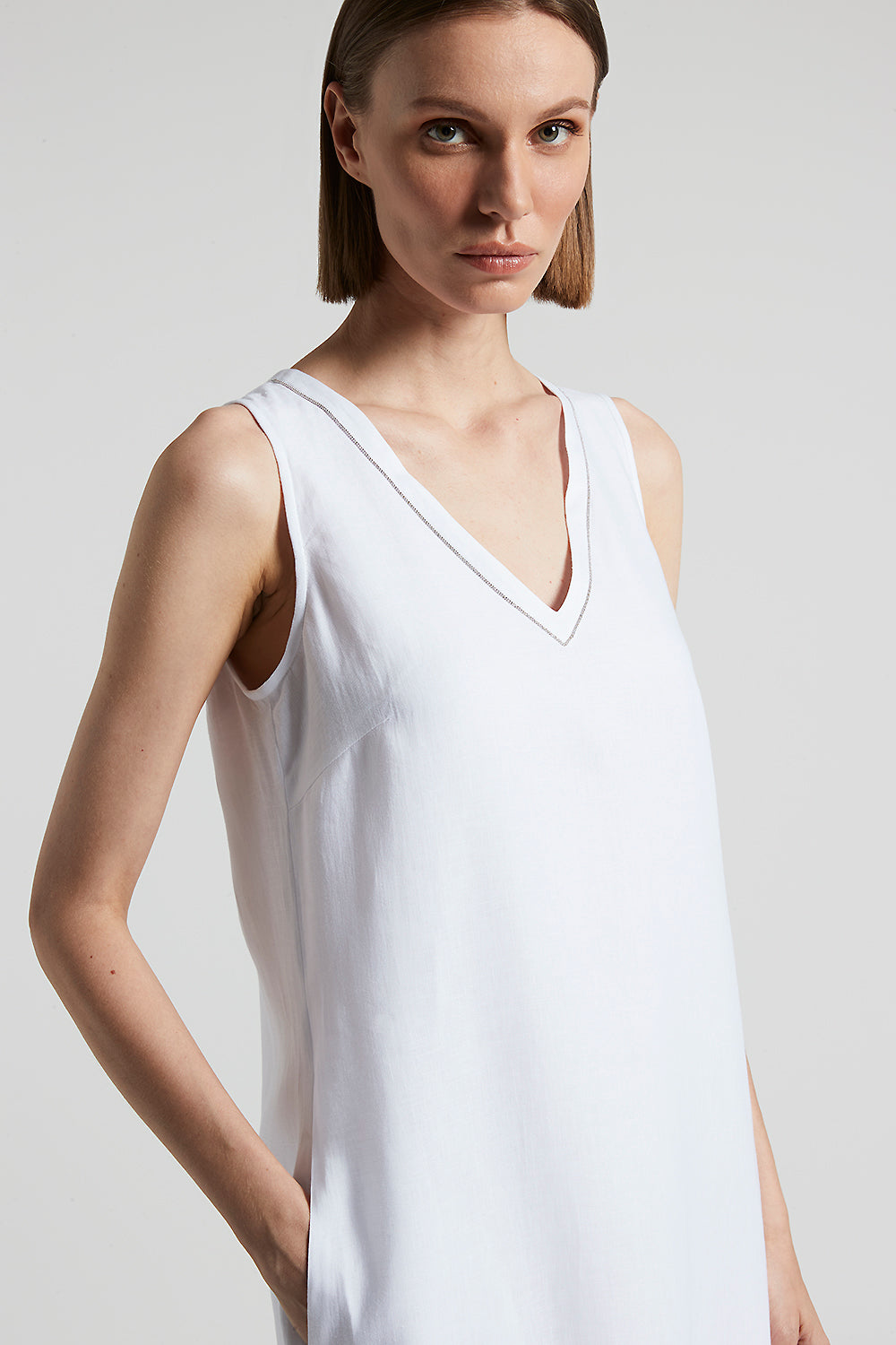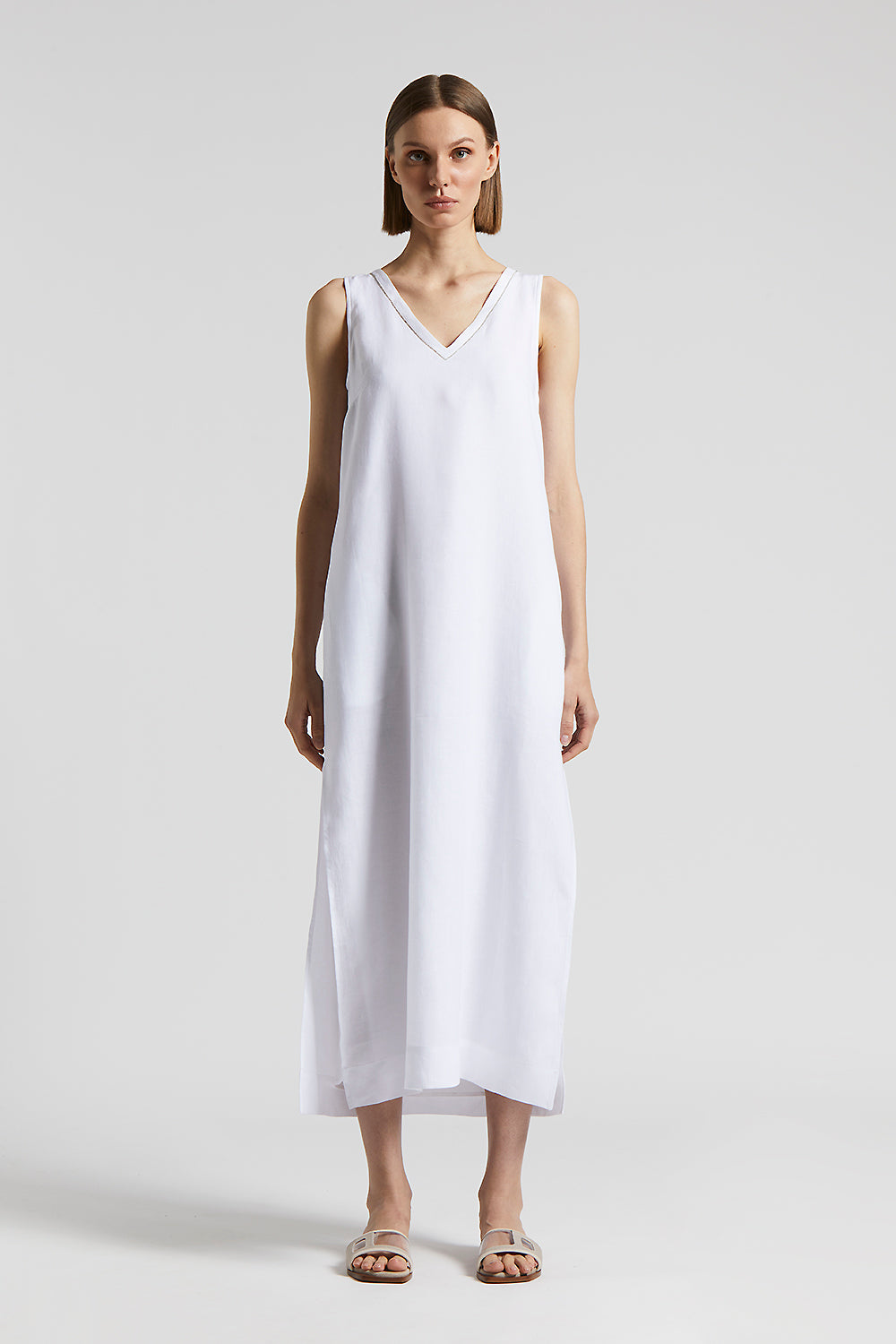 Made of cool pure linen, this sleeveless long dress is a perfect synthesis of elegance and comfort.The V-neckline, embellished with a refined Punto Luce detail adds brightness and style to the garment…