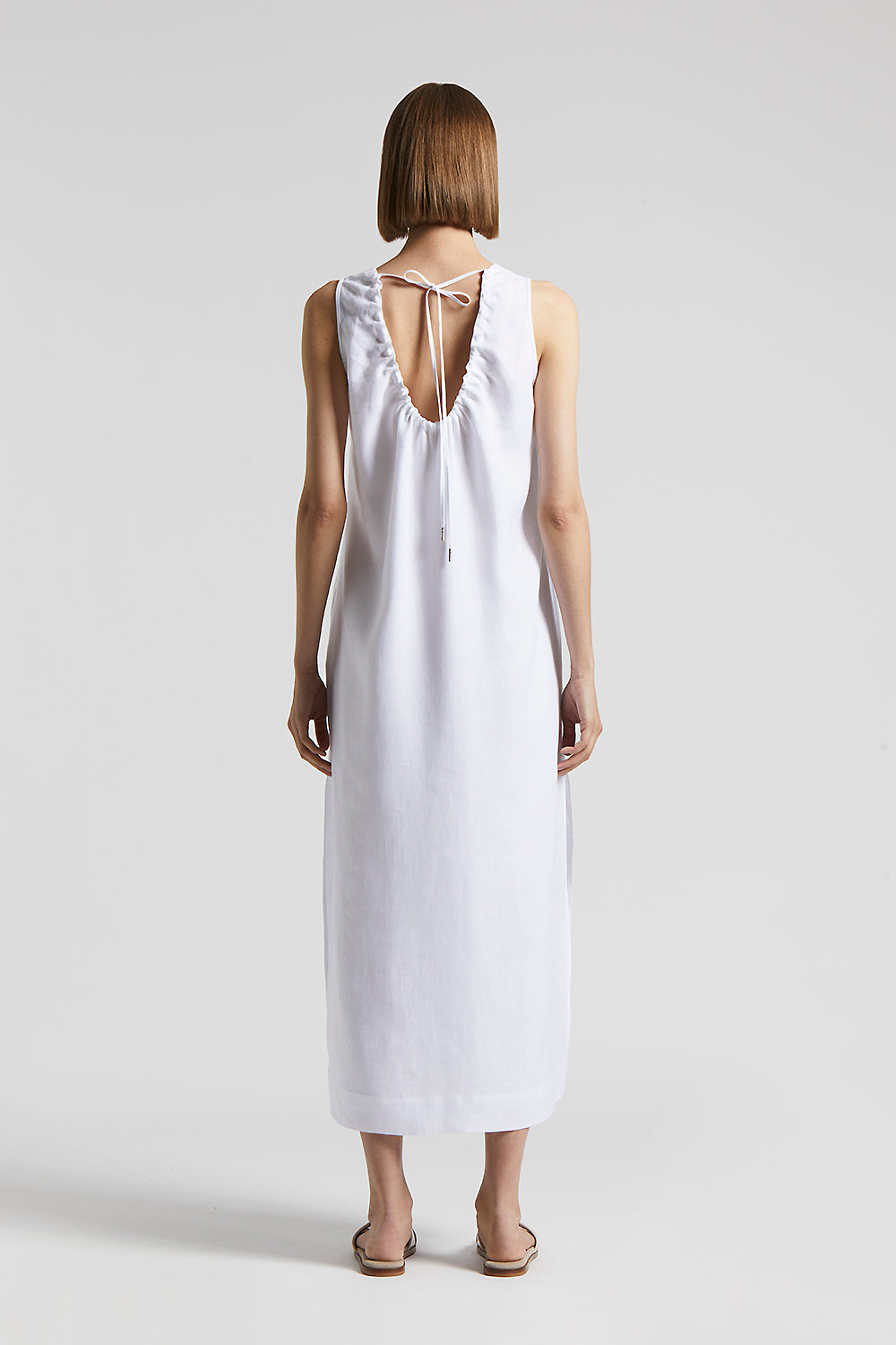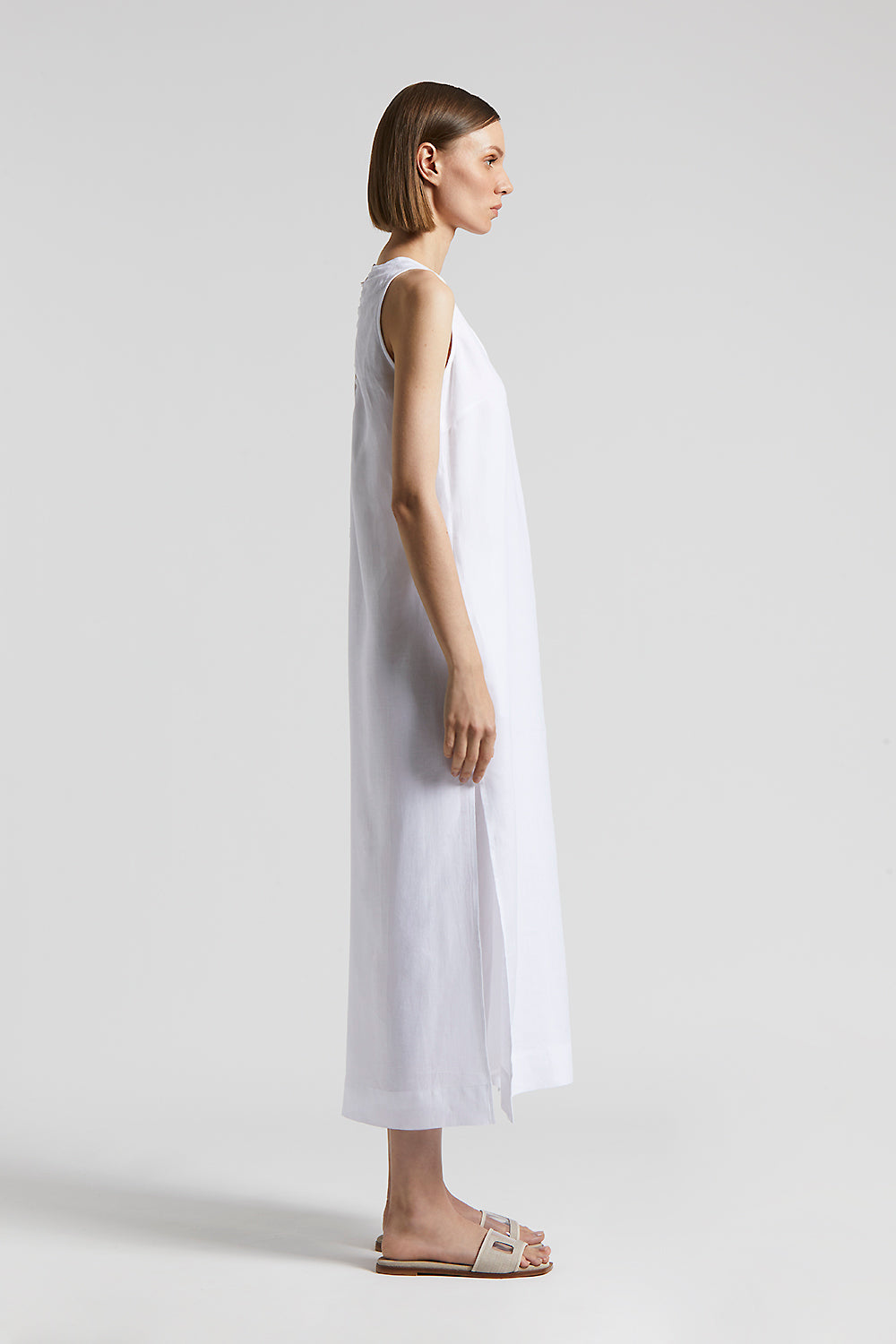 Made of cool pure linen, this sleeveless long dress is a perfect synthesis of elegance and comfort.