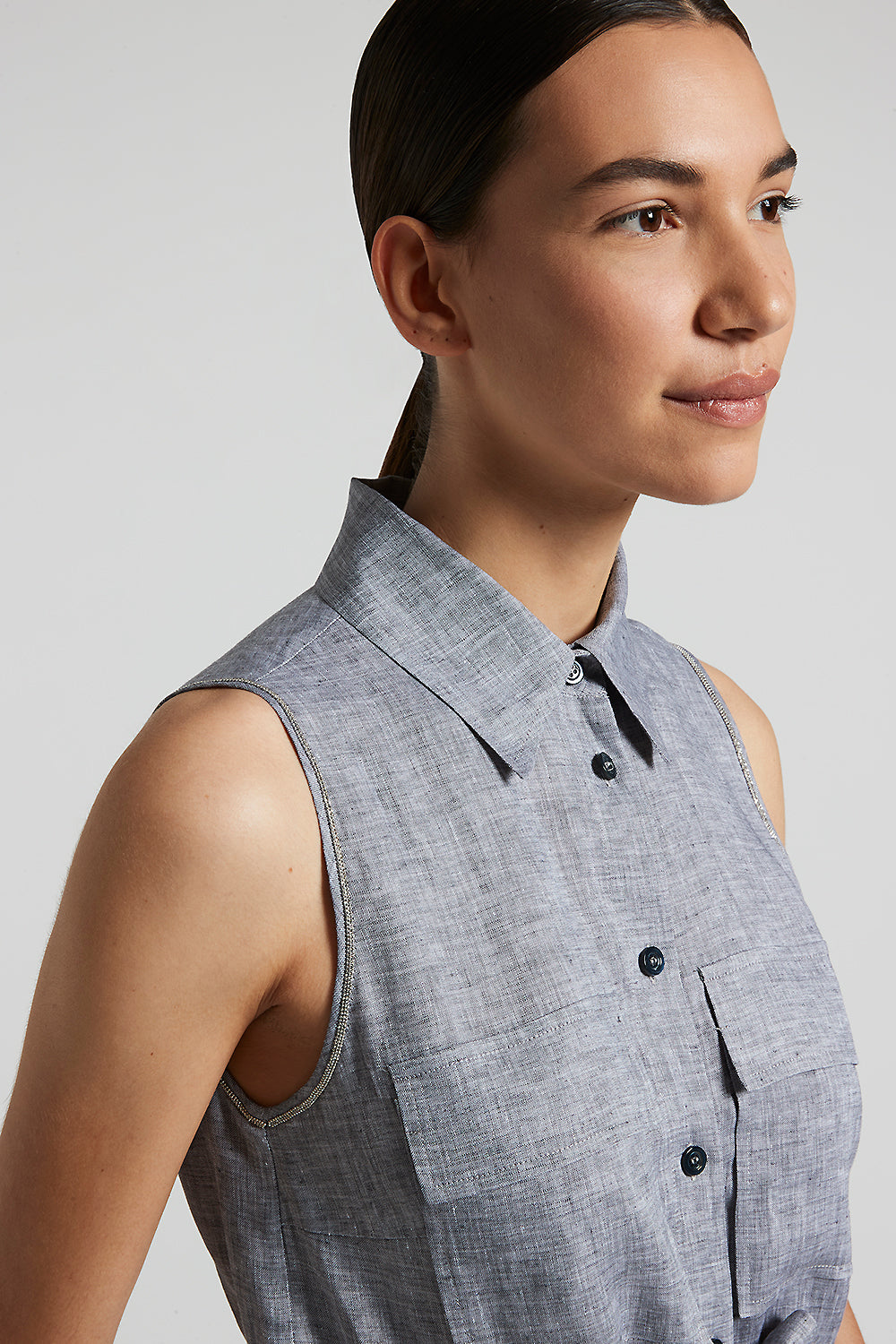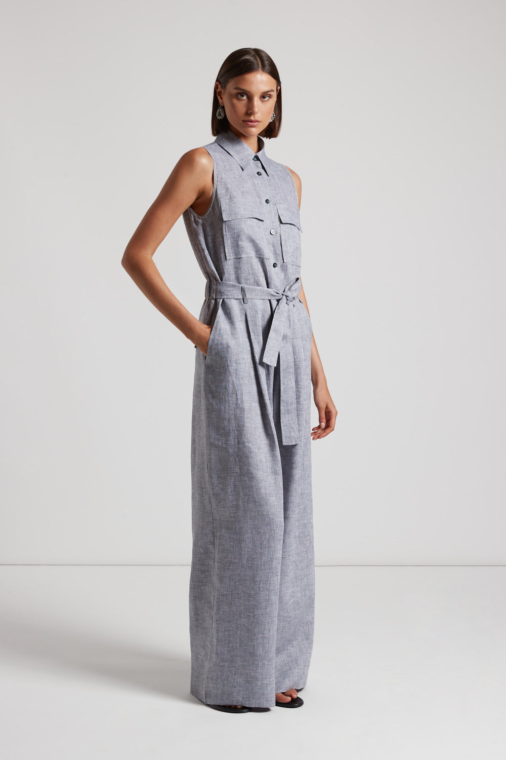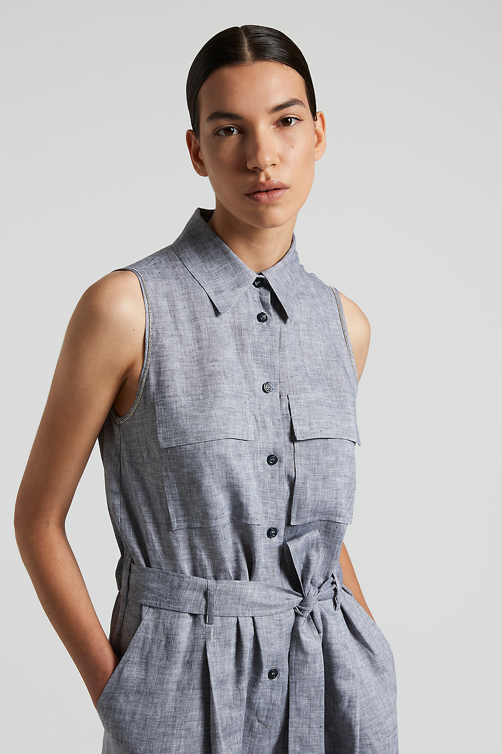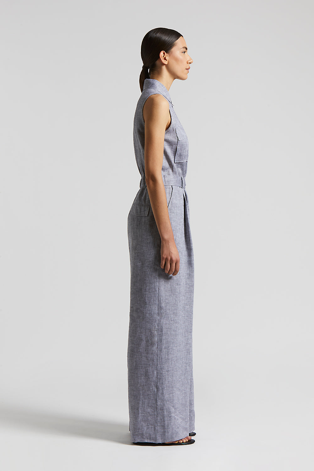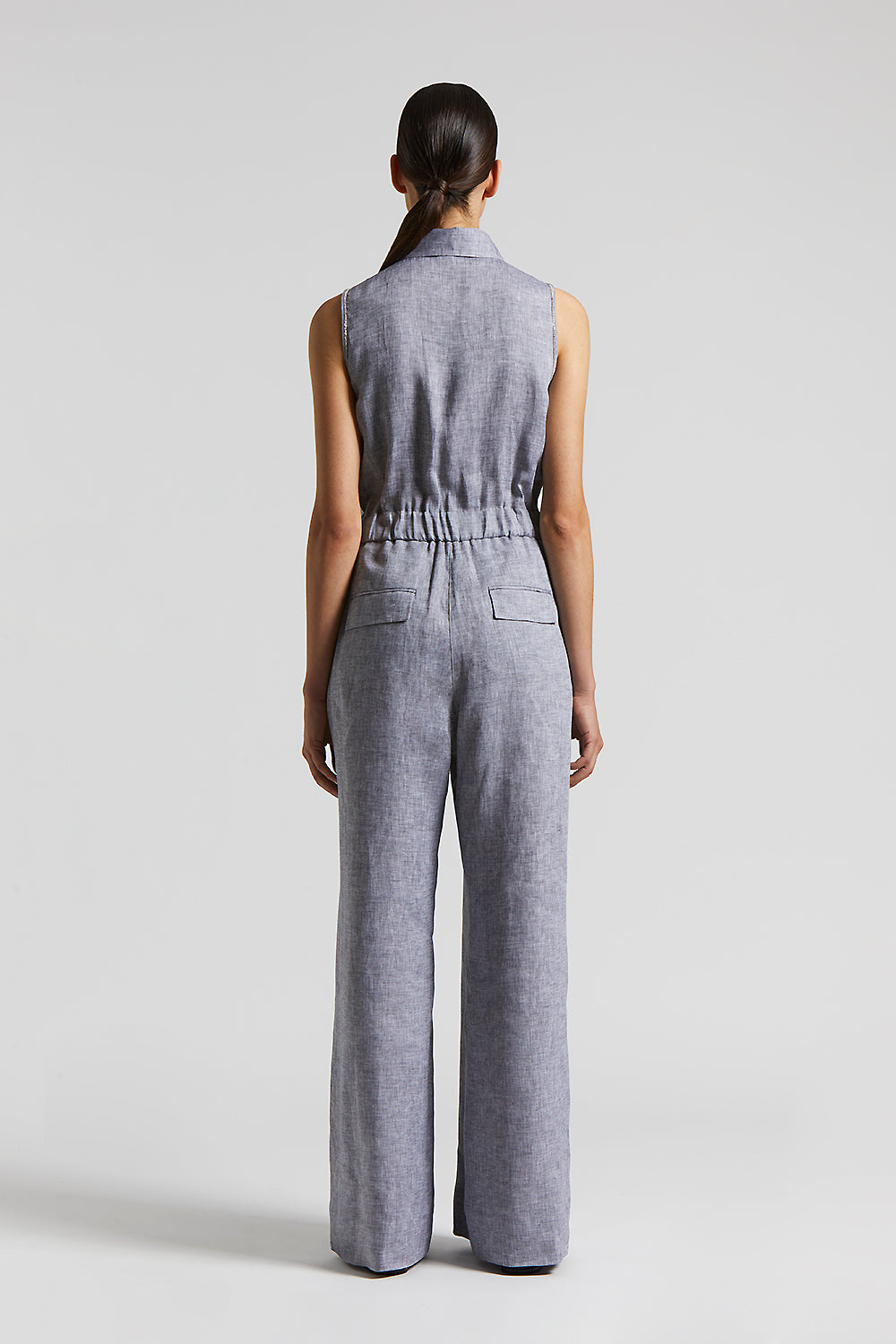 This jumpsuit in cool pure linen is a garment of absolute elegance and versatility. The cutaway armholes and shirt collar give the garment a refined and contemporary touch.