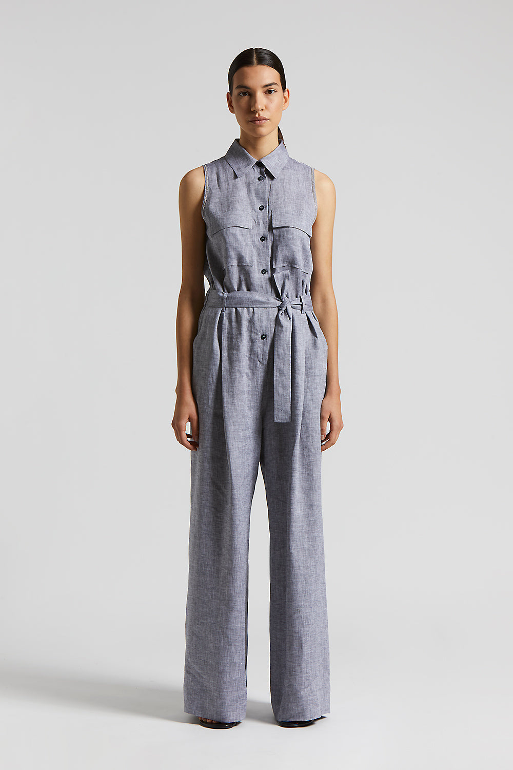 This jumpsuit in cool pure linen is a garment of absolute elegance and versatility. The cutaway armholes and shirt collar give the garment a refined and contemporary touch.Flap patch pockets on the ch…