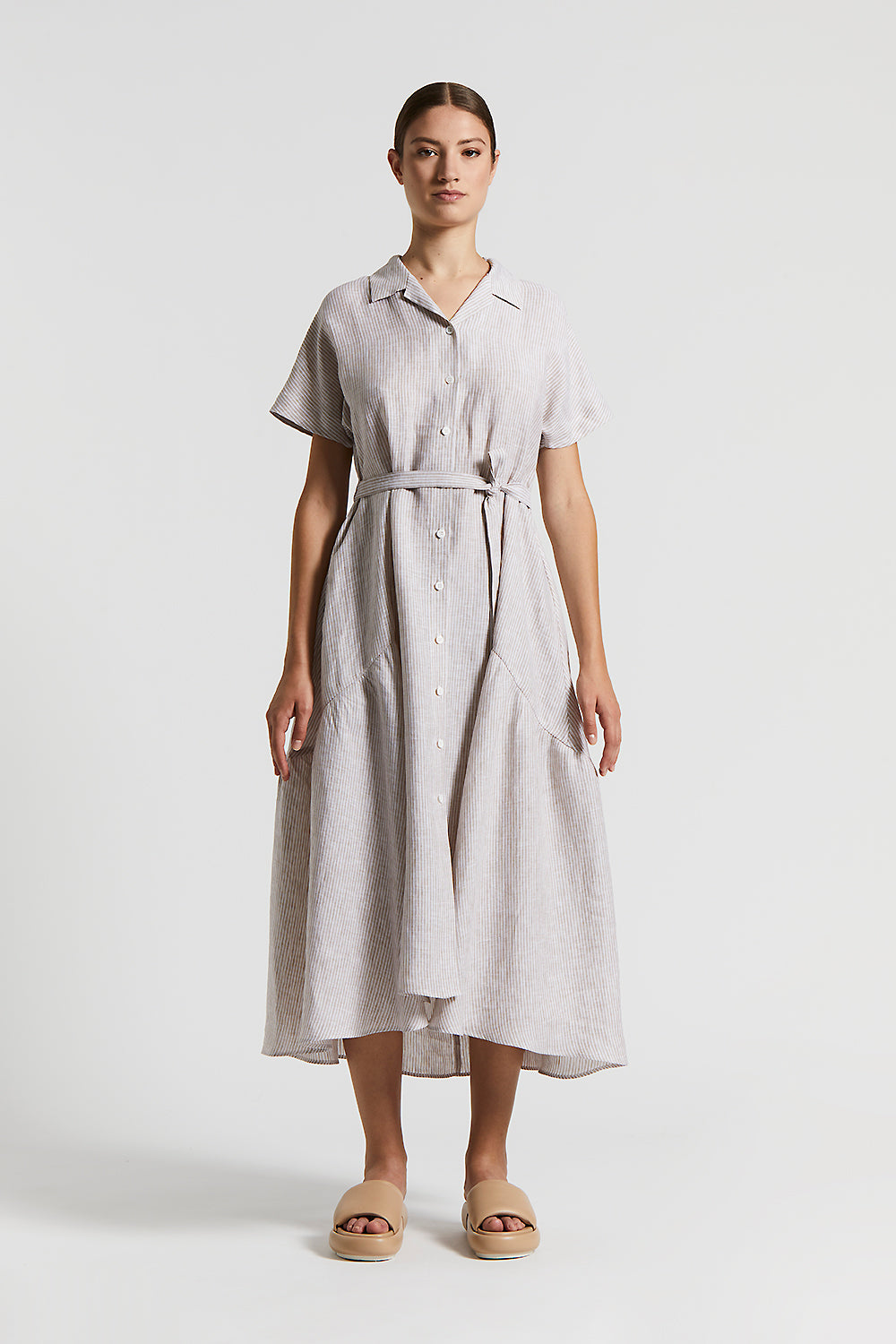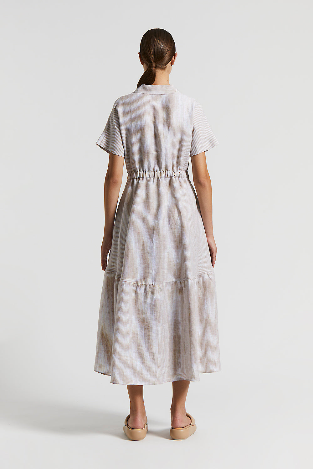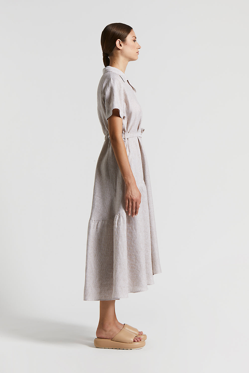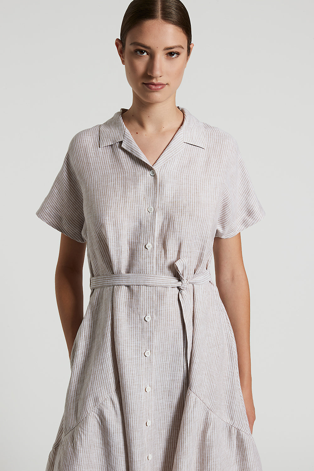 Elegant and cool, this midi dress in pure two-tone striped linen is characterised by its refined and versatile style. The collar and polo shirt placket lend a touch of casual elegance.