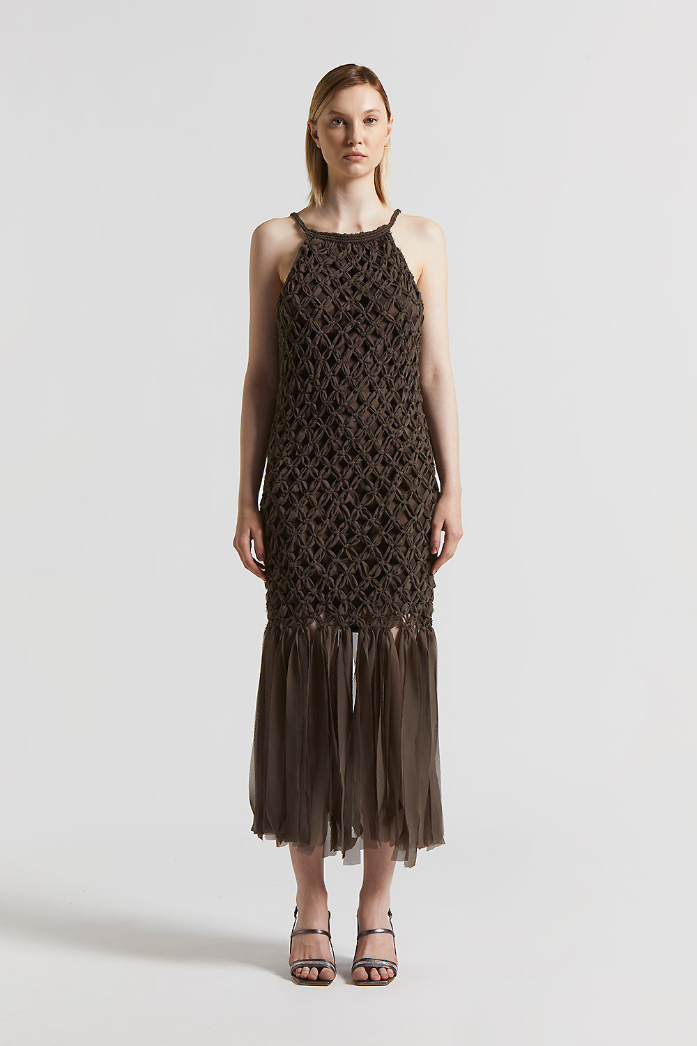 This long dress in lightweight chiffon is the perfect combination of comfort and style. The woven design gives the garment a distinctive touch.The halterneck enhances the shoulders, while the fringes …