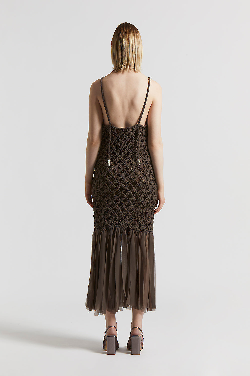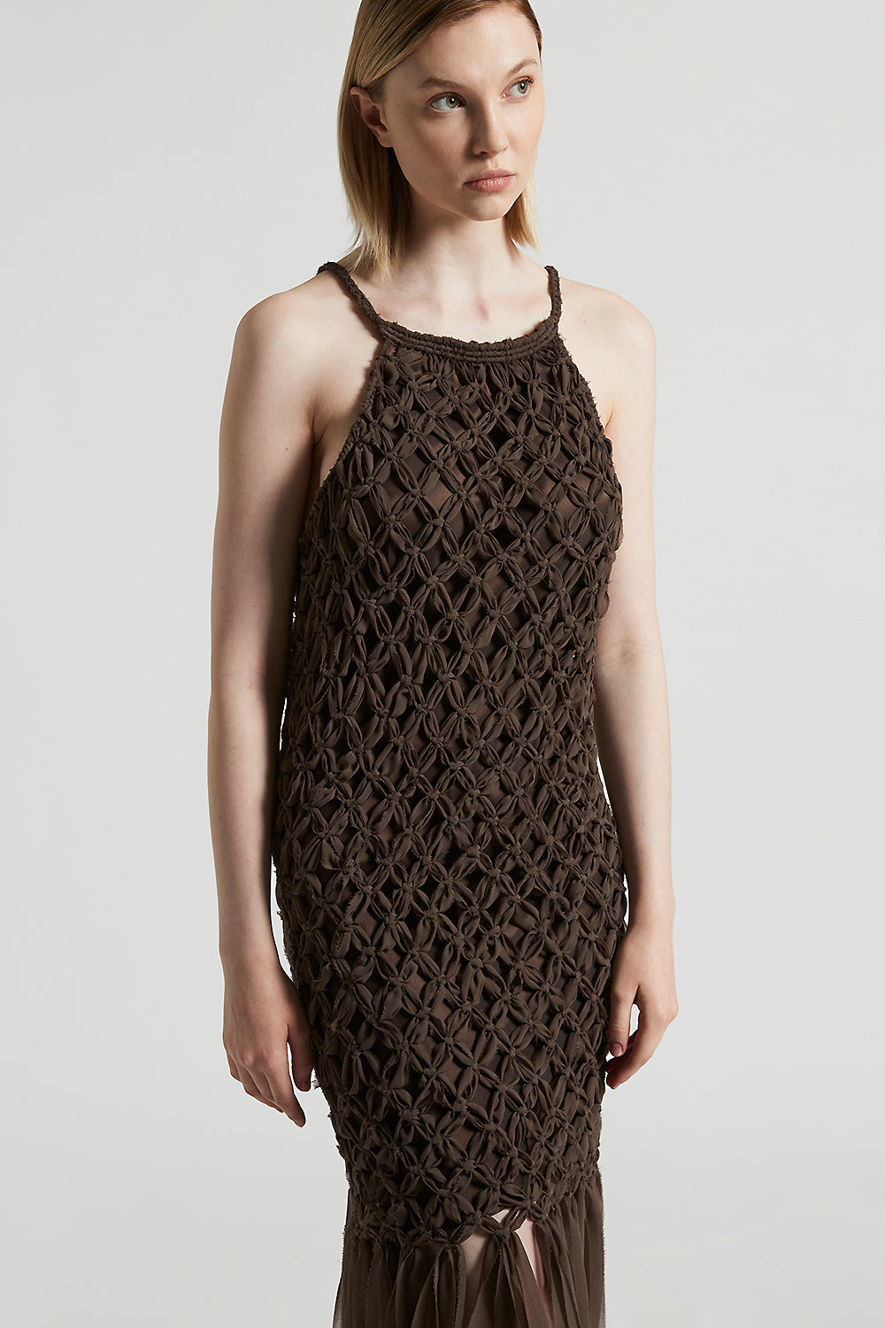The halterneck enhances the shoulders, while the fringes on the hem add dynamism.