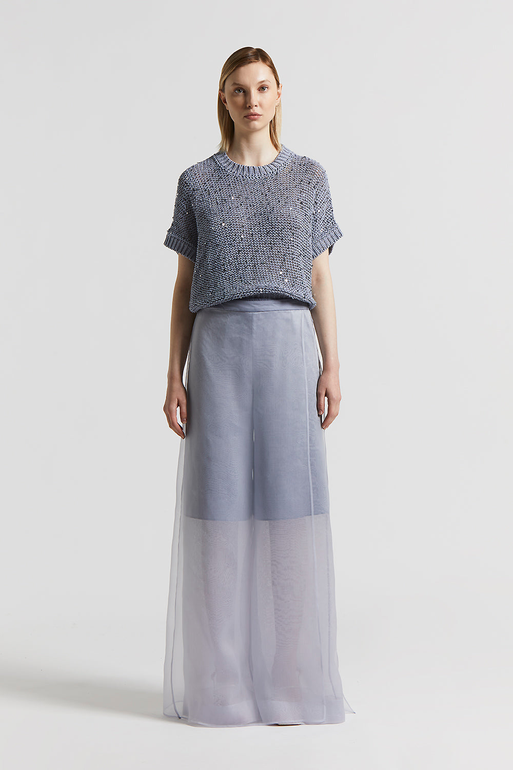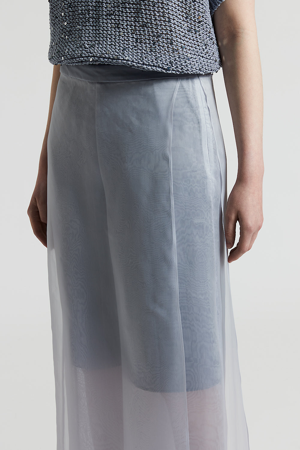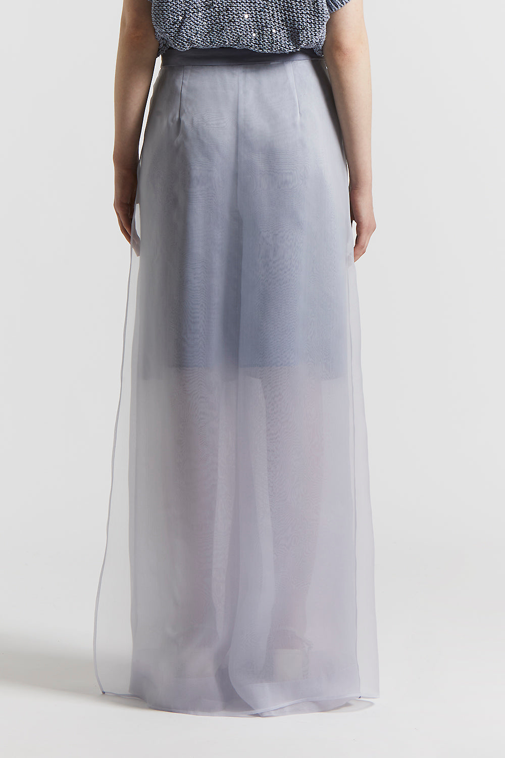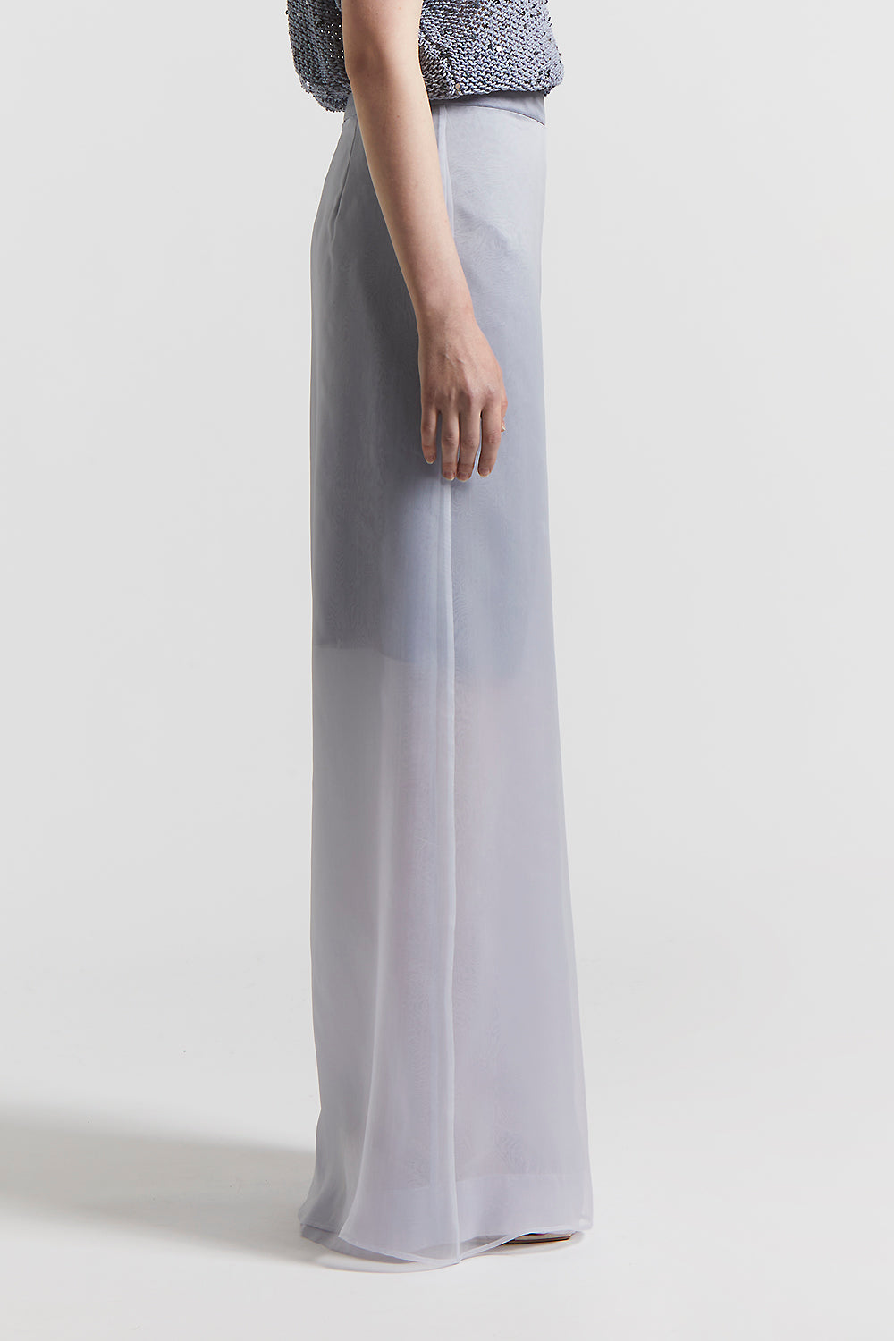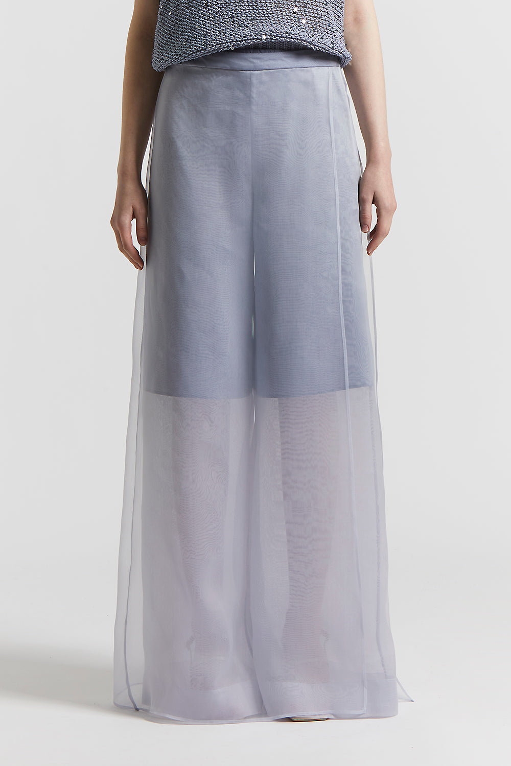 Unique palazzo trousers featuring a long panel that creates a skirt effect, in light technical silk organza.