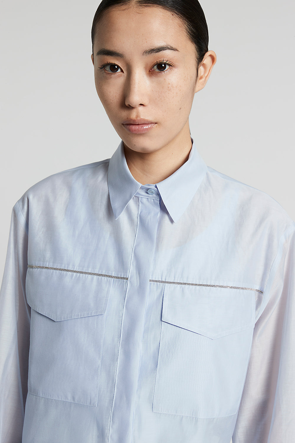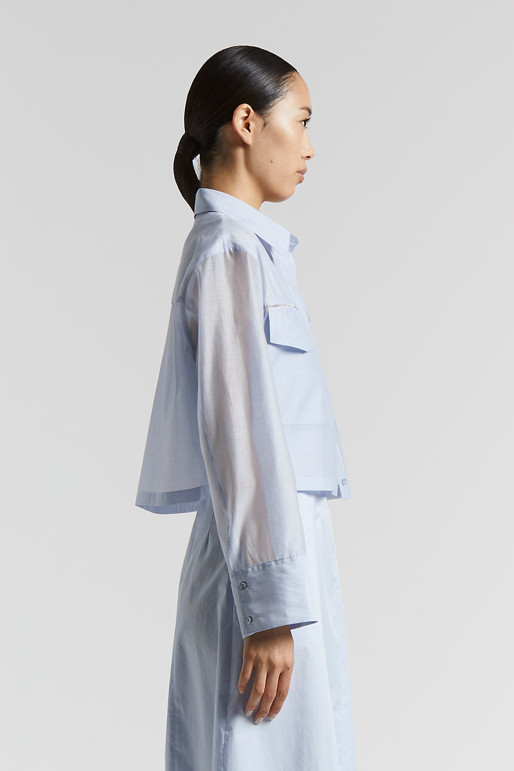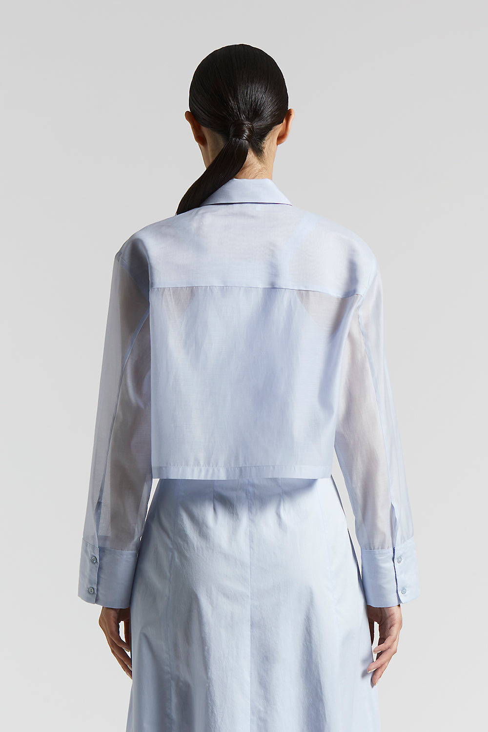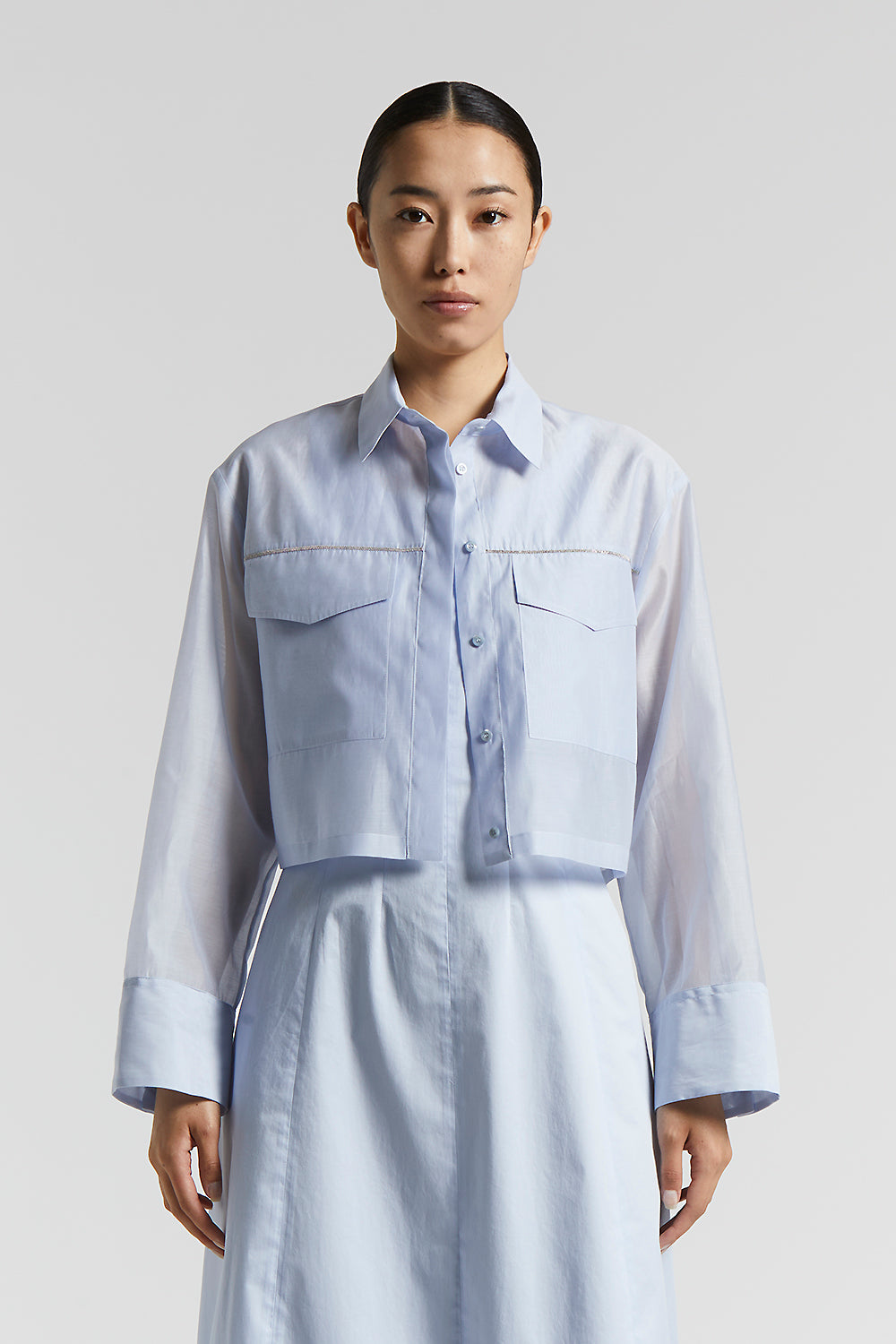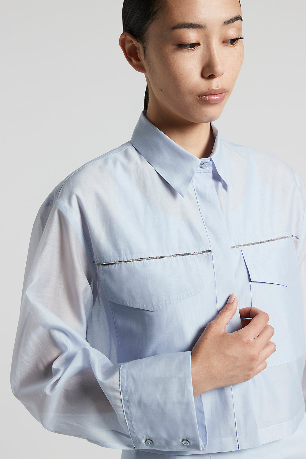 Made of matt cotton-silk organza, this shirt combines lightness and sophistication, embodying a contemporary style with an exclusive touch.