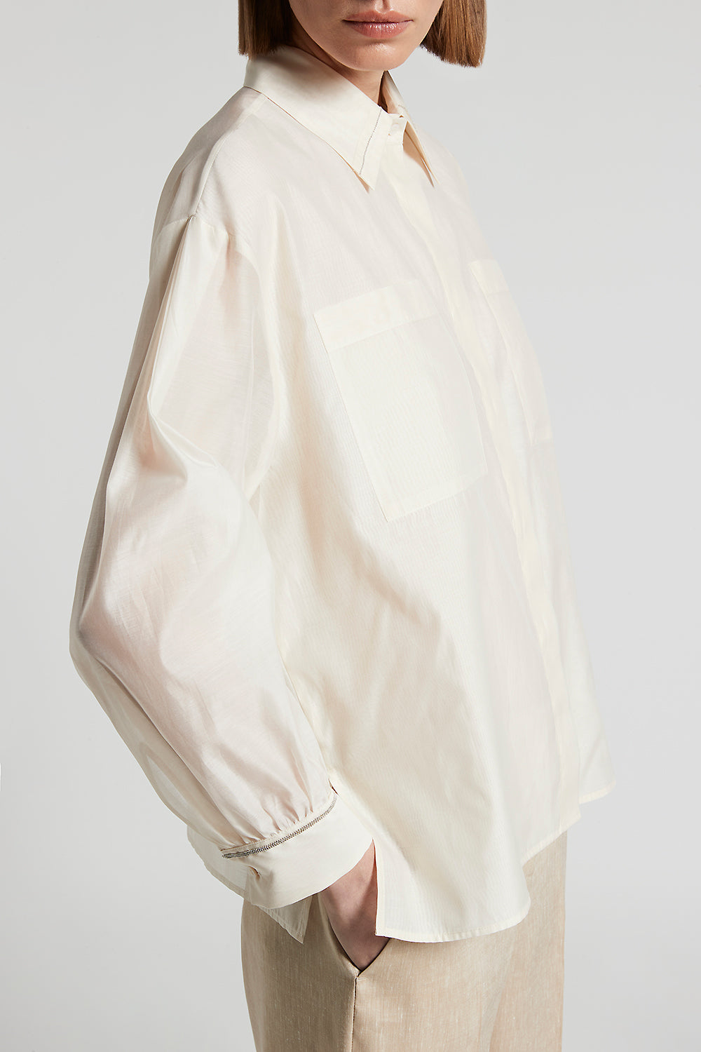 The Punto Luce detail on the cuffs adds a feminine touch, while the slits at the bottom add movement, giving a lightweight feel.