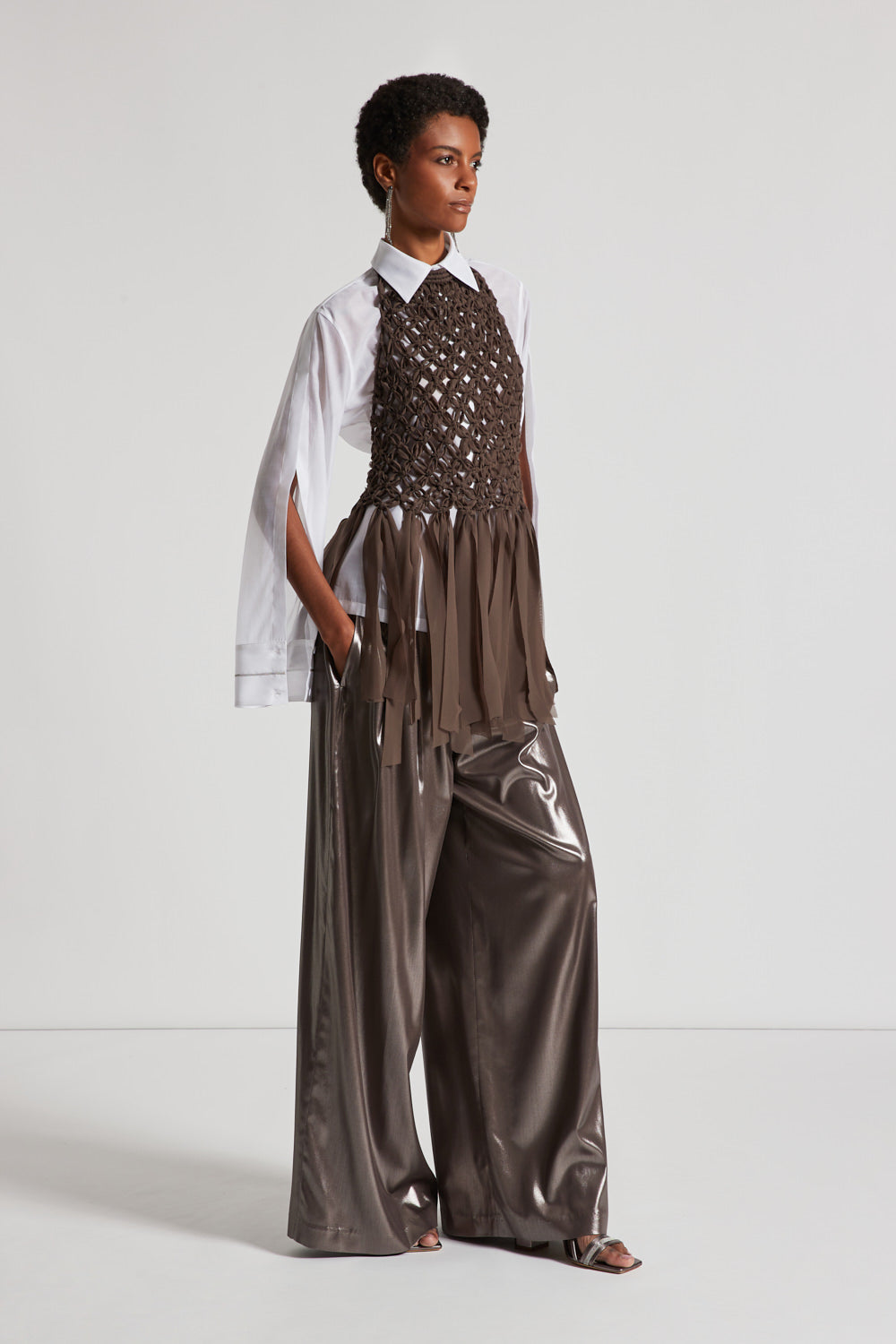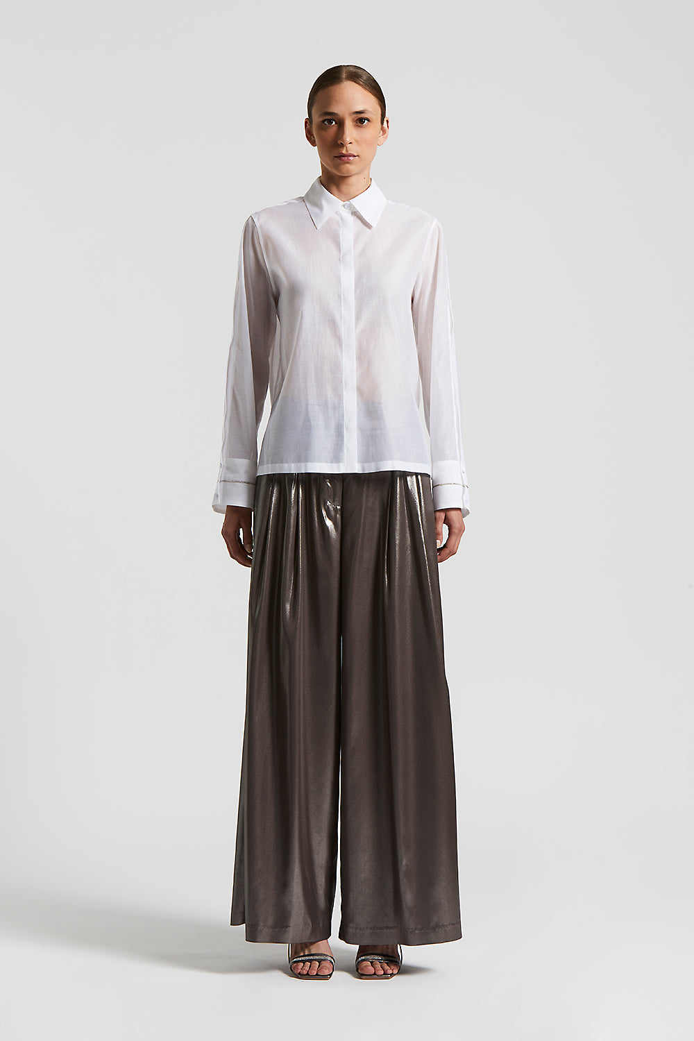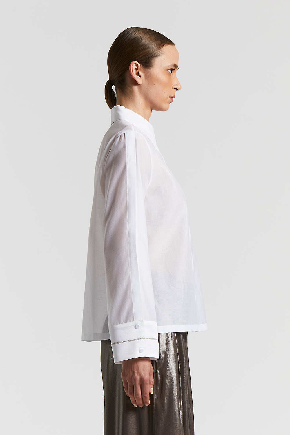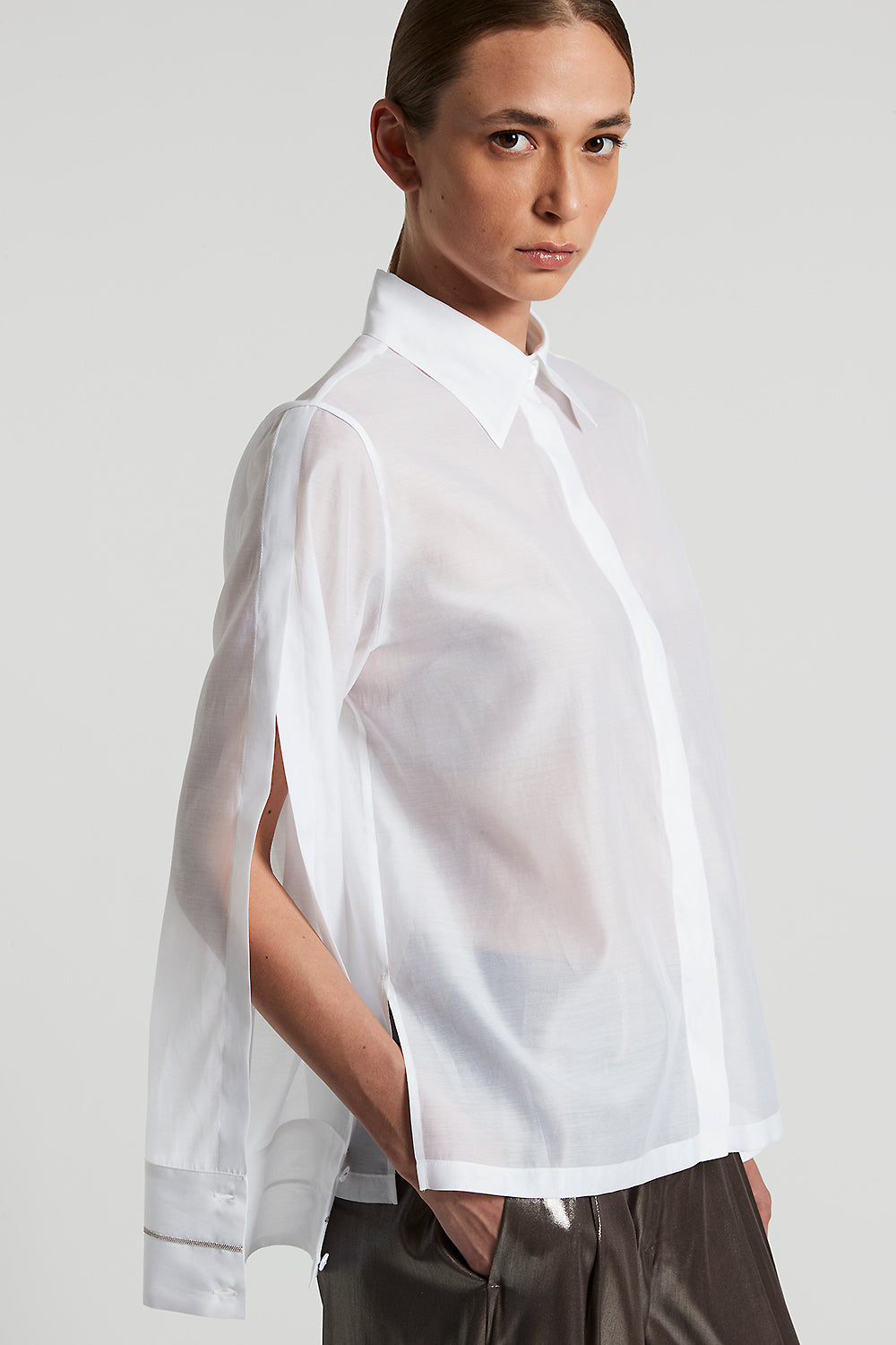 Made of cotton organza and matt silk, this shirt combines elegance and modernity. The light and opaque fabric offers a refined texture, while the wide long sleeves, with an opening at the top sleeve, add a bold touch.