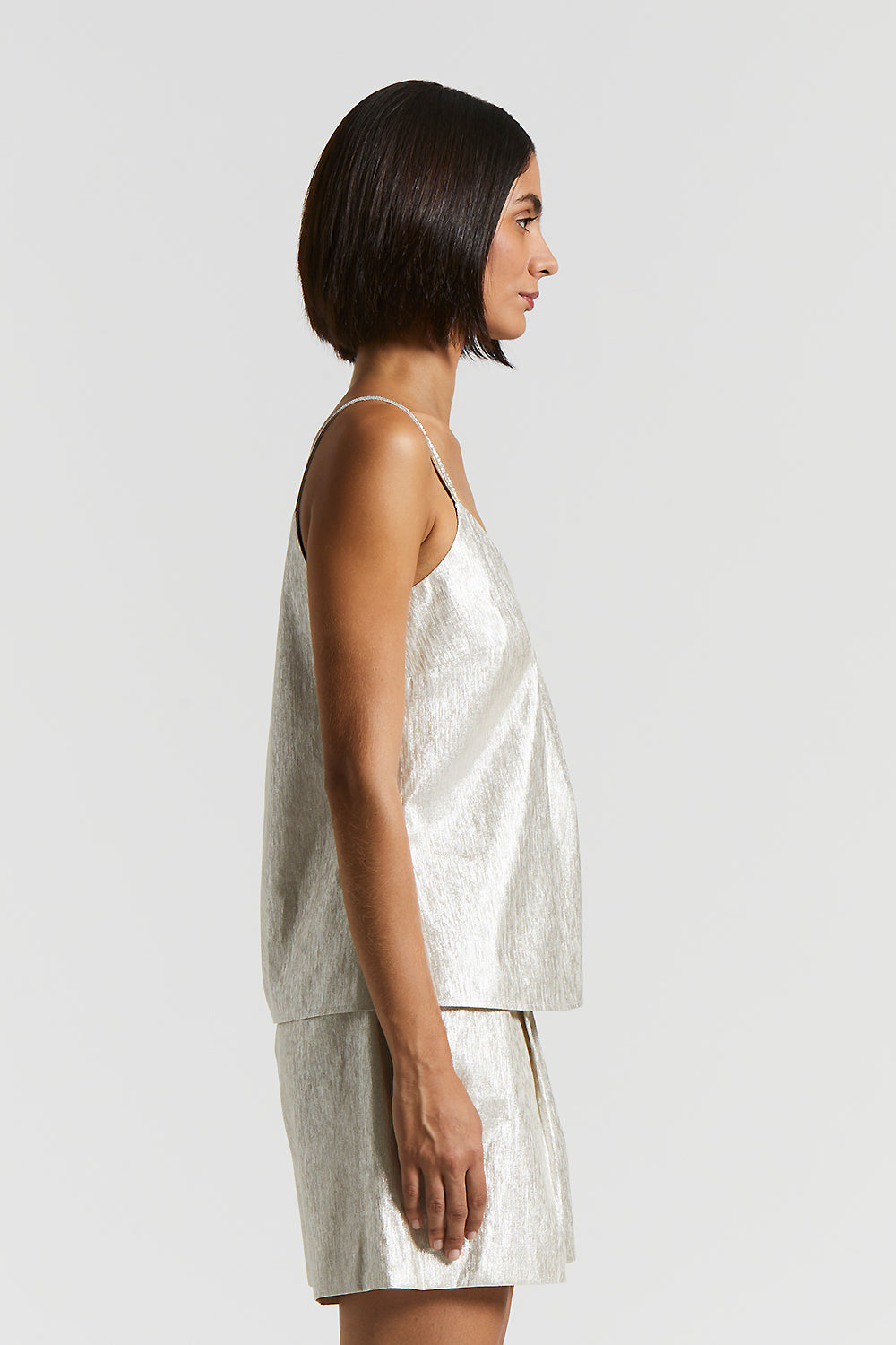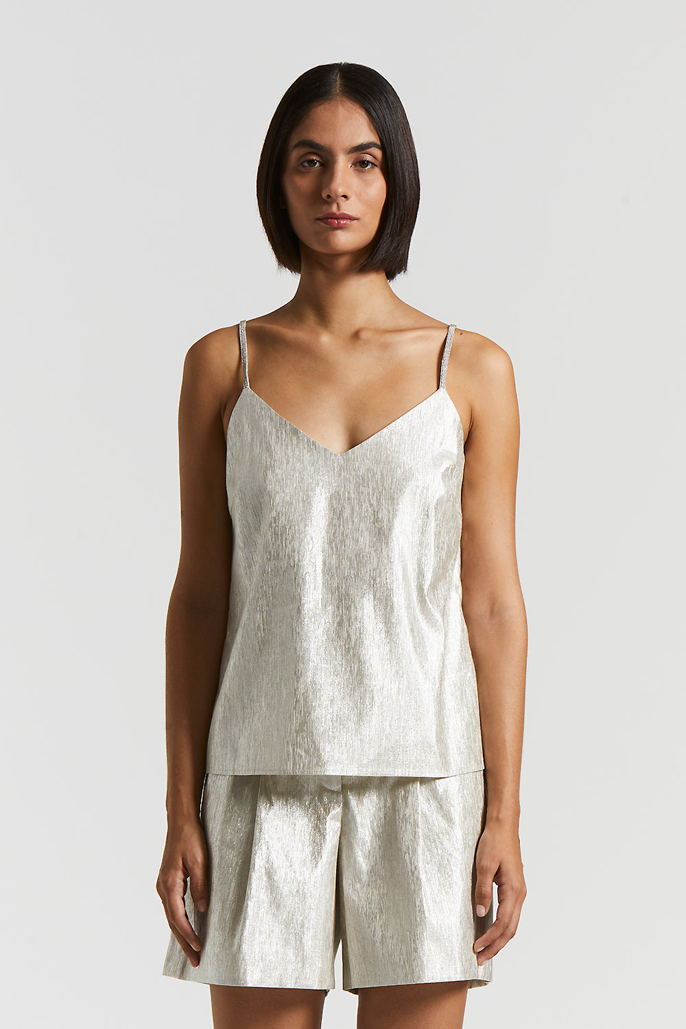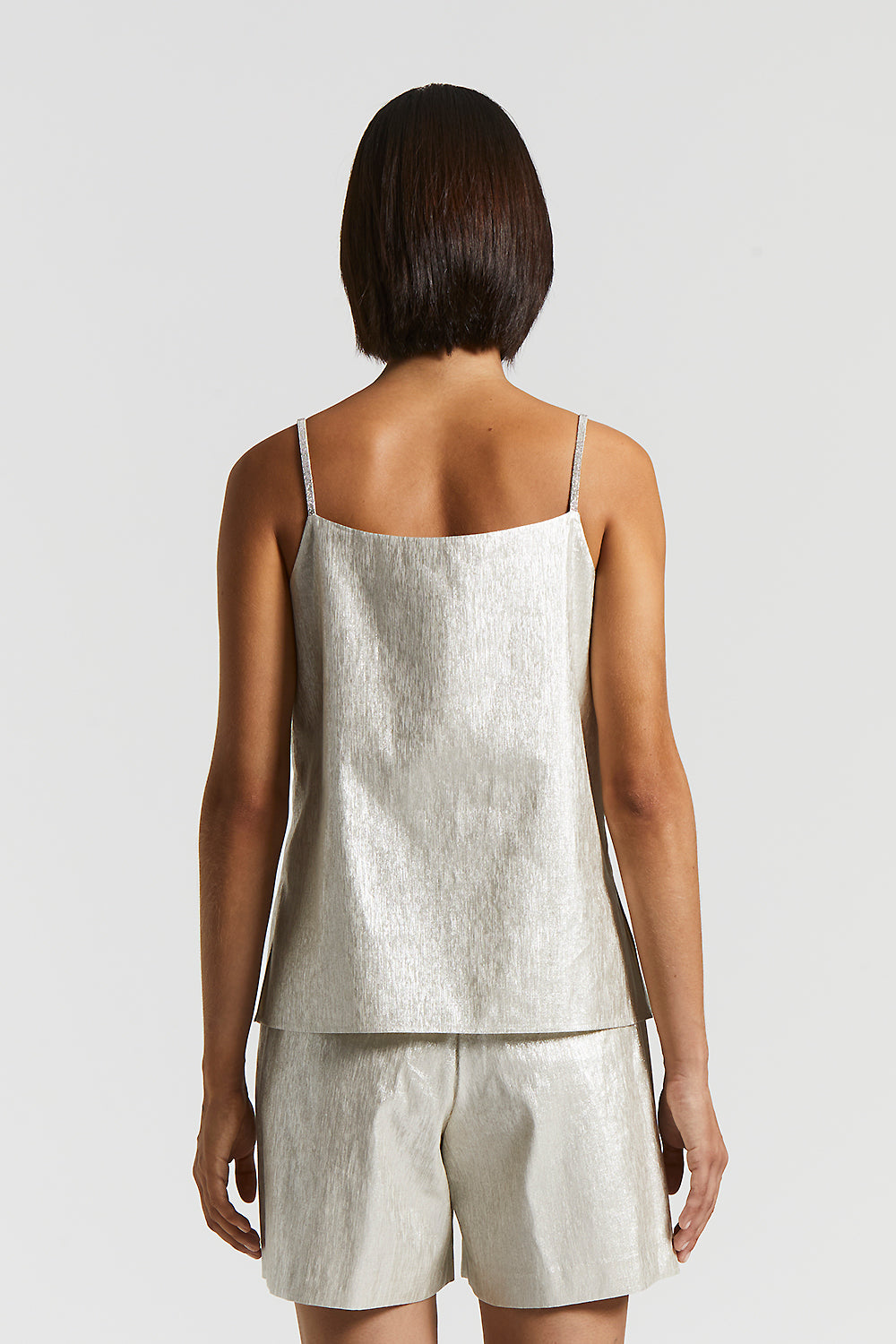 V-neck top in metallic-effect linen cotton, which highlights the look with a bright touch of sophistication.The narrow straps, embellished with delicate Punto Luce, add elegance, while the side slit…