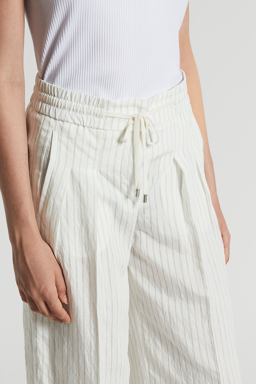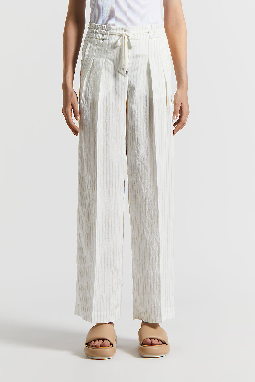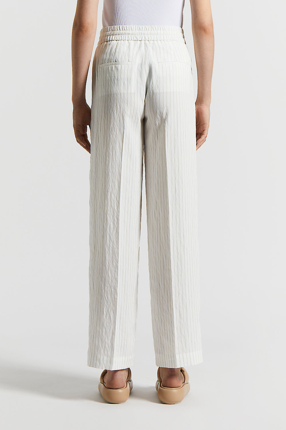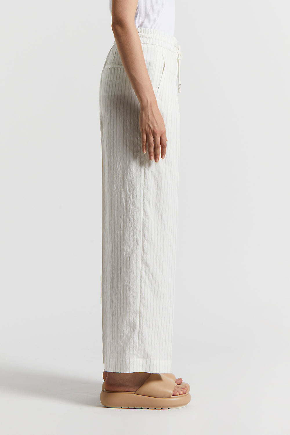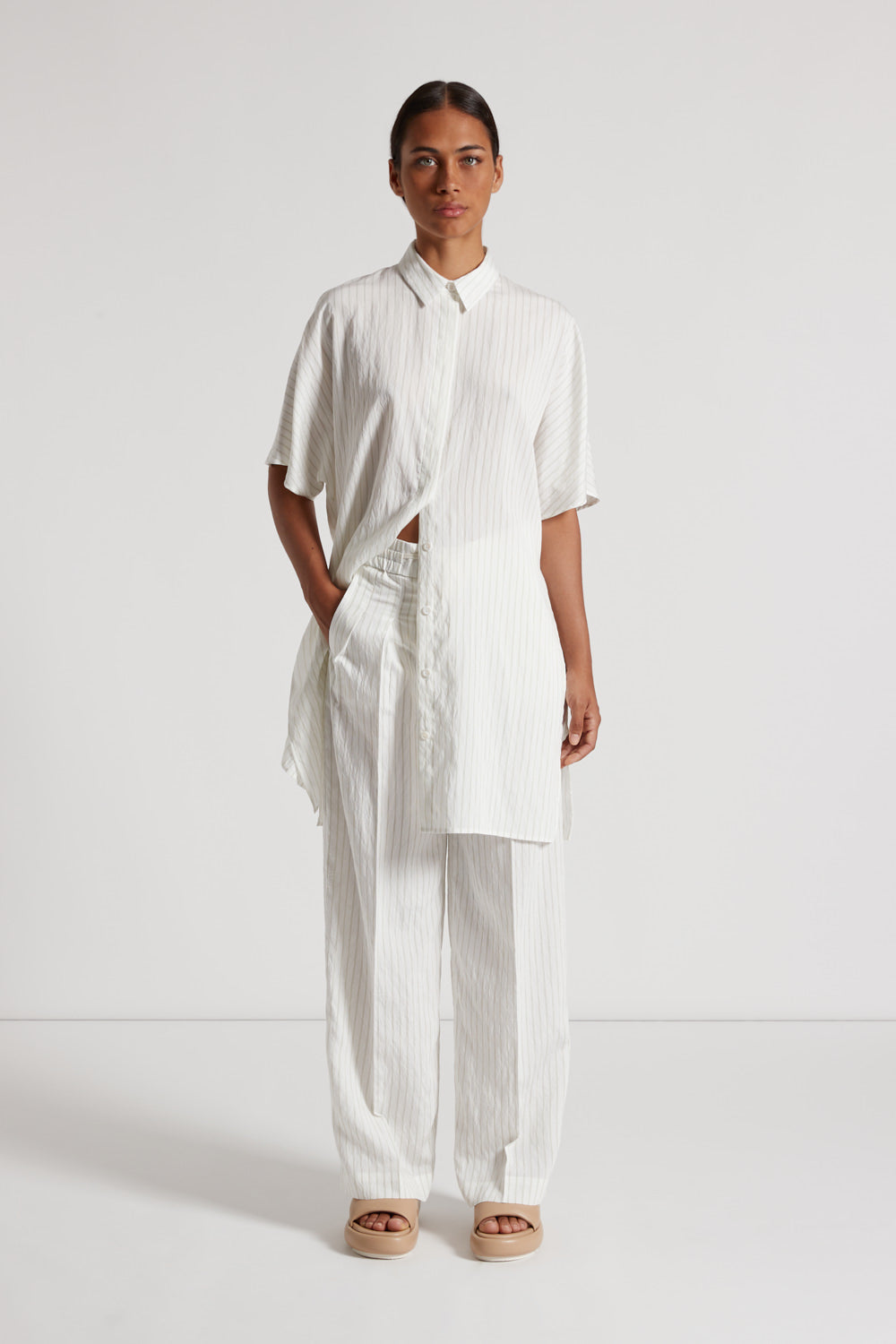 The lightness of fluid poplin meets the timeless appeal of chalk stripe in these sophisticated, relaxed trousers.Double pleats give volume and movement, while the elasticated side and back waist ensur…