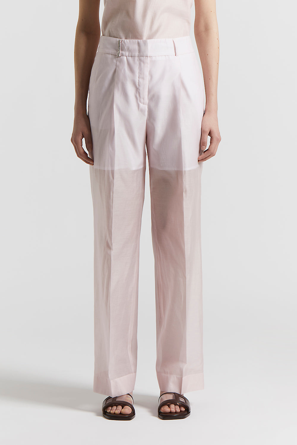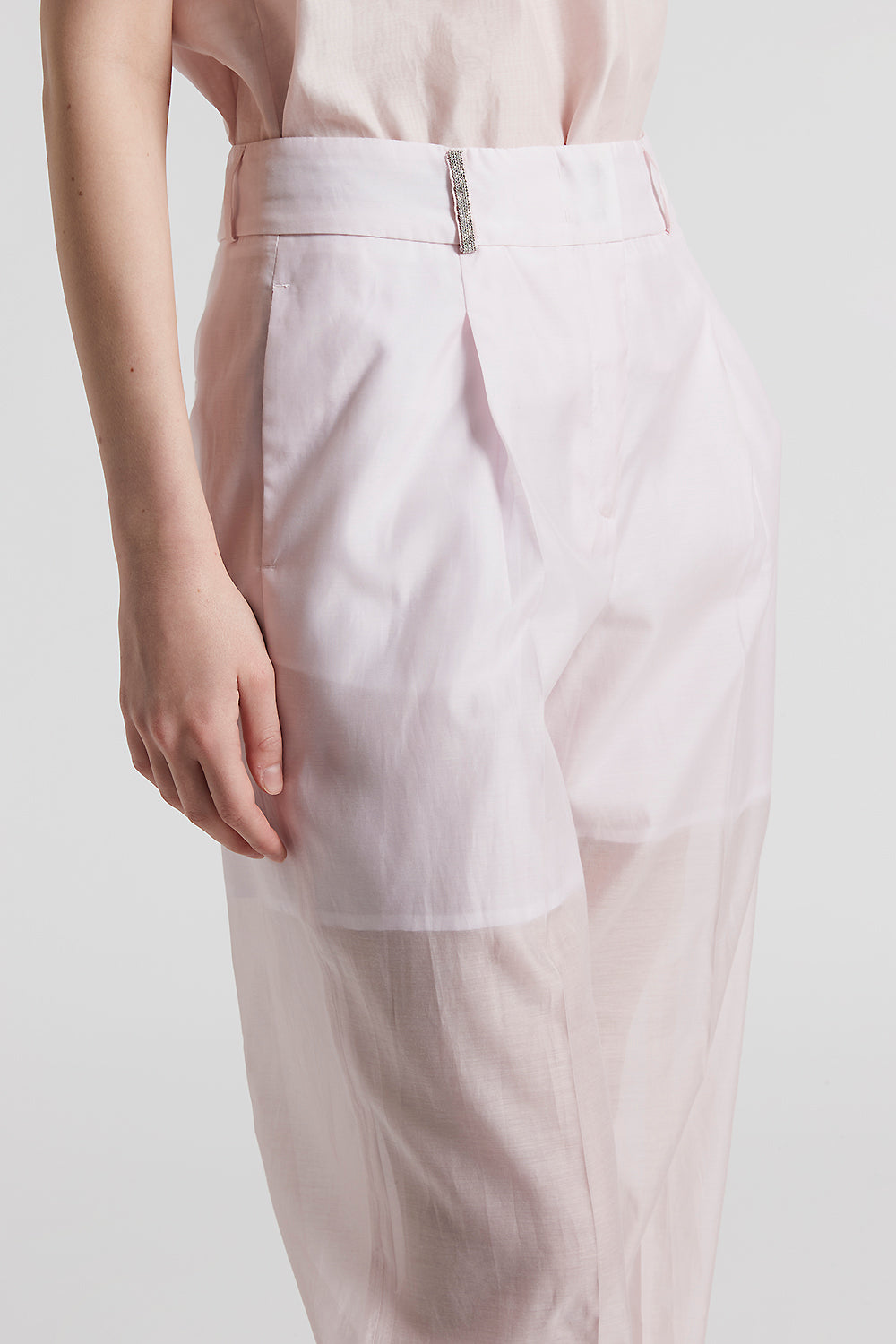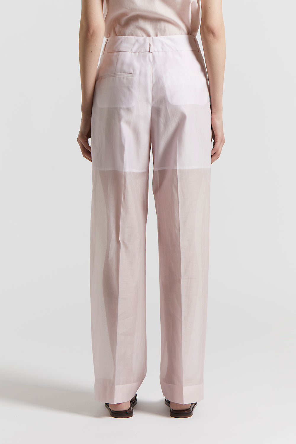 Trousers that embody lightness and elegance in opaque cotton and silk organza.