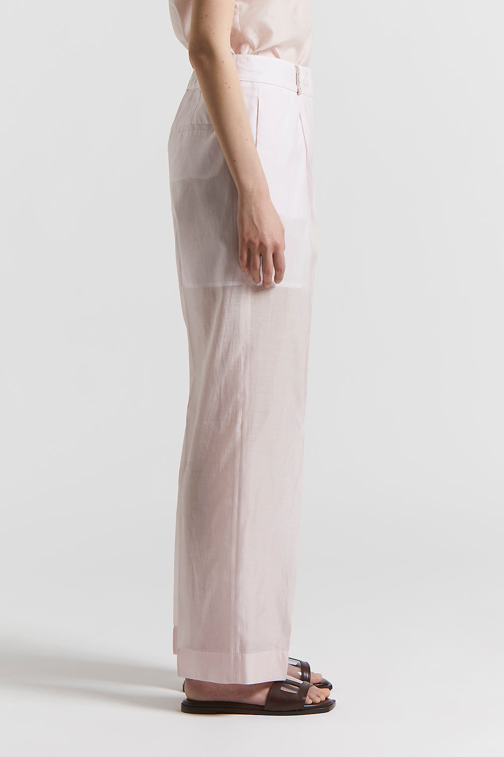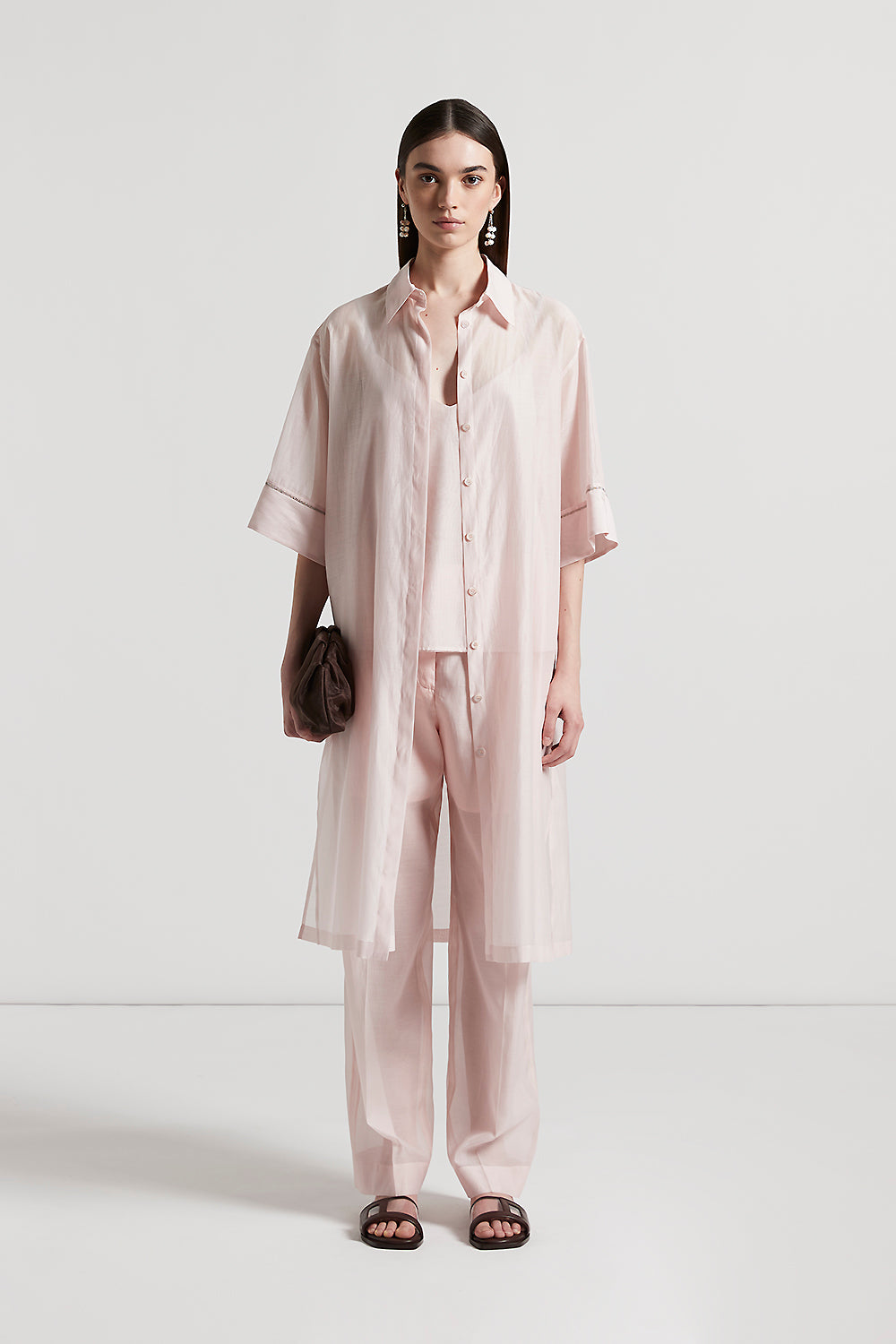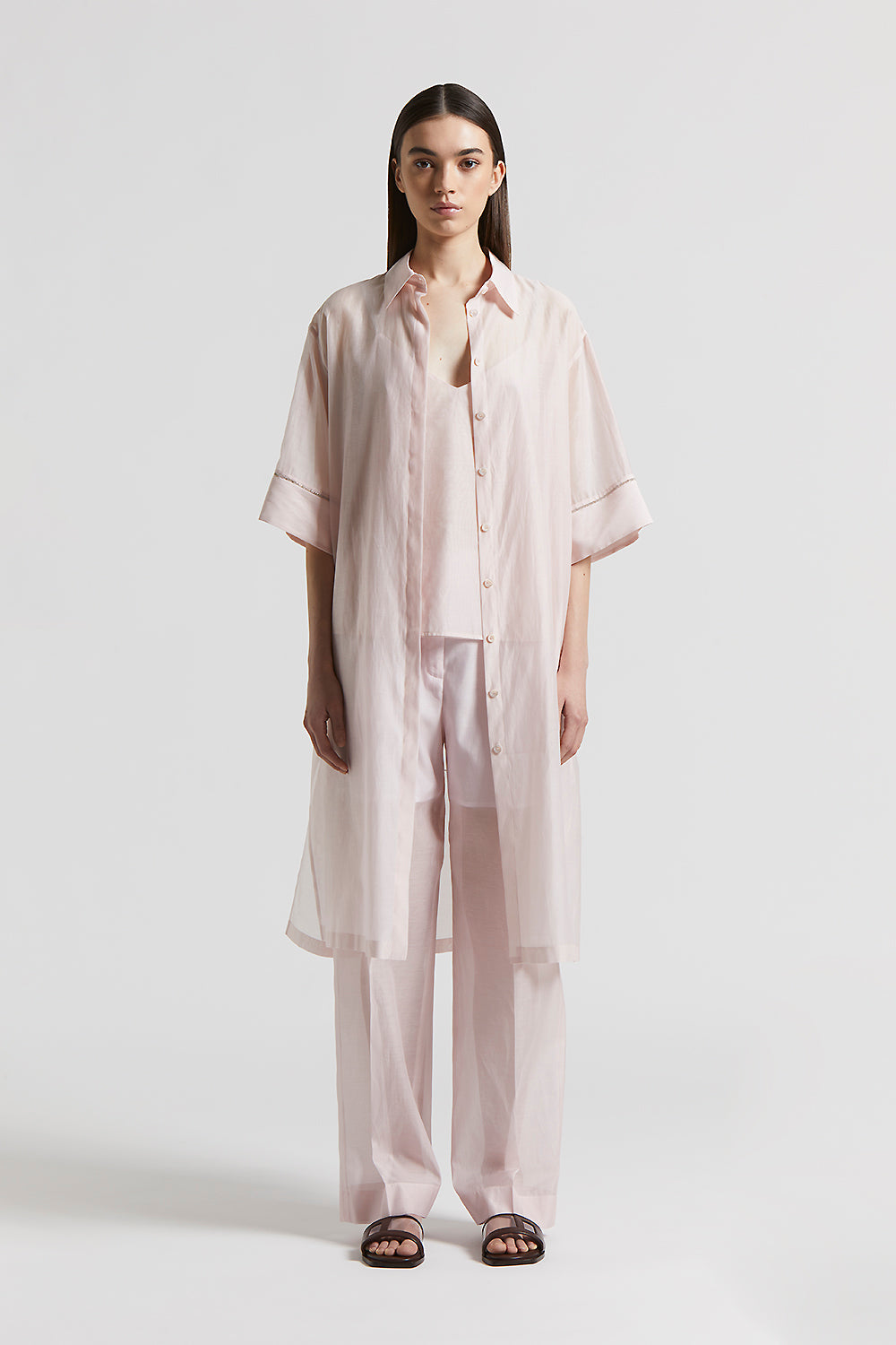Trousers that embody lightness and elegance in opaque cotton and silk organza.