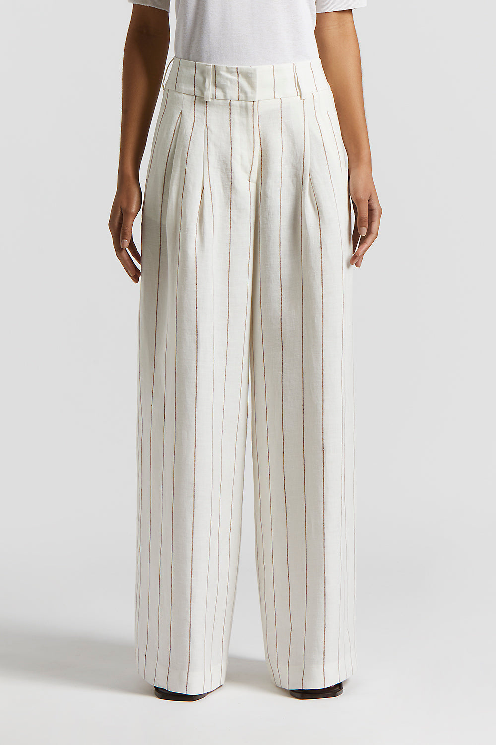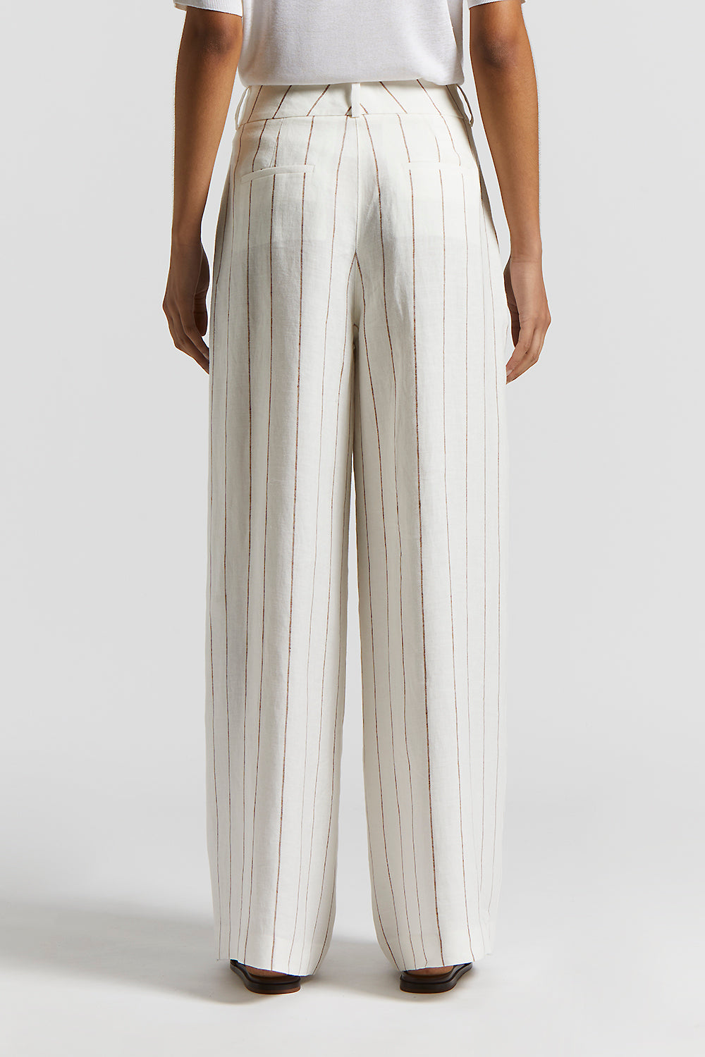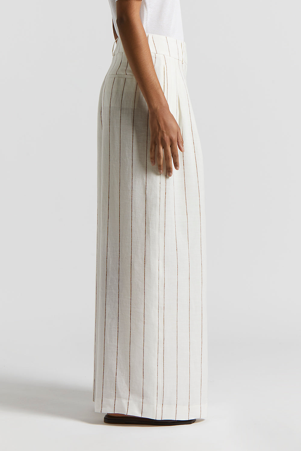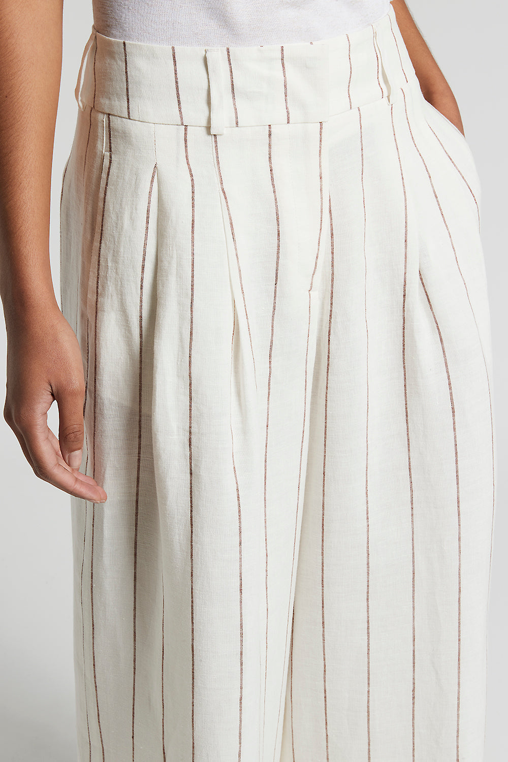A modern interpretation of the classic tailored trouser. With pleats at the front and generous lines, these pinstripe linen trouser stand apart for their light sophisticated texture.
